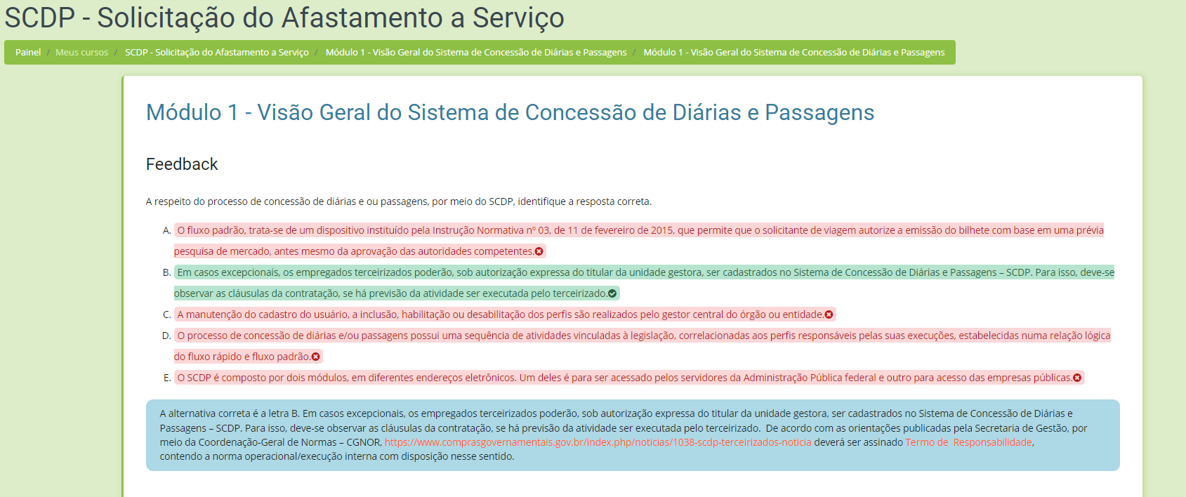 A. fluxo padrão, trata-se de um dispositivo instituído pela Instrução Normativa de 11 de fevereiro de 2015, que permite que solicitante de viagem autorize a emissão do bilhete com base em uma prévia pesquisa de mercado, antes mesmo da aprovação das autoridades competentes. B. Em casos excepcionais, os empregados terceirizados poderão, sob autorização expressa do titular da unidade gestora, ser cadastrados no Sistema de Concessão de Diárias e Passagens SCDP. Para isso, deve-se observar as cláusulas da contratação, se há previsão da atividade ser executada pelo terceirizado. C. A manutenção do cadastro do usuário, a inclusão, habilitação ou desabilitação dos perfis são realizados pelo gestor central do órgão ou D. processo de concessão de diárias e/ou passagens possui uma sequência de atividades vinculadas à correlacionadas aos perfis responsáveis pelas suas execuções, estabelecidas numa relação lógica do fluxo rápido e fluxo E. SCDP é composto por dois em diferentes endereços eletrônicos. Um deles é para ser acessado pelos servidores da Administração Pública federal e outro para acesso das empresas