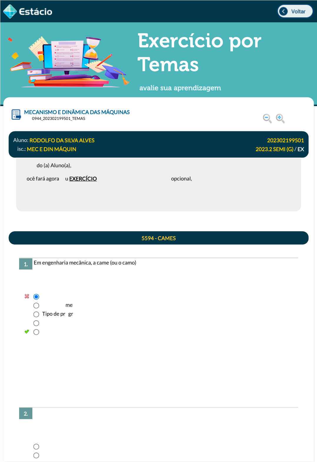 23/09/2023, 16:07 Estácio: Alunos https://simulado.estacio.br/alunos/ 1/6 Exercício por Temas avalie sua aprendizagem Em engenharia mecânica, a came (ou o camo) é uma peça de forma excêntrica e movimento circular (giratório) que compõe um conjunto mecânico com outra peça chamada de seguidor, cujo movimento é linear (retilíneo) alternado. Posição extrema critica (PEC) e percurso de movimento critico (PMC) são características de qual tipo de classi�cação dos cames? Em engenharia mecânica, a came (ou o camo) é uma peça de forma excêntrica e movimento circular (giratório) que compõe um conjunto mecânico com outra peça chamada de seguidor, cujo movimento é linear (retilíneo) alternado. Sobe‐desce (SD), sobe‐desce‐para (SDP) e sobe‐para‐desce‐para (SPDP) são características de qual tipo de classi�cação dos cames? MECANISMO E DINÂMICA DAS MÁQUINAS Lupa ARA0944_202302199501_TEMAS Aluno: RODOLFO DA SILVA ALVES Matr.: 202302199501 Disc.: MEC E DIN MÁQUIN 2023.2 SEMI (G) / EX Prezado (a) Aluno(a), Você fará agora seu EXERCÍCIO! Lembre-se que este exercício é opcional, mas não valerá ponto para sua avaliação. O mesmo será composto de questões de múltipla escolha. Após responde cada questão, você terá acesso ao gabarito comentado e/ou à explicação da mesma. Aproveite para se familiarizar com este modelo de questões que será usado na sua AV e AVS. 5594 - CAMES 1. Movimento do came Tipo de came Tipo de programa de movimentação Movimento do seguidor Tipo de movimento crítico Data Resp.: 23/09/2023 16:02:54 Explicação: Os cames podem ser divididos em duas categorias em relação ao tipo de movimento crítico: Posição Extrema Crítica (PEC) e Percurso de Movimento Crítico (PMC). 2. Tipo de came Movimento do seguidor javascript:voltar(); javascript:voltar(); javascript:voltar(); javascript:voltar(); javascript:diminui(); javascript:diminui(); javascript:aumenta(); javascript:aumenta(); 23/09/2023, 16:07 Estácio: Alunos https://simulado.estacio.br/alunos/ 2/6 Em engenharia mecânica, a came (ou o camo) é uma peça de forma excêntrica e movimento circular (giratório) que compõe um conjunto mecânico com outra peça chamada de seguidor, cujo movimento é linear (retilíneo) alternado. Came em que o seguidor comanda o came em vez de o came comandar o seguidor chama-se: Em engenharia mecânica, a came (ou o camo) é uma peça de forma excêntrica e movimento circular (giratório) que compõe um conjunto mecânico com outra peça chamada de seguidor, cujo movimento é linear (retilíneo) alternado. Seja a função de deslocamento do seguidor do came: Podemos a�rmar que para x=0 , pulso será: Tipo de movimento crítico Tipo de programa de movimentação Movimento do came Data Resp.: 23/09/2023 16:03:09 Explicação: Os programas de movimentação são Sobe-Desce (SD), Sobe-Desce-Para (SDP) e Sobe-Para-Desce-Para (SPDP). 3. Came invertido Came com seguidor radial Came cilíndrico Came com seguidor oscilante Came de retorno comandado Data Resp.: 23/09/2023 16:03:24 Explicação: Dependendo da aplicação, pode ser desejado que o papel do came e do seguidor seja invertido e dessa forma o seguidor que comanda o came. Essa troca de papeis tem aplicação, por exemplo, em máquinas de costura e outros equipamentos com mecanismos similares. Esse tipo de came é de�nido como came invertido. 4. 10 -8 12 7 24 Data Resp.: 23/09/2023 16:05:32 23/09/2023, 16:07 Estácio: Alunos https://simulado.estacio.br/alunos/ 3/6 Em engenharia mecânica, a came (ou o camo) é uma peça de forma excêntrica e movimento circular (giratório) que compõe um conjunto mecânico com outra peça chamada de seguidor, cujo movimento é linear (retilíneo) alternado. No projeto grá�co de excêntricos, para o came com seguidor radial: Em engenharia mecânica, a came (ou o camo) é uma peça de forma excêntrica e movimento circular (giratório) que compõe um conjunto mecânico com outra peça chamada de seguidor, cujo movimento é linear (retilíneo) alternado. Qual o tipo de came utilizado em molinetes de vara de pescaria? Explicação: 5. A primeira etapa no projeto grá�co do came com seguidor radial é girar o came e marcar os deslocamentos do seguidor As etapas de construção do seguidor de face plana e com rolete são semelhantes, sendo a única diferença que o contorno do came é tangente às diversas posições do rolete O ângulo entre a linha de centro do seguidor e a linha de ação é denominado ângulo de came. A linha de ação entre o came e o seguidor não necessariamente está na direção do eixo do seguidor Uma di�culdade no projeto é devido ao fato que o deslocamento do seguidor na subida é diferente da descida Data Resp.: 23/09/2023 16:06:17 Explicação: Uma di�culdade no projeto é devido ao fato que o deslocamento do seguidor na subida é diferente da descida. No came com seguidor radial, os deslocamentos tanto da subida quanto da descida são idênticos. A primeira etapa no projeto grá�co do came com seguidor radial é girar o came e marcar os deslocamentos do seguidor. A primeira etapa no projeto grá�co do came com seguidor radial é considerar o came estático e girar o seguidor ao redor do came, marcando os deslocamentos. A linha de ação entre o came e o seguidor não necessariamente está na direção do eixo do seguidor. A linha de ação entre o came e o seguidor não se encontra na direção do eixo do seguidor. As etapas de construção do seguidor de face plana e com rolete são semelhantes, sendo a única diferença que o contorno do came é tangente às diversas posições do rolete (CORRETA) O ângulo entre a linha de centro do seguidor e a linha de ação é denominado ângulo de came. O ângulo entre a linha de centro do seguidor e a linha de ação é denominado ângulo de pressão 6. 23/09/2023, 16:07 Estácio: Alunos https://simulado.estacio.br/alunos/ 4/6 Em engenharia mecânica, a came (ou o camo