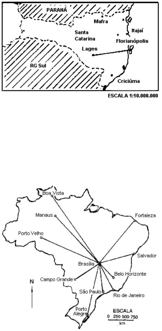 LISTA DE EXERCÍCIOS DE CARTOGRAFIA – ESCALA 1 - (UFPE) Utilizando o mapa, calcule a distância real, em linha reta, entre as cidades de Florianópolis e Lajes, sabendo que a distância gráfica é de 1,7cm: Assinale as afirmações verdadeiras e as afirmações falsas. a) 1.700 km; b) 170.000 m; c) 1.700.000 m; d) 170 km; e) 1.700 m. 2 - (UNB) O mapa do Brasil, ilustrado abaixo, contém linhas retas interligando Brasília a algumas capitais de Estados. Com base na leitura deste mapa e, também, nos conhecimentos de Coordenadas Geográficas e Fusos Horários, julgue os itens. a) Se a distância em linha reta de Brasília a Fortaleza é de 1 675 km, no mapa acima corresponde a aproximadamente 6,7 cm. b) No mapa do Brasil acima, cada cm corresponde a 750 km. c) O horário de Manaus está atrasado 1 (uma) hora em relação ao horário do Rio de Janeiro. d) Em razão da dimensão latitudinal, o Brasil possui 4 (quatro) fusos horários. e) Os 16 cm que aproximadamente, separam Boa Vista de Porto Alegre, passando por Brasília, correspondem à distância em linha reta de 4.000 km. 3 - (FESP) Um estudante de um determinado colégio pernambucano foi encarregado de estudar aspectos urbanos de um trecho da Região Metropolitana do Recife. O professor de Geografia, sabendo da importância da Cartografia para esse tipo de estudo, forneceu-lhe cinco mapas para que utilizasse aquele que iria apresentar um maior nível de detalhe. Se essa tarefa lhe fosse confiada, qual seria a escala do mapa que você escolheria? a) 1: 5.000.000 b) 1: 1.000.000 c) 1: 250.000 d) 1: 500.000 e) 1: 10.000 4 - (UFC-CE) Considere um mapa geográfico cuja escala é de 1:1 000 000, e a distância em linha reta entre duas cidades é de aproximadamente 7 cm. Assinale a alternativa que indica corretamente a distância real entre duas cidades. a) 700 km. b) 70 km. c) 7 km. d) 7 000 km. e) 170 km. 5 - PUC – Campinas 2003 6 - U. Passo Fundo-RS (2004) Analisando um mapa temático cuja escala é de 1/1.000.000 e a distância, em linha reta, entre duas cidades é de, aproximadamente, 8 cm, a alternativa que indica, corretamente, a distância real entre as duas cidades é: a) 80 km b) 8 km c) 800 km d) 8.000 km e) 180 km 7 - (FMU) Em um mapa cuja escala é 1:2.500.000, duas cidades estão separadas, em linha reta, por 5 centímetros. A distância real (no terreno) entre essas duas cidades é a) 50 km b) 75 km c) 125 km d) 500 km e) 1.250 km 8 - (UFRN) Uma cidade está localizada a 5cm de outra, medidos sobre um mapa de escala 1:200.000. Desprezando as distorções normais de uma projeção, marque a opção que indica a distância real (no terreno) entre as cidades. a) 5km b) 100km c) 10km d) 50km 9 - (PUC-RS) Ao elaborar um roteiro turístico de Gramado, um estudante deveria inserir no prospecto mapas do RS e do município, em escalas diferentes, com o objetivo não só de situar o turista como também de permitirlhe identificar os pontos turísticos específicos. O aluno elaborou o mapa do RS em uma escala pequena e o do município em uma escala média, adotando, respectivamente, a) b) c) d) e) 10 - (PUC-PR) A distância de 7 cm, medida em um mapa de escala numérica 1:2 500 000, corresponde em quilômetros na superfície da Terra a um comprimento real de: a) 225 b) 17 500 c) 1 750 d) 175 e) 185 11 - (PUC-RS) Com Base no mapa abaixo: A distância gráfica entre as cidades de São Paulo e Porto Alegre, em linha reta, é de 2cm. A distância gráfica entre esses mesmos locais, em uma escala de 1:20.000.000, é de a) 2,2 cm b) 4,4 cm c) 0,22 cm d) 0,44 cm e) 4,2 cm 12 - (UFAC)Observe os mapas abaixo e, em seguida, analise os quesitos, marcando a afirmativa que julgar CORRETA. I. Os dois são mapas políticos e estão representados na mesma escala. II. A distância gráfica entre dois pontos no mapa 2 é maior que a distância entre esses mesmos pontos no mapa 1. III. A escala do mapa 1 é maior que a escala do mapa 2. IV. O denominador da escala do mapa 2 é maior, pois está mais reduzido. V. Nas duas escalas, um centímetro do mapa corresponde à mesma quantidade de quilômetros na área real. A análise das afirmativas relacionadas aos mapas permite concluir que está CORRETA a alternativa: A) I, II e III B) II e III C) III e IV D) III, IV e V E) IV e V 13 - A escala numérica é um dos principais e indispensáveis componentes de um mapa. Sem escala, o mapa não tem valor geográfico. Vamos supor que você foi encarregado de realizar um estudo sobre a estrutura fundiária do Piauí. Para essa tarefa, lhe foram fornecidos cinco mapas em escalas diversas. Assinale aquela que fornece um maior nível de detalhe. A) 1: 1.000.000 B) 1: 500.000 C) 1: 600.000 D) 1: 2.500.000 E) 1: 250.000 14 - (PUC-RS) Ao representar cartograficamente uma cidade cuja avenida central tem extensão equivalente a 25km, aventou-se a possibilidade de utilizar uma escala cartográfica de 1:20.000. Se essa possibilidade for efetivada, é CORRETO concluir que A) o comprimento da avenida na planta da cidade será maior que um metro, impossibilitando a representação cartográfica em uma folha de caderno escolar. B) a escala não condiz com esse tipo de representação, pois é extremamente pequena para demonstrar as características de uma cidade. C) as distâncias entre as quadras, na referida avenida, serão quase imperceptíveis na planta, porque na avenida representada existe um cruzamento a cada 2,5km. D) só será possível representar a cidade nesta escala se a projeção cartográfica da planta for azimutal equidistante. E) para que a planta da cidade represente uma leitura cartográfica de tamanho ideal, a escala utilizada terá que ser menor que 1:1.000.000. 15 - Dois amigos decidem fazer uma caminhada de 1500 metros por uma trilha ecológica. Ao planejarem tal passeio a partir de um mapa do parque, perceberam que a distância no mapa acusava 7,5 cm. A escala numérica do mapa CORRETA é A) 1:200 B) 1:2000 C) 1:20000 D) 1:200000 E) 1:2000000 16 - O gru