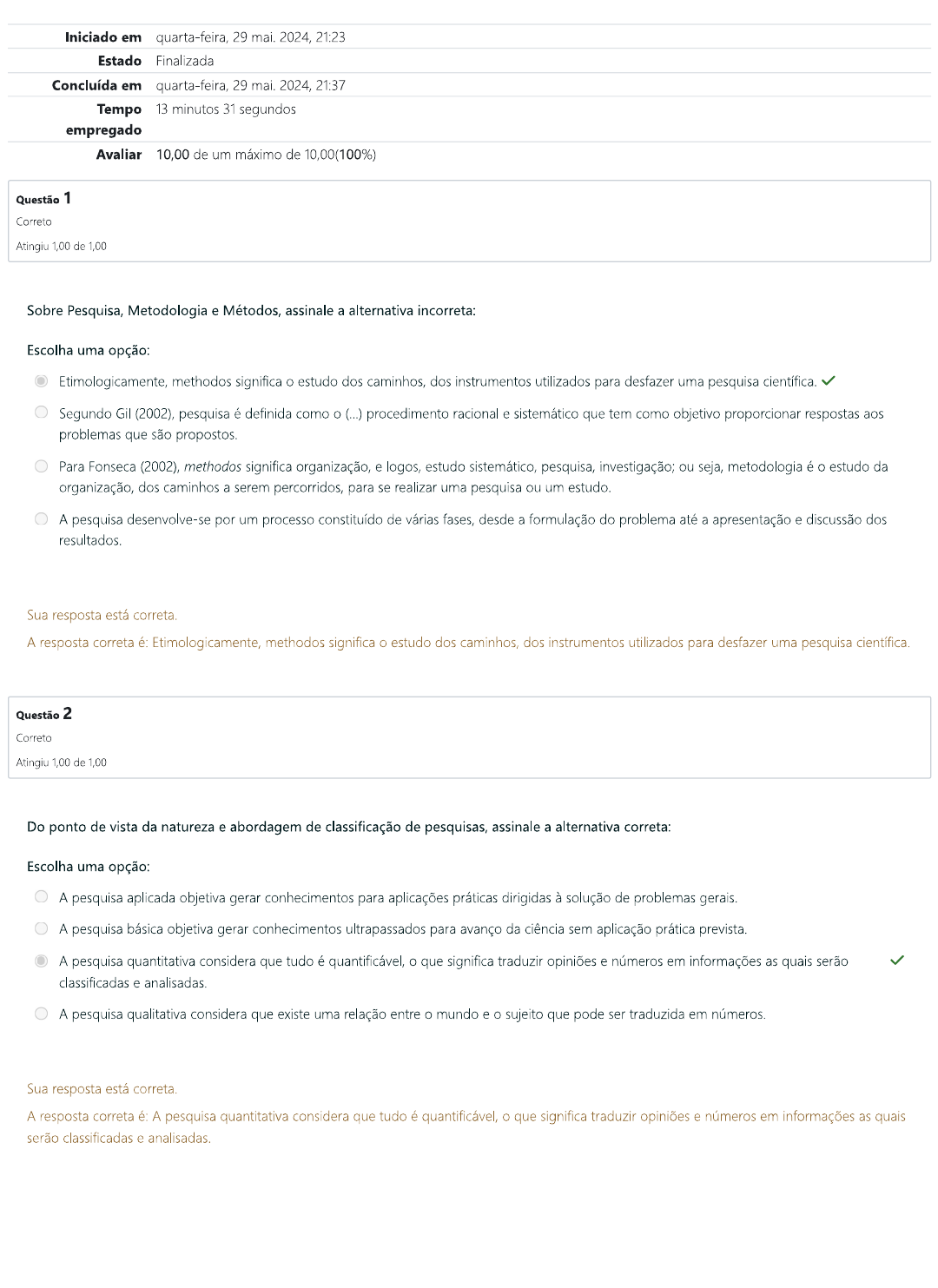 <p>Iniciado em quarta-feira, 29 2024, 21:23 Estado Finalizada Concluída em quarta-feira, 29 mai. 2024, 21:37 Tempo 13 minutos 31 segundos empregado Avaliar 10,00 de um máximo de 10,00(100%) Questão 1 Correto Atingiu 1,00 de 1,00 Sobre Pesquisa, Metodologia e Métodos, assinale a alternativa incorreta: Escolha uma opção: Etimologicamente, methodos significa estudo dos caminhos, dos instrumentos utilizados para desfazer uma pesquisa científica. Segundo Gil (2002), pesquisa é definida como (...) procedimento racional e sistemático que tem como objetivo proporcionar respostas aos problemas que são propostos. Para Fonseca (2002), methodos significa organização, e logos, estudo sistemático, pesquisa, investigação; ou seja, metodologia é estudo da organização, dos caminhos a serem percorridos, para se realizar uma pesquisa ou um estudo. A pesquisa desenvolve-se por um processo constituído de várias fases, desde a formulação do problema até a apresentação e discussão dos resultados. Sua resposta está correta. A resposta correta é: Etimologicamente, methodos significa estudo dos caminhos, dos instrumentos utilizados para desfazer uma pesquisa científica. Questão 2 Correto Atingiu 1,00 de 1,00 Do ponto de vista da natureza e abordagem de classificação de pesquisas, assinale a alternativa correta: Escolha uma opção: A pesquisa aplicada objetiva gerar conhecimentos para aplicações práticas dirigidas à solução de problemas gerais. A pesquisa básica objetiva gerar conhecimentos ultrapassados para da ciência sem aplicação prática prevista. A pesquisa quantitativa considera que tudo é quantificável, que significa traduzir opiniões e números em informações as quais serão classificadas e analisadas. A pesquisa qualitativa considera que existe uma relação entre mundo e sujeito que pode ser traduzida em números. Sua resposta está correta. A resposta correta é: A pesquisa quantitativa considera que tudo é quantificável, que significa traduzir opiniões e números em informações as quais serão classificadas e analisadas.</p><p>Questão 3 Correto Atingiu 1,00 de 1,00 A respeito do ponto de vista dos procedimentos técnicos, assinale a alternativa incorreta: Escolha uma opção: No estudo de caso ocorre estudo profundo e exaustivo de um ou poucos objetos de maneira que se permita amplo e detalhado conhecimento. A pesquisa documental é elaborada a partir de material que não recebeu tratamento analítico. A pesquisa experimental é a que se determina vários objetos de estudo, selecionam-se variáveis que influenciam, definem-se as formas de controle e de observação dos efeitos que as variáveis produzem no objeto. A pesquisa bibliográfica é elaborada a partir de material já publicado, como livros, artigos, periódicos, Internet, etc. Sua resposta está correta. A resposta correta é: A pesquisa experimental é a que se determina vários objetos de estudo, selecionam-se variáveis que O influenciam, definem-se as formas de controle e de observação dos efeitos que as variáveis produzem no objeto. Questão 4 Correto Atingiu 1,00 de 1,00 Assinale a alternativa incorreta no que se refere ao conceito de hipótese: Escolha uma opção: Compatível com conhecimento científico e revela consistência lógica Apresenta caráter explicativo Incapaz de permitir verificação empírica Formulado como solução provisória para um problema Sua resposta está correta. A resposta correta é: Incapaz de permitir verificação empírica</p><p>Questão 5 Correto Atingiu 1,00 de 1,00 Sobre metodologia, assinale a alternativa correta: Escolha uma opção: Segundo Minayo (2007) metodologia é como a apresentação adequada e justificada dos métodos, técnicas e dos instrumentos operativos que não precisam ser utilizados para as buscas relativas às indagações da investigação. Segundo Minayo (2007) metodologia é a discussão epistemológica sobre "caminho do pensamento" que tema ou objeto de investigação não requer. Segundo Minayo (2007) metodologia é como a "criatividade do pesquisador ou seja, a sua marca pessoal e específica na forma de articular teoria, métodos, achados experimentais e observacionais. A metodologia vai além da descrição dos procedimentos (métodos e técnicas a serem utilizados na pesquisa), mas não indica a escolha teórica realizada pelo pesquisador para abordar objeto de estudo Sua resposta está correta. A resposta correta é: Segundo Minayo (2007) metodologia é como a "criatividade do pesquisador", ou seja, a sua marca pessoal e específica na forma de articular teoria, métodos, achados experimentais e observacionais. Questão 6 Correto Atingiu 1,00 de 1,00 Sobre conhecimento, assinale a alternativa incorreta: Escolha uma opção: De acordo com Fonseca (2002) (...) homem é, por natureza, um animal curioso. Desde que nasce interage com a natureza e os objetos à sua volta, interpretando universo a partir das referências sociais e culturais do meio em que vive. conhecimento humano é na sua essência um esforço para resolver contradições, entre as representações do objeto e a realidade do mesmo. homem se desapropria do conhecimento por meio das sensações, que os seres e os fenômenos lhe conhecimento, dependendo da forma pela qual se chega a essa representação, pode ser classificado de popular (senso comum), teológico, mítico, filosófico e científico Sua resposta está correta. A resposta correta é: O homem se desapropria do conhecimento por meio das sensações, que os seres e os fenômenos lhe transmitem.</p><p>Questão 7 Correto Atingiu 1,00 de 1,00 Sobre métodos científicos, assinale a alternativa incorreta: Escolha uma opção: No método hipotético-dedutivo se conhecimento é insuficiente para explicar um fenômeno, surge problema; para expressar as dificuldades do problema são formuladas hipóteses; das hipóteses deduzem-se consequências a serem testadas ou falseadas. No método indutivo a gene