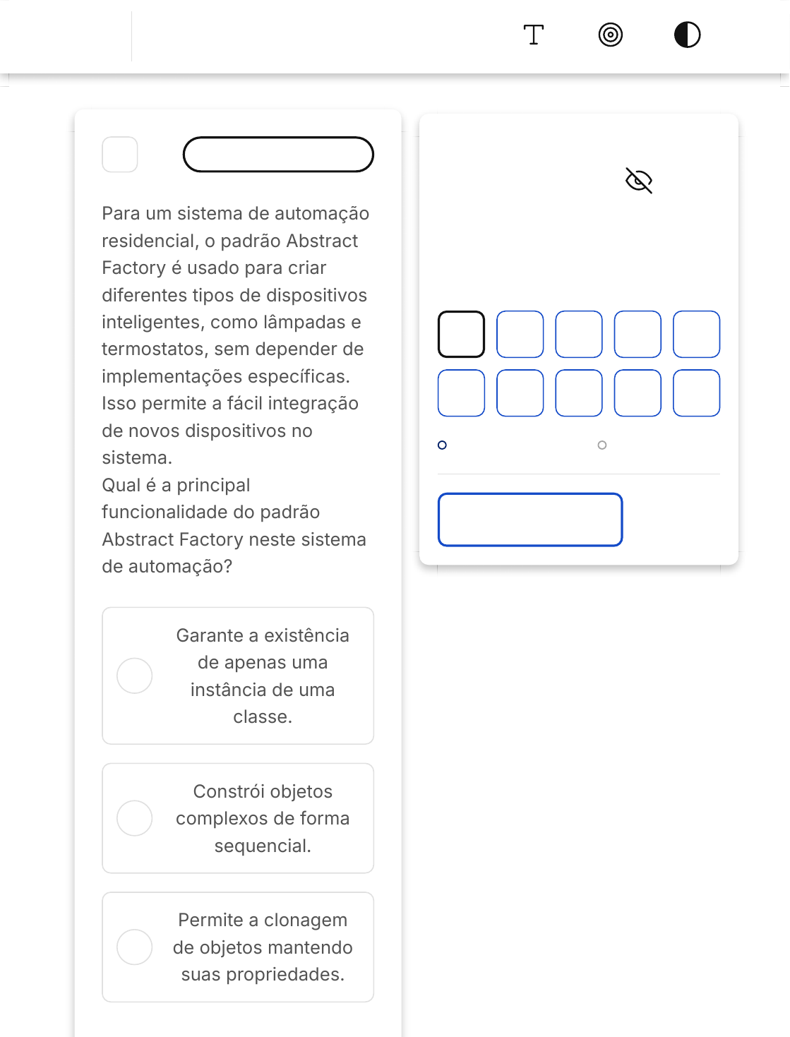 <p>01/10/24, 19:18</p><p>Page 1 of 11https://estacio.saladeavaliacoes.com.br/prova/66fc718aaf5dd981681b7d94/</p><p>A</p><p>B</p><p>C</p><p>1 Marcar para revisão</p><p>Para um sistema de automação</p><p>residencial, o padrão Abstract</p><p>Factory é usado para criar</p><p>diferentes tipos de dispositivos</p><p>inteligentes, como lâmpadas e</p><p>termostatos, sem depender de</p><p>implementações específicas.</p><p>Isso permite a fácil integração</p><p>de novos dispositivos no</p><p>sistema.</p><p>Qual é a principal</p><p>funcionalidade do padrão</p><p>Abstract Factory neste sistema</p><p>de automação?</p><p>Garante a existência</p><p>de apenas uma</p><p>instância de uma</p><p>classe.</p><p>Constrói objetos</p><p>complexos de forma</p><p>sequencial.</p><p>Permite a clonagem</p><p>de objetos mantendo</p><p>suas propriedades.</p><p>00</p><p>hora</p><p>: 35</p><p>min</p><p>: 36</p><p>seg</p><p>Ocultar</p><p>Questão 1 de 10</p><p>Respondidas (10) Em branco (0)</p><p>Finalizar prova</p><p>1 2 3 4 5</p><p>6 7 8 9 10</p><p>Nc</p><p>Padrões De Projetos De Software Com</p><p>Java</p><p>01/10/24, 19:18</p><p>Page 2 of 11https://estacio.saladeavaliacoes.com.br/prova/66fc718aaf5dd981681b7d94/</p><p>D</p><p>E</p><p>A</p><p>B</p><p>C</p><p>Cria famílias de</p><p>objetos sem</p><p>especificar suas</p><p>classes concretas.</p><p>Centraliza a gestão de</p><p>operações de vários</p><p>objetos.</p><p>2 Marcar para revisão</p><p>Analise o propósito a seguir:</p><p>"Garantir que uma classe</p><p>somente tenha uma instância</p><p>em um processo de execução,</p><p>fornecendo uma forma de</p><p>acesso a essa única instância e</p><p>impedindo que outros módulos</p><p>possam ter acesso a seu</p><p>construtor".</p><p>Assinale a alternativa com o</p><p>nome do padrão que possui</p><p>esse propósito.</p><p>Abstract Factory</p><p>Factory Method</p><p>Singleton</p><p>01/10/24, 19:18</p><p>Page 3 of 11https://estacio.saladeavaliacoes.com.br/prova/66fc718aaf5dd981681b7d94/</p><p>D</p><p>E</p><p>A</p><p>B</p><p>C</p><p>D</p><p>E</p><p>Prototype</p><p>Builder</p><p>3 Marcar para revisão</p><p>Assinale a alternativa com dois</p><p>padrões que possuem uma</p><p>estrutura de solução muito</p><p>parecida, porém, com</p><p>propósitos distintos.</p><p>Proxy e Adapter.</p><p>Adapter e Composite.</p><p>Adapter e Decorator.</p><p>Composite e</p><p>Decorator.</p><p>Proxy e Composite.</p><p>01/10/24, 19:18</p><p>Page 4 of 11https://estacio.saladeavaliacoes.com.br/prova/66fc718aaf5dd981681b7d94/</p><p>A</p><p>B</p><p>C</p><p>D</p><p>E</p><p>4 Marcar para revisão</p><p>Que padrão pode ser utilizado</p><p>na implementação de uma</p><p>estrutura hierárquica de</p><p>diretório, em que existam</p><p>pastas que podem conter</p><p>pastas ou arquivos, sendo que</p><p>algumas operações com as</p><p>pastas devem ser aplicadas de</p><p>forma recursiva aos elementos</p><p>que fazem parte dela, isto é,</p><p>outras pastas e arquivos?</p><p>Proxy</p><p>Facade</p><p>Composite</p><p>Adapter</p><p>Flyweight</p><p>5 Marcar para revisão</p><p>Você está desenvolvendo um</p><p>sistema que produz</p><p>01/10/24, 19:18</p><p>Page 5 of 11https://estacio.saladeavaliacoes.com.br/prova/66fc718aaf5dd981681b7d94/</p><p>A</p><p>B</p><p>C</p><p>D</p><p>informações guardadas em um</p><p>ou mais objetos que só devem</p><p>ser armazenados em um banco</p><p>de dados após o</p><p>processamento ser concluído.</p><p>Entretanto, esses dados estão</p><p>vinculados a uma sessão de</p><p>usuário, que pode ser</p><p>interrompida em função de</p><p>problemas de conexão. Esse</p><p>padrão oferece uma solução</p><p>que permite que um objeto A</p><p>capture e salve todo o estado</p><p>de um objeto B da sessão, sem</p><p>que A tenha que quebrar o</p><p>encapsulamento de B, tornando</p><p>possível a restauração do</p><p>estado do objeto B, a partir de</p><p>um estado capturado</p><p>anteriormente por A.</p><p>Assinale a alternativa com o</p><p>nome do padrão que</p><p>corresponde a essa estratégia</p><p>de solução:</p><p>Command</p><p>Mediator</p><p>Memento</p><p>Strategy</p><p>01/10/24, 19:18</p><p>Page 6 of 11https://estacio.saladeavaliacoes.com.br/prova/66fc718aaf5dd981681b7d94/</p><p>E Observer</p><p>6 Marcar para revisão</p><p>Seja uma expressão</p><p>matemática representada por</p><p>uma árvore semântica abstrata,</p><p>a partir da qual você pode</p><p>implementar diversas</p><p>operações como, por exemplo,</p><p>o cálculo do valor da</p><p>expressão, a verificação</p><p>sintática e semântica dessa</p><p>expressão ou a geração da</p><p>expressão em notação</p><p>polonesa. Cada nó da árvore</p><p>corresponde a um elemento da</p><p>expressão: número, variável,</p><p>operadores (soma, subtração,</p><p>multiplicação, divisão), entre</p><p>outros. Em vez de definir em</p><p>cada nó várias operações</p><p>ligadas às diversas finalidades,</p><p>esse padrão sugere que o</p><p>processamento dos nós para</p><p>cada finalidade (cálculo do</p><p>valor, verificação sintática etc.)</p><p>seja concentrado em uma</p><p>classe que implementa um</p><p>método para cada tipo de nó</p><p>(ex.: número, variável,</p><p>operadores etc.), sendo que</p><p>esses métodos recebem como</p><p>parâmetro o objeto</p><p>01/10/24, 19:18</p><p>Page 7 of 11https://estacio.saladeavaliacoes.com.br/prova/66fc718aaf5dd981681b7d94/</p><p>A</p><p>B</p><p>C</p><p>D</p><p>E</p><p>correspondente ao nó a ser</p><p>processado.</p><p>Observer</p><p>Visitor</p><p>Template Method</p><p>Mediator</p><p>State</p><p>7 Marcar para revisão</p><p>Em um sistema de informação,</p><p>o desenvolvedor decide</p><p>colocar em um módulo X todas</p><p>as operações necessárias para</p><p>a execução de um caso de uso.</p><p>Esse módulo não distribui a</p><p>responsabilidade com outras</p><p>classes do sistema. Ele apenas</p><p>utiliza classes de domínio e</p><p>suas operações get/set para</p><p>obter ou modifi