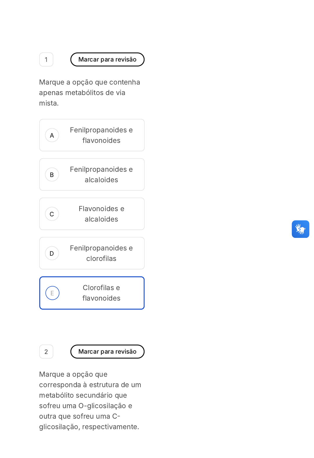 <p>A</p><p>B</p><p>C</p><p>D</p><p>E</p><p>1 Marcar para revisão</p><p>Marque a opção que contenha</p><p>apenas metabólitos de via</p><p>mista.</p><p>Fenilpropanoides e</p><p>flavonoides</p><p>Fenilpropanoides e</p><p>alcaloides</p><p>Flavonoides e</p><p>alcaloides</p><p>Fenilpropanoides e</p><p>clorofilas</p><p>Clorofilas e</p><p>flavonoides</p><p>2 Marcar para revisão</p><p>Marque a opção que</p><p>corresponda à estrutura de um</p><p>metabólito secundário que</p><p>sofreu uma O-glicosilação e</p><p>outra que sofreu uma C�</p><p>glicosilação, respectivamente.</p><p>A</p><p>B</p><p>C</p><p>D</p><p>E</p><p>I e II</p><p>I e III</p><p>II e III</p><p>I e IV</p><p>III e IV</p><p>3 Marcar para revisão</p><p>Muitos dos metabólitos</p><p>secundários ocorrem na</p><p>natureza na forma de</p><p>glicosídeos ou gliconas. Dessa</p><p>maneira, analise as estruturas a</p><p>A</p><p>B</p><p>C</p><p>D</p><p>E</p><p>seguir e indique qual delas</p><p>sofreu uma O-glicosilação.</p><p>I, II e IV</p><p>I, II e III</p><p>II, III e IV</p><p>I, III e IV</p><p>II e IV</p><p>4 Marcar para revisão</p><p>De acordo com os eventos</p><p>químicos que ocorrem no Ciclo</p><p>de Calvin, ele pode ser dividido</p><p>em três fases. Observe a</p><p>imagem a seguir e marque a</p><p>alternativa correta:</p><p>A</p><p>B</p><p>C</p><p>A Fase 1 corresponde</p><p>à Fixação; a Fase 2 à</p><p>Redução; e a Fase 3,</p><p>à Regeneração.</p><p>A Fase 1 corresponde</p><p>à Fixação; a Fase 2 à</p><p>Fosforilação; e a Fase</p><p>3, à Regeneração.</p><p>A Fase 1 corresponde</p><p>à Regeneração; a</p><p>Fase 2 à Fosforilação;</p><p>e a Fase 3, à Fixação.</p><p>D</p><p>E</p><p>A Fase 1 corresponde</p><p>à Regeneração; a</p><p>Fase 2 à Redução; e a</p><p>Fase 3, à Fixação.</p><p>A Fase 1 corresponde</p><p>à Regeneração; a</p><p>Fase 2 à Redução; e a</p><p>Fase 3, à Fosforilação.</p><p>5 Marcar para revisão</p><p>Temos a seguir um esquema</p><p>com ilustrações referentes à</p><p>planta medicinal Camomila</p><p>�Chamomilla recutita L.), que</p><p>possui indicações terapêuticas</p><p>de antiespasmódico, ansiolítico</p><p>e sedativo leve.</p><p>Com base na avaliação do</p><p>esquema, marque a alternativa</p><p>que contenha as correlações</p><p>numéricas correspondes:</p><p>A</p><p>B</p><p>C</p><p>D</p><p>E</p><p>1- planta medicinal, 2�</p><p>princípios ativos</p><p>(fármacos), 3- droga</p><p>vegetal.</p><p>1- planta medicinal, 2�</p><p>droga vegetal, 3�</p><p>princípios ativos</p><p>(fármacos).</p><p>1- princípios ativos</p><p>(fármacos), 2- droga</p><p>vegetal, 3- planta</p><p>medicinal.</p><p>1- princípios ativos</p><p>(fármacos), 2-planta</p><p>medicinal, 3- droga</p><p>vegetal.</p><p>1- droga vegetal, 2�</p><p>planta medicinal, 3�</p><p>princípios ativos</p><p>(fármacos).</p><p>6 Marcar para revisão</p><p>Qual dos grupos de fármacos a</p><p>seguir ainda possui as plantas</p><p>como principal fonte de</p><p>obtenção:</p><p>A</p><p>B</p><p>C</p><p>D</p><p>E</p><p>Antivirais inibidores</p><p>de protease, como</p><p>Saquinavir e Ritonavir.</p><p>Anticancerígenos</p><p>inibidores mitóticos,</p><p>como Paclitaxel e</p><p>Vinblastina.</p><p>Antidepressivos</p><p>tricíclicos, como</p><p>Amitriptilina e</p><p>Clomipramina.</p><p>Analgésicos e</p><p>antipiréticos, como</p><p>Aspirina e Acetanilida.</p><p>Cardenolídeos</p><p>digitálicos, como o</p><p>Lanatosídeo C e a</p><p>Digoxina.</p><p>7 Marcar para revisão</p><p>Com base nos conceitos sobre</p><p>droga e produto natural,</p><p>marque a opção que contenha</p><p>uma distinção e uma</p><p>semelhança entre eles,</p><p>respectivamente:</p><p>A</p><p>B</p><p>C</p><p>D</p><p>E</p><p>Pode ter uma origem</p><p>completamente</p><p>sintética / possui</p><p>atividade</p><p>farmacológica ou</p><p>biológica.</p><p>Originalmente obtido</p><p>de um organismo vivo</p><p>/ pode ter uma origem</p><p>completamente</p><p>sintética.</p><p>Sofre processos de</p><p>coleta, preparo e</p><p>conservação / pode</p><p>ter uma origem</p><p>completamente</p><p>sintética.</p><p>Possui atividade</p><p>farmacológica ou</p><p>biológica /</p><p>originalmente obtido</p><p>de um organismo</p><p>vivo.</p><p>Pode ter uma origem</p><p>completamente</p><p>sintética / sofre</p><p>processos de coleta,</p><p>preparo e</p><p>conservação.</p><p>8 Marcar para revisão</p><p>A</p><p>B</p><p>C</p><p>D</p><p>E</p><p>Quanto à localização dos</p><p>eventos fotossintéticos,</p><p>marque a alternativa incorreta:</p><p>Estroma do</p><p>cloroplasto - fotólise</p><p>da água.</p><p>Estroma do</p><p>cloroplasto - ciclo de</p><p>Calvin.</p><p>Membrana do</p><p>tilacóide - síntese de</p><p>ATP.</p><p>Estroma do</p><p>cloroplasto - fixação</p><p>de carbono.</p><p>Membrana do</p><p>tilacóide - cadeia</p><p>transportadora de</p><p>elétrons.</p><p>9 Marcar para revisão</p><p>Os fenilpropanoides</p><p>correspondem a um grupo de</p><p>metabólitos secundários</p><p>produzidos na Via do</p><p>Chiquimato. Com base na</p><p>característica estrutural desses</p><p>metabólitos, avalie as</p><p>estruturas a seguir e marque a</p><p>opção correspondente às</p><p>00</p><p>hora</p><p>: 21</p><p>min</p><p>: 03</p><p>seg</p><p>Ocultar</p><p>Questão 10 de 10</p><p>Respondidas �10� Em branco �0�</p><p>Finalizar prova</p><p>1 2 3 4 5</p><p>6 7 8 9 10</p><p>SM1 Farmacognosia</p><p>A</p><p>B</p><p>C</p><p>D</p><p>E</p><p>estruturas de fenilpropanoides</p><p>ou correlatos.</p><p>I e II</p><p>I, II e III</p><p>II, III e IV</p><p>I, III e IV</p><p>I, II e IV</p><p>10 Marcar para revisão</p><p>Assinale a alternativa que</p><p>indique o precursor metabólico</p><p>do grupo acetil(a) ��COCH3) do</p><p>acetil-CoA.</p><p>A</p><p>B</p><p>C</p><p>D</p><p>E</p><p>Da coenzima A</p><p>Do piruvato</p><p>Do fosfoenolpiruvato</p><p>�PEP�</p><p>Do aminoácido L�</p><p>fenilalanina ou L�</p><p>tirosina</p><p>De outra unidade de<