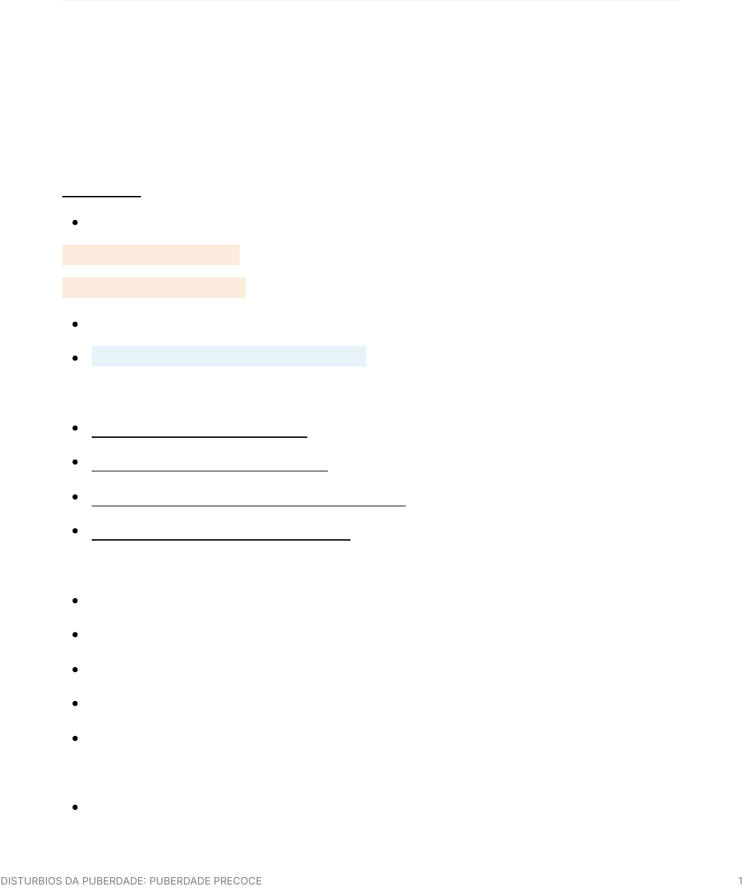 DISTURBIOS DA PUBERDADE PUBERDADE PRECOCE 1 DISTURBIOS DA PUBERDADE: PUBERDADE PRECOCE A puberdade precoce é mais comum em meninas do que em meninos. → A puberdade precoce é tradicionalmente definida como o início de características sexuais secundárias antes dos oito anos de idade nas mulheres e dos nove anos nos homens (esses limites de idade são escolhidos por serem 2 desvios padrões abaixo da idade média de início da puberdade). Normalmente é marcada pela tríade: presença da TRÍADE Características sexual secundária em idade 2DP → 8 ANOS MENINAS → 9 ANOS MENINOS Aumento da velocidade de crescimento → alta estatura Perda de previsão de estatura final → avanço de IO CLASSIFICAÇÃO Puberdade precoce central: GnRH dependente Puberdade precoce periférica: GnRH independente Puberdade precoce combinada ou mista Formas variantes da normalidade AVALIAÇÃO História clínica Peso, altura e velocidade de crescimento Exame físico Estadiamento de Tanner Exames complementares PUBERDADE PRECOCE CENTRAL depende da ativação prematura do eixo HHG DISTURBIOS DA PUBERDADE PUBERDADE PRECOCE 2 Padrão clinico de progressão semelhante à puberdade fisiológica Causa + frequente de desenvolvimento puberal precoce Isossexual Mais comum entre 6 e 8 anos → quanto menor a idade, maior risco de doença congênita Mais comum em meninas Etiologia idiopática: 95% das meninas e 50% meninos A PPC é idiopática em aproximadamente 95% das meninas, mas em apenas 50% dos meninos. 2/3 dos meninos com PPC apresentam com anormalidades neurológicas e, destes, 50% são tumores. A PPC pode estar relacionada a lesões/ alterações do SNC, entre elas o hamartroma é a causa orgânica mais comum em ambos os sexos 2 a 28%. São malformações congênitas não neoplásicas, compostas por massa heterotópica de tecido hipotalâmico (hipotálamo mal formado). PUBERDADE PRECOCE PERIFÉRICA A puberdade precoce periférica é causada pela secreção excessiva de hormônios sexuais (estrogênios e/ou andrógenos) derivados das gônadas ou glândulas suprarrenais ou de fontes exógenas. Também chamada de pseudopuberdade pela fato de não depender da ativação do HHG; Pode ter uma progressão anárquica (ex.: menarca antes da telarca). Pode se comportar como isossexual ou heterossexual dependendo da origem dos hormônios sexuais. Ou seja, pode ocorrer virilização das mulheres e feminização dos homens. ETIOLOGIA Pode ser endógena ou exógena Endógena: patologia na suprarrenal/ adrenal (onde são produzidos os andrógenos), patologias nas gônadas ou presença de tumores produtores de hormônios sexuais. Exógena: ingestão de hormônio dos pais pela criança, uso de cremes com esteroides sexuais. DISTURBIOS DA PUBERDADE PUBERDADE PRECOCE 3 Hiperplasia adrenal congênita: primeira etiologia a se pensar quando se vê virilização nas meninas (aumento de pelo e do clitóris, sem desenvolvimento das mamas), ou seja, provoca um desenvolvimento heterossexual nas meninas. A conversão defeituosa de 17-hidroxiprogesterona em 11-desoxicortisol é responsável por mais de 90% dos casos de hiperplasia adrenal congênita HAC. Esta conversão é mediada pela enzima 21-hidroxilase. A conversão defeituosa de 17-hidroxiprogesterona em 11-desoxicortisol resulta em diminuição da síntese de cortisol e, portanto, aumento da secreção de corticotropina ACTH. A estimulação adrenal resultante leva ao aumento da produção de andrógenos. Dessa forma, o 17-hidroxicortisol apresenta-se em altos níveis ao ser dosado, enquanto o cortisol apresenta-se baixo. Na tentativa de aumentar a produção de cortisol, aumenta-se o ACTH, o qual também aumenta o DHEA, que provoca puberdade precoce nos meninos e meninas e sinais de virilização nas meninas. Portanto: ao dosar o cortisol ele estará reduzido, enquanto o DHEA, a androstenediona, a testosterona e o 17 hidroxiandrostenediaona estarão elevados. CISTOS OVARIANOS Em meninas, os cistos ovarianos foliculares autônomos são as causas ovarianas mais frequentes. Se maiores que 1 cm, podem produzir estrógeno. A puberdade é isossexual, com aumento das mamas e sangramento vaginal. Os tumores ovarianos das células da granulosa são a neoplasia ovariana mais frequente, promovendo PPGI isossexual. Tumores ovarianos virilizantes levam à PPGI heterossexual. Nos meninos, os tumores produtores de gonadotrofina coriônica HCG, como hepatoblastoma, hepatoma, teratomas e corioepiteliomas, resultam em aumento discreto testicular desproporcional ao aumento do pênis. Tumores das células de Leydig, que secretam testosterona, mas são raros na infância, levam ao aumento testicular unilateral. DISTURBIOS DA PUBERDADE PUBERDADE PRECOCE 4 O hipotireoidismo primário (redução de T3 e T4 devido à alguma disfunção na própria tireoide, levando ao aumento do TSH pode resultar no aparecimento de caracteres sexuais secundários por estímulo direto do hormônio tireoestimulante TSH sobre o receptor do LH ovariano. Cursa com baixa estatura, velocidade de crescimento baixa e atraso da idade óssea. Precoce central x Precoce periférica: A puberdade precoce central é provocada pela ativação precoce do eixo hipotálamo-hipófise-gonodal. Já a puberdade precoce periférica é causada pela secreção extra-hipofisária de gonadotrofinas ou de esteroides sexuais independente do estímulo gonadotrófico PUBERDADE PRECOCE COMBINADA OU MISTA Inicialmente periférica, é secundária à exposição crônica aos esteroides sexuais, levando a uma aceleração do crescimento linear e da idade óssea e, consequentemente, à maturação do eixo hipotálamo-hipofisário. FORMAS VARIANTES Condições isoladas / incompletas: Telarca precoce: desenvolvimento isolado do tecido mamário antes dos 8 anos em meninas. Idiopática; Unilateral ou bilateral ; Mamas com progressão até M3; Regressão espontânea 60%; Não há aceleração do crescimento ou da idade óssea; Cerca de 10% progride para uma con