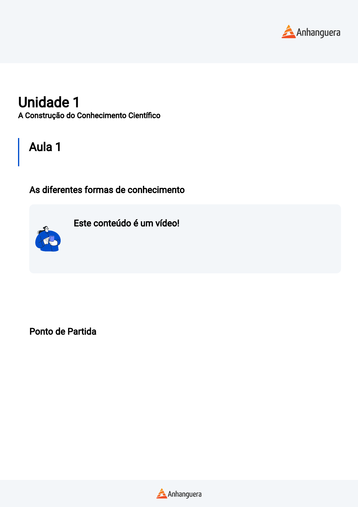 Disciplina PENSAMENTO CIENTÍFICO Unidade 1 A Construção do Conhecimento Cientí�co Aula 1 As Diferentes Formas de Conhecimento As diferentes formas de conhecimento Este conteúdo é um vídeo! Para assistir este conteúdo é necessário que você acesse o AVA pelo computador ou pelo aplicativo. Você pode baixar os vídeos direto no aplicativo para assistir mesmo sem conexão à internet. Estudante, esta videoaula foi preparada especialmente para você. Nela, você irá aprender conteúdos importantes para a sua formação pro�ssional. Vamos assisti-la? Ponto de Partida Olá, estudante! Você já re�etiu sobre o que é o conhecimento? Por que e como sabemos o que sabemos? O que é possível conhecer? De acordo com o Dicionário Brasileiro da Língua Portuguesa Michaelis (2023), o conhecimento pode ser de�nido como o ato ou efeito de perceber/compreender por meio da razão e/ou da experimentação. E o que isso quer dizer? Quer dizer que tudo o que conhecemos é produto do nosso processo cognitivo (razão) ou vem daquilo que vivenciamos (experimentação). Assim, entendemos que o ato de conhecer é uma construção que se dá ao longo de nossas vidas. Se o conhecimento é uma construção, ele se dá de diferentes maneiras e podemos identi�car diferentes tipos de construções. Vamos elencar três delas: o senso comum (também chamado de conhecimento empírico/popular/vulgar), o conhecimento religioso e o conhecimento �losó�co. A partir disso, vamos re�etir sobre a seguinte situação: Em uma sala de aula, três Disciplina PENSAMENTO CIENTÍFICO estudantes são desa�ados pelo professor de Filoso�a a responderem a três questões, que são recorrentes ao longo da história: 1. De onde viemos? 2. Para onde vamos após a morte? 3. Por que estamos aqui? Cada aluno, a partir da sua visão de mundo, adota uma postura diferente em relação às respostas. Lucas vê o mundo a partir do conhecimento religioso; Saulo interpreta as questões a partir do �losó�co e, por �m, o último, Daniel, por meio do senso comum. E você, como responderia tais questionamentos? Ao decorrer da aula você será capaz não apenas de entender como se dá a construção dos diversos tipos de conhecimentos, mas também de identi�cá-los a partir de suas particularidades. Bons estudos! Vamos Começar! De onde vem o nosso conhecimento? Esse é um questionamento que muitas vezes não nos fazemos, mas é importante para compreendermos as diferentes formas de interpretação dos fenômenos que nos cercam. Segundo Aranha e Martins (2003), ao falar sobre conhecimento, podemos fazer alusão ao ato de conhecer ou a aquilo que é produto do conhecimento. O ato de conhecer é pertinente à relação que se dá entre a consciência (aquele que busca conhecer) e o objeto (aquilo que vai ser conhecido). Por sua vez, o produto do conhecimento é resultado do ato de conhecer, sendo entendido como a soma dos saberes acumulados e recebidos. Esses saberes sofrem in�uências sociais, culturais, econômicas, políticas e históricas na sua constituição. O ser humano é, por natureza, curioso e investigativo; sentimos a necessidade de conhecer. Esse conhecimento é algo dinâmico, ou seja, está em constante movimento e em constante transformação. A partir disso, é possível compreender que o conhecimento vem sendo construído ao longo da história, a partir de diferentes perspectivas, variando e se transformando de acordo com o tempo histórico e com as diferentes regiões do planeta. Isso quer dizer que a interpretação dos fatos e fenômenos que nos cercam também se transformam à medida que a sociedade se transforma. Basta percebermos que muitos valores, regras, visões econômicas, sociais, políticas e culturais vigentes no nosso país na década de 1930, por exemplo, não são os mesmos que nos guiam na atualidade. Para compreendermos melhor, vamos pensar no direito ao voto, que para as mulheres se concretizou apenas em 1932 de maneira facultativa. Nas eleições de 1933, as mulheres puderam votar e ser votadas pela primeira vez, mas foi somente no ano de 1965 que o voto feminino foi equiparado ao voto dos homens, se transformando em um dever social (Tosi, 2023). Atualmente os partidos políticos têm inclusive cotas mínimas que devem ser reservadas para a candidatura de mulheres em cada pleito eleitoral. Disciplina PENSAMENTO CIENTÍFICO Essa re�exão é importante, pois nos ajuda a compreender como as transformações na sociedade in�uenciam a nossa visão de mundo, a nossa interpretação da realidade e a maneira como construímos o nosso conhecimento a respeito das mais diversas questões, sejam elas sociais, culturais, econômicas, políticas, etc. Esse processo, como já vimos, é dinâmico, o que implica dizer que esse conhecimento está em constante transformação. Existem diferentes formas de interpretarmos a realidade que nos cerca, de chegarmos às respostas daquilo que nos inquieta. Desse modo, podemos classi�car o conhecimento em diferentes tipos, a depender do tipo de resposta que damos a um determinado questionamento. Siga em Frente... Senso comum Há quanto tempo os indivíduos usam ervas medicinais no tratamento de doenças? Há muitos séculos. Você provavelmente já ouviu sobre como o chá de boldo ajuda a melhorar a ressaca ou que, para melhorar o sono, chá de camomila é “tiro e queda”. E que o açúcar cristal pode ser utilizado na cicatrização de ferimentos, você sabia? Essas soluções, que parecem simples e naturais, fazem parte da construção dos saberes de determinado grupo; compõem a sua cultura, são transmitidas geração após geração, na maioria das vezes sem questionamento. É o que chamamos de sabedoria popular, conhecimento empírico ou senso comum. Atualmente, há pesquisas cientí�cas que indicam a e�cácia bactericida e cicatrizante do açúcar cristal; outras mostram como o boldo tem efeito sobre a vesícula biliar e aumenta as se