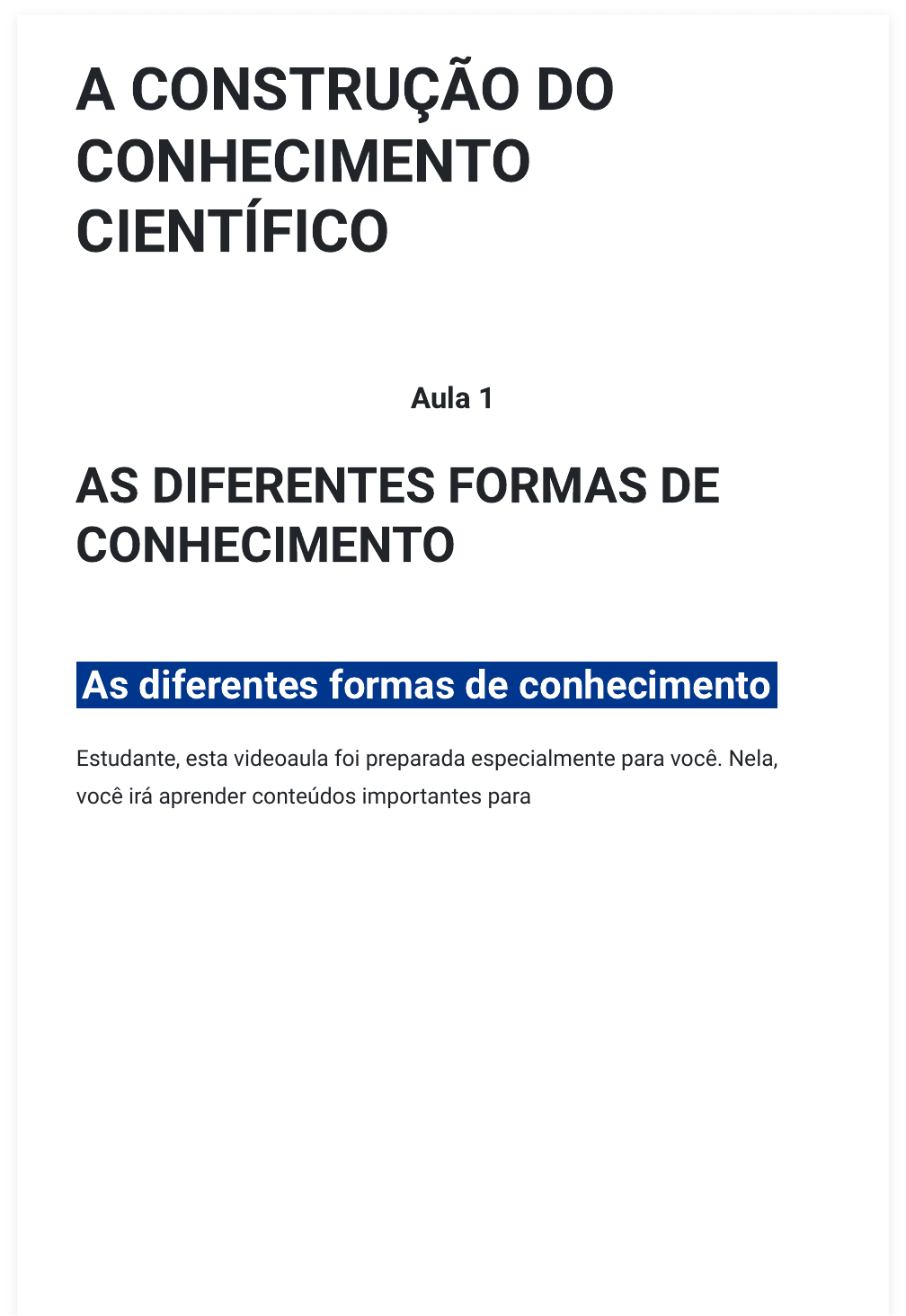 A CONSTRUÇÃO DO CONHECIMENTO CIENTÍFICO Aula 1 AS DIFERENTES FORMAS DE CONHECIMENTO As diferentes formas de conhecimento Estudante, esta videoaula foi preparada especialmente para você. Nela, você irá aprender conteúdos importantes para a sua formação profissional. Vamos assisti-la? Ponto de Partida Olá, estudante! Você já refletiu sobre o que é o conhecimento? Por que e como sabemos o que sabemos? O que é possível conhecer? De acordo com o Dicionário Brasileiro da Língua Portuguesa Michaelis (2023), o conhecimento pode ser definido como o ato ou efeito de perceber/compreender por meio da razão e/ou da experimentação. E o que isso quer dizer? Quer dizer que tudo o que conhecemos é produto do nosso processo cognitivo (razão) ou vem daquilo que vivenciamos (experimentação). Assim, entendemos que o ato de conhecer é uma construção que se dá ao longo de nossas vidas. Se o conhecimento é uma construção, ele se dá de diferentes maneiras e podemos identificar diferentes tipos de construções. Vamos elencar três delas: o senso comum (também chamado de conhecimento empírico/popular/vulgar), o conhecimento religioso e o conhecimento filosófico. A partir disso, vamos refletir sobre a seguinte situação: Em uma sala de aula, três estudantes são desafiados pelo professor de Filosofia a responderem a três questões, que são recorrentes ao longo da história: 1. De onde viemos? 2. Para onde vamos após a morte? 3. Por que estamos aqui? Cada aluno, a partir da sua visão de mundo, adota uma postura diferente em relação às respostas. Lucas vê o mundo a partir do conhecimento religioso; Saulo interpreta as questões a partir do filosófico e, por fim, o último, Daniel, por meio do senso comum. E você, como responderia tais questionamentos? Ao decorrer da aula você será capaz não apenas de entender como se dá a construção dos diversos tipos de conhecimentos, mas também de identificá-los a partir de suas particularidades. Bons estudos! Vamos Começar! De onde vem o nosso conhecimento? Esse é um questionamento que muitas vezes não nos fazemos, mas é importante para compreendermos as diferentes formas de interpretação dos fenômenos que nos cercam. Segundo Aranha e Martins (2003), ao falar sobre conhecimento, podemos fazer alusão ao ato de conhecer ou a aquilo que é produto do conhecimento. O ato de conhecer é pertinente à relação que se dá entre a consciência (aquele que busca conhecer) e o objeto (aquilo que vai ser conhecido). Por sua vez, o produto do conhecimento é resultado do ato de conhecer, sendo entendido como a soma dos saberes acumulados e recebidos. Esses saberes sofrem influências sociais, culturais, econômicas, políticas e históricas na sua constituição. O ser humano é, por natureza, curioso e investigativo; sentimos a necessidade de conhecer. Esse conhecimento é algo dinâmico, ou seja, está em constante movimento e em constante transformação. A partir disso, é possível compreender que o conhecimento vem sendo construído ao longo da história, a partir de diferentes perspectivas, variando e se transformando de acordo com o tempo histórico e com as diferentes regiões do planeta. Isso quer dizer que a interpretação dos fatos e fenômenos que nos cercam também se transformam à medida que a sociedade se transforma. Basta percebermos que muitos valores, regras, visões econômicas, sociais, políticas e culturais vigentes no nosso país na década de 1930, por exemplo, não são os mesmos que nos guiam na atualidade. Para compreendermos melhor, vamos pensar no direito ao voto, que para as mulheres se concretizou apenas em 1932 de maneira facultativa. Nas eleições de 1933, as mulheres puderam votar e ser votadas pela primeira vez, mas foi somente no ano de 1965 que o voto feminino foi equiparado ao voto dos homens, se transformando em um dever social (Tosi, 2023). Atualmente os partidos políticos têm inclusive cotas mínimas que devem ser reservadas para a candidatura de mulheres em cada pleito eleitoral. Essa reflexão é importante, pois nos ajuda a compreender como as transformações na sociedade influenciam a nossa visão de mundo, a nossa interpretação da realidade e a maneira como construímos o nosso conhecimento a respeito das mais diversas questões, sejam elas sociais, culturais, econômicas, políticas, etc. Esse processo, como já vimos, é dinâmico, o que implica dizer que esse conhecimento está em constante transformação. Existem diferentes formas de interpretarmos a realidade que nos cerca, de chegarmos às respostas daquilo que nos inquieta. Desse modo, podemos classificar o conhecimento em diferentes tipos, a depender do tipo de resposta que damos a um determinado questionamento. Siga em Frente... Senso comum Há quanto tempo os indivíduos usam ervas medicinais no tratamento de doenças? Há muitos séculos. Você provavelmente já ouviu sobre como o chá de boldo ajuda a melhorar a ressaca ou que, para melhorar o sono, chá de camomila é “tiro e queda”. E que o açúcar cristal pode ser utilizado na cicatrização de ferimentos, você sabia? Essas soluções, que parecem simples e naturais, fazem parte da construção dos saberes de determinado grupo; compõem a sua cultura, são transmitidas geração após geração, na maioria das vezes sem questionamento. É o que chamamos de sabedoria popular, conhecimento empírico ou senso comum. Atualmente, há pesquisas científicas que indicam a eficácia bactericida e cicatrizante do açúcar cristal; outras mostram como o boldo tem efeito sobre a vesícula biliar e aumenta as secreções gástricas; encontram-se, ainda, estudos que revelam as funções calmante, relaxante e ansiolítica presentes nos compostos da camomila. Mas as questões citadas anteriormente são de cunho científico e não fazem parte da construção do senso comum. Na maioria das vezes, as pessoas apenas conhecem os benefícios do uso das plantas, por exemplo,