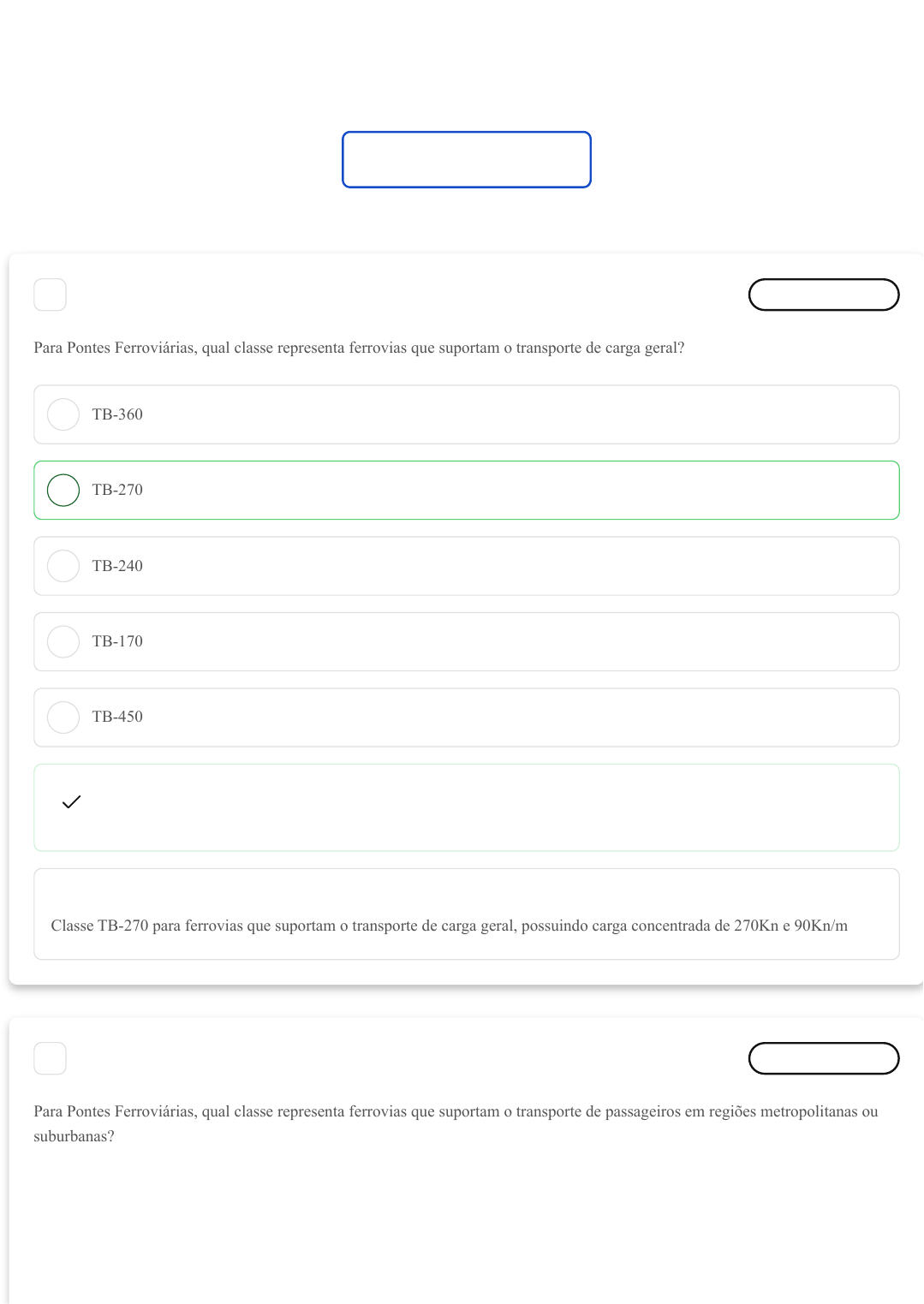 Você acertou 6 de 6 questões Verifique o seu desempenho e continue treinando! Você pode refazer o exercício quantas vezes quiser. Verificar Desempenho A B C D E 1 Marcar para revisão Para Pontes Ferroviárias, qual classe representa ferrovias que suportam o transporte de carga geral? TB-360 TB-270 TB-240 TB-170 TB-450 Resposta correta Parabéns, você selecionou a alternativa correta. Confira o gabarito comentado! Gabarito Comentado Classe TB-270 para ferrovias que suportam o transporte de carga geral, possuindo carga concentrada de 270Kn e 90Kn/m 2 Marcar para revisão Para Pontes Ferroviárias, qual classe representa ferrovias que suportam o transporte de passageiros em regiões metropolitanas ou suburbanas? A B C D E A B C D E TB - 360 TB-270 TB-240 TB-170 TB-450 Resposta correta Parabéns, você selecionou a alternativa correta. Confira o gabarito comentado! Gabarito Comentado Classe TB-170 para ferrovias onde há apenas o transporte de passageiros em regiões metropolitanas ou suburbanas, possuindo carga concentrada de 170Kn e 25Kn/m. ----- 3 Marcar para revisão Em Pontes, adota-se qual peso específico para Defensas? 24kN/m³ 12kN/m³ 25kN/m³ 54kN/m³ 30kN/m³ Resposta correta Parabéns, você selecionou a alternativa correta. Confira o gabarito comentado! Gabarito Comentado A B C D E A B C Defensas - 25kN/m³ estando o seu peso próprio em kN/m. ----- 4 Marcar para revisão Em Pontes, adota-se qual peso específico para a Camada de Regularização em Concreto? 24kN/m³ 12kN/m³ 36kN/m³ 54kN/m³ 30kN/m³ Resposta correta Parabéns, você selecionou a alternativa correta. Confira o gabarito comentado! Gabarito Comentado A Camada de Regularização em Concreto tem peso específico de 24kN/m³. ----- 5 Marcar para revisão Qual a concepção estrutural mais eficiente em Pontes? A concepção estrutural mais eficiente é aquela que fornece as cargas provenientes das solicitações o percurso mais curto sobre a estrutura desde seus pontos de aplicação até a sua fundação A concepção estrutural mais eficiente é aquela que fornece as cargas provenientes das solicitações o percurso mais longo sobre a estrutura desde seus pontos de aplicação até a sua fundação a concepção estrutural mais eficiente é aquela que fornece as cargas provenientes das solicitações o percurso mais curto sobre a estrutura desde seus pontos de aplicação até a sua Superestrutura D E A B C D E A concepção estrutural mais eficiente é aquela que fornece as cargas provenientes das solicitações o percurso mais curto sobre a estrutura desde seus pontos de aplicação até a sua Mesoestrutura a concepção estrutural mais eficiente é aquela que fornece as cargas provenientes das solicitações o percurso mais longo sobre a estrutura desde seus pontos de aplicação até a sua Mesoestrutura Resposta correta Parabéns, você selecionou a alternativa correta. Confira o gabarito comentado! Gabarito Comentado A concepção estrutural mais eficiente é aquela que fornece as cargas provenientes das solicitações o percurso mais curto sobre a estrutura desde seus pontos de aplicação até a sua fundação. Isso porque, quanto menor o percurso das cargas, menor será a quantidade de material necessária para a construção da ponte, o que resulta em uma estrutura mais econômica e eficiente. Além disso, um percurso mais curto das cargas também contribui para a redução do tempo de construção da ponte, o que é importante em projetos de grande porte. Por fim, uma estrutura com um percurso mais curto das cargas é mais resistente a eventos naturais, como terremotos e furacões, o que aumenta sua vida útil. ----- 6 Marcar para revisão Para Pontes Ferroviárias, qual classe representa ferrovias que suportam o transporte de minério de ferro ou outros carregamentos equivalentes? TB-360 TB-270 TB-240 TB-170 TB-450 Resposta correta Parabéns, você selecionou a alternativa correta. Confira o gabarito comentado! Gabarito Comentado Classe TB-360 para ferrovias que suportam o transporte de minério de ferro ou outros carregamentos equivalentes, possuindo carga concentrada de 360Kn e 120Kn/m. -----