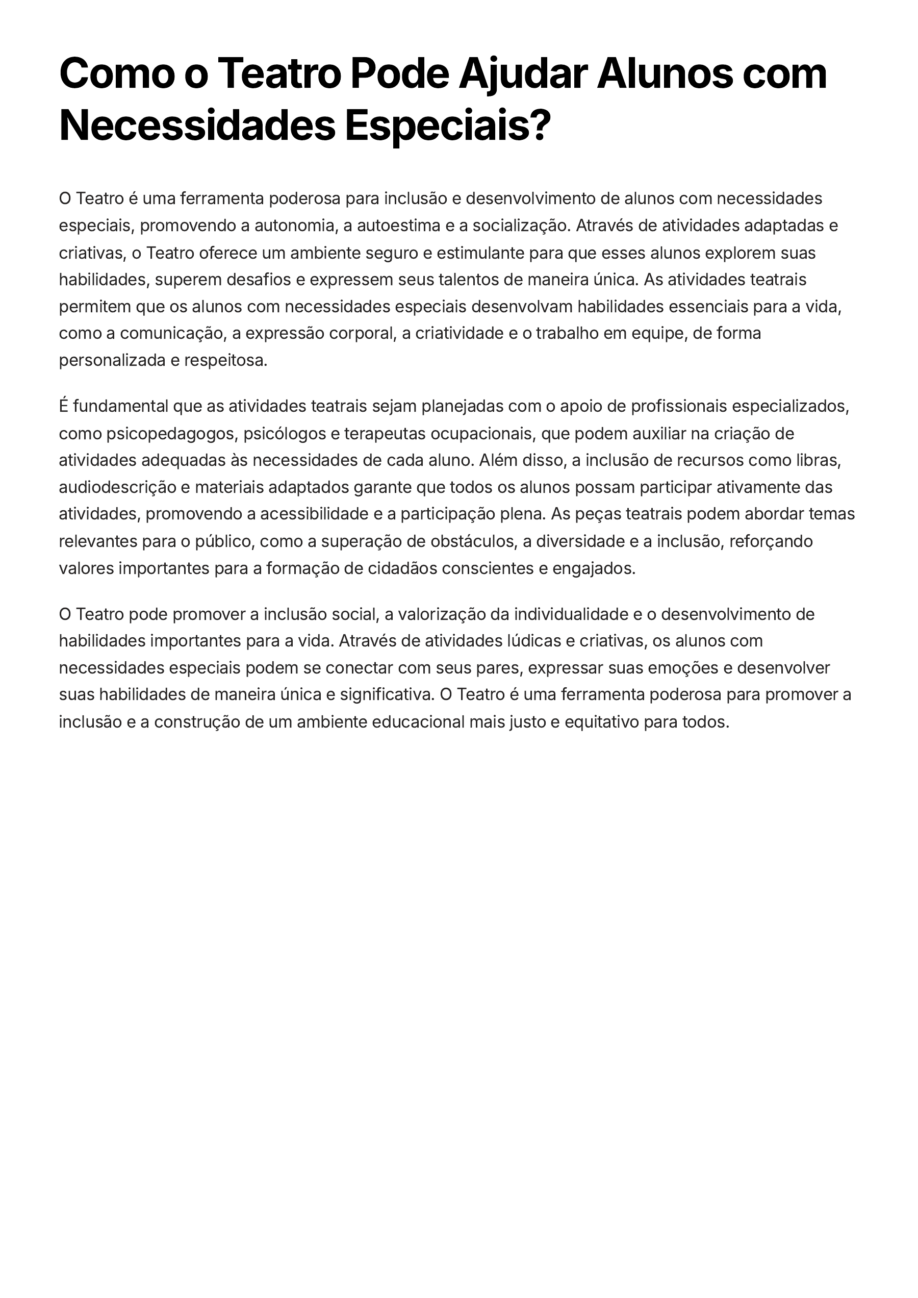 Como o Teatro Pode Ajudar Alunos com Necessidades Especiais? O Teatro é uma ferramenta poderosa para inclusão e desenvolvimento de alunos com necessidades especiais, promovendo a autonomia, a autoestima e a socialização. Através de atividades adaptadas e criativas, o Teatro oferece um ambiente seguro e estimulante para que esses alunos explorem suas habilidades, superem desafios e expressem seus talentos de maneira única. As atividades teatrais permitem que os alunos com necessidades especiais desenvolvam habilidades essenciais para a vida, como a comunicação, a expressão corporal, a criatividade e o trabalho em equipe, de forma personalizada e respeitosa. É fundamental que as atividades teatrais sejam planejadas com o apoio de profissionais especializados, como psicopedagogos, psicólogos e terapeutas ocupacionais, que podem auxiliar na criação de atividades adequadas às necessidades de cada aluno. Além disso, a inclusão de recursos como libras, audiodescrição e materiais adaptados garante que todos os alunos possam participar ativamente das atividades, promovendo a acessibilidade e a participação plena. As peças teatrais podem abordar temas relevantes para o público, como a superação de obstáculos, a diversidade e a inclusão, reforçando valores importantes para a formação de cidadãos conscientes e engajados. O Teatro pode promover a inclusão social, a valorização da individualidade e o desenvolvimento de habilidades importantes para a vida. Através de atividades lúdicas e criativas, os alunos com necessidades especiais podem se conectar com seus pares, expressar suas emoções e desenvolver suas habilidades de maneira única e significativa. O Teatro é uma ferramenta poderosa para promover a inclusão e a construção de um ambiente educacional mais justo e equitativo para todos. Quais São os Jogos e Exercícios Teatrais Mais Eficazes? Atividade: "Estátua" Neste clássico jogo, as crianças exploram a criatividade e a expressão corporal. Um aluno é escolhido como "mestre" e assume uma pose congelada. Os outros alunos, um a um, devem copiar a pose do mestre, criando uma "estátua viva". Desafios: Criatividade, observação, memorização e trabalho em equipe. Benefícios: Estimula a imaginação, a coordenação motora e o desenvolvimento da linguagem corporal. Exercício: "Improvisação em Dupla" As crianças são divididas em duplas e devem improvisar cenas curtas, sem roteiro pré-definido. A proposta é que elas desenvolvam a capacidade de criar personagens, histórias e diálogos espontâneos, explorando a interação e a comunicação não verbal. Desafios: Criatividade, espontaneidade, comunicação, interação e adaptação. Benefícios: Desenvolve a capacidade de improvisar, a criatividade, a comunicação, a interação social e o trabalho em equipe. Atividade: "Conto de Fadas Interativo" Uma atividade divertida para trabalhar a imaginação e a linguagem. Um aluno (ou o professor) inicia um conto de fadas, e a cada frase, os outros alunos podem interagir, inventando novos personagens, obstáculos e desfechos. Desafios: Criatividade, participação, interação, concentração e atenção. Benefícios: Estimula a criatividade, a imaginação, a linguagem oral, a escuta e a participação. Jogo: "Mímica" Clássico e divertido, o jogo da mímica estimula a comunicação não verbal e a interpretação. Um aluno escolhe uma palavra ou frase, e deve representá-la através de gestos e expressões faciais, sem falar. Os outros alunos tentam adivinhar o que está sendo representado. Desafios: Criatividade, comunicação não verbal, interpretação, concentração e atenção. Benefícios: Desenvolve a comunicação não verbal, a criatividade, a capacidade de interpretar e a capacidade de se expressar. A escolha de jogos e exercícios teatrais eficazes deve considerar a faixa etária dos alunos, o nível de desenvolvimento da turma e os objetivos pedagógicos da atividade. É importante variar as atividades para manter o interesse e a participação dos alunos, incentivando a criatividade e a exploração da linguagem corporal e verbal. Como Envolver os Pais no Teatro Escolar? A participação dos pais no teatro escolar é fundamental para o sucesso e a riqueza da experiência artística das crianças. É crucial criar um ambiente de apoio e colaboração entre a escola e as famílias, para que juntos possam construir um cenário de aprendizado e desenvolvimento artístico. Convites e Divulgação: Compartilhe informações sobre as peças, ensaios e apresentações com os pais através de comunicados, emails, grupos de WhatsApp ou plataformas online. A acessibilidade e transparência são importantes para que as famílias estejam cientes e possam acompanhar o desenvolvimento das atividades teatrais. Oficinas e Atividades: Organize oficinas para os pais sobre os bastidores do teatro, como confecção de figurinos, cenários e adereços. Essa interação prática promove um senso de pertencimento e incentiva a colaboração familiar. Participação Ativa: Convide os pais para assistir aos ensaios e apresentações. Eles podem ser convidados a auxiliar em diferentes aspectos da produção, como organização de eventos, venda de ingressos, apoio técnico ou até mesmo atuar como figurinistas ou maquiadores. Criação de um Grupo de Apoio: Crie um grupo de pais que se engajem no teatro escolar. Isso pode facilitar a organização de eventos, arrecadação de fundos e comunicação entre os envolvidos. Ao criar um ambiente acolhedor e convidativo para os pais, a escola demonstra o valor que atribui à sua participação e incentiva a construção de uma comunidade escolar mais engajada e unida. Essa sinergia entre escola e família fortalece a experiência teatral, proporcionando um aprendizado mais completo e enriquecedor para as crianças.