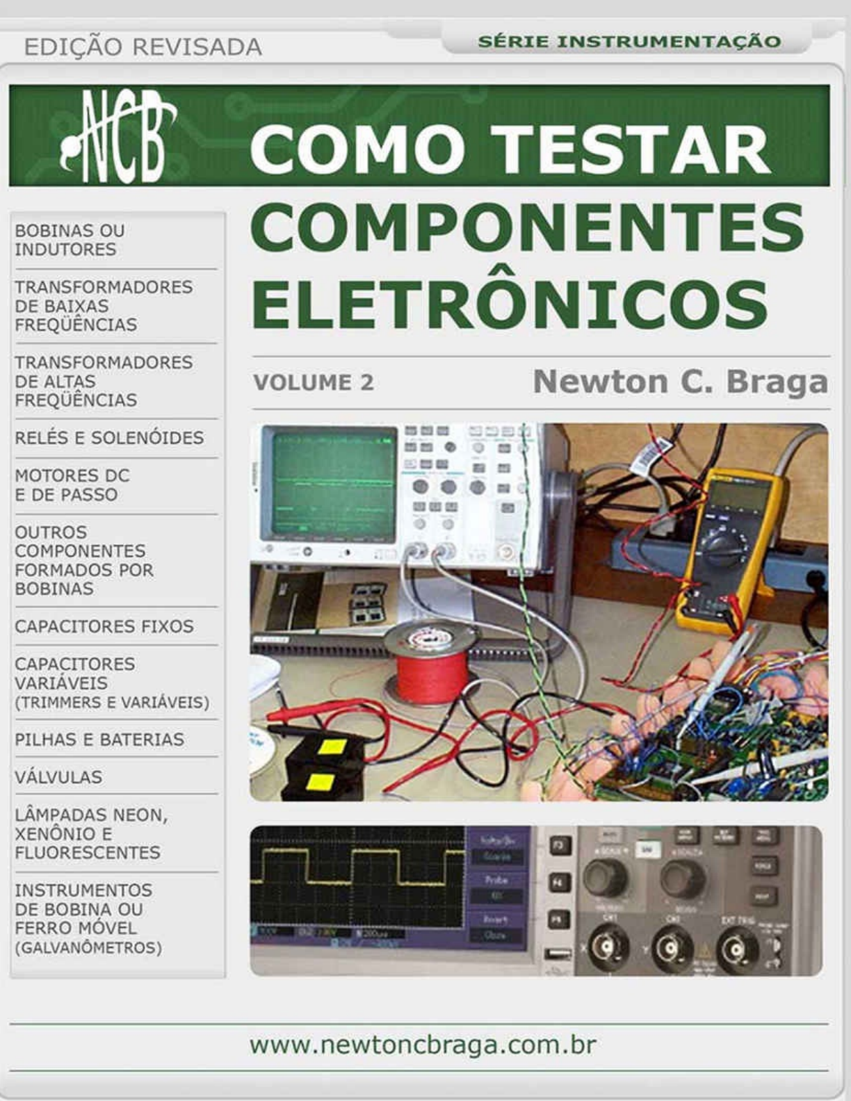Newton C. Braga COMO TESTAR COMPONENTES ELETRÔNICOS VOLUME 2 EDIÇÃO REVISADA São Paulo - 2016 Institute NCB www.newtoncbraga.com leitor@newtoncbraga.com.br Autor: Newton C. Braga São Paulo - Brasil - 2016 Palavras-chave: Eletrônica - Reparo - Service - Componentes - Elétrica Diretor responsável: Newton C. Braga Diagramação e Coordenação: Renato Paiotti MAIS INFORMAÇÕES INSTITUTO NEWTON C. BRAGA http://www.newtoncbraga.com.br NOTA IMPORTANTE Esta série de livros fornece conhecimentos básicos de eletrônica para cursos regulares, cursos a distância e para autodidatas consistindo, portanto numa literatura cuja finalidade é apoio, iniciação ou complementação de conhecimentos. Sua aquisição não implica no direito a obtenção de certificados ou diplomas os quais devem ser emitidos pelas instituições que adotam o livro ou ainda ministram cursos de outras formas. Da mesma forma o autor ou a editora não se responsabilizam por eventuais problemas que possam ser causados pelo uso indevido das informações nele contidas como o não funcionamento de projetos, ferimentos ou danos causados a terceiros de forma acidental ou proposital, ou ainda prejuízos de ordem moral ou financeira. Os eventuais experimentos citados quando realizados por menores devem ter sempre a supervisão de um adulto. Todo cuidado foi tomado para que o material utilizado seja encontrado com facilidade na época da edição do livro, mas as mudanças tecnológicas são muito rápidas o que nos leva a não nos responsabilizarmos pela eventual dificuldade em se obter componentes para os experimentos quando indicados em outros livros desta série. http://www.newtoncbraga.com.br Índice CONSIDERAÇÕES INICIAIS INTRODUÇÃO 1 - COMPONENTES COM BOBINAS 1.1 - Bobinas ou Indutores 1.2 - Transformadores de Baixas Frequências 1.3 – Transformadores de Altas Frequências 1.4 – Relés e Solenoides 1.5 – Motores DC e de Passo 1.6 – Outros Componentes Formados por Bobinas 2 - COMPONENTES DE CARGAS ELÉTRICAS 2.1 - Capacitores Fixos 2.2 –Capacitores variáveis (trimmers e variáveis) 2.3 – Pilhas e Baterias 3 - COMPONENTES COM FILAMENTOS 3.1 – Válvulas 3.2 – Lâmpadas neon, xenônio e fluorescentes 4 - COMPONENTES COM BOBINA/FERRO MÓVEL 4.1 – Instrumentos de Bobina ou Ferro Móvel (galvanômetros) LIVROS TÉCNICOS Considerações Iniciais Esta série de livros visa ensinar como testar componentes eletrônicos comuns usando instrumentação acessível, como o multímetro, provador de continuidade, osciloscópio e outros. A série aborda em linguagem simples como proceder em cada caso. Sugerimos que o leitor veja antes o primeiro volume, se ainda não conhece os procedimentos para uso dos principais tipos de instrumentos eletrônicos de teste. Também complementam os procedimentos descritos neste livros diversos artigos existentes no seu site (www.newtoncbraga.com.br) na seção de instrumentação e de circuitos simulados. Os quatro volumes abordarão os seguintes assuntos: Volume 1 – Os instrumentos (multímetro, osciloscópio, provador de continuidade, traçador de curvas, etc.) Volume 2 – Componentes passivos (resistores, capacitores, indutores, etc..) Volume 3 – Semicondutores e outros dispositivos - I (diodos, LEDs, zeners, sensores, etc.) Volume 4 – Semicondutores - II (tiristores, transistores, circuitos integrados, etc.) COMO TESTAR COMPONENTES http://www.newtoncbraga.com.br/ http://www.newtoncbraga.com.br/index.php/biblioteca-do-instituto/4810-como-testar-componentes-eletronicos.html http://www.newtoncbraga.com.br/index.php/biblioteca-do-instituto/4998-como-testar-componentes-eletronicos-volume-2.html http://www.newtoncbraga.com.br/index.php/biblioteca-do-instituto/5144-como-testar-componentes-eletronicos-volume-3.html http://www.newtoncbraga.com.br/index.php/biblioteca-do-instituto/5210-como-testar-componentes-eletronicos-volume-4.html Introdução No volume anterior vimos como testar alguns componentes passivos comuns, como os cabos, resistores, LDRs e outros. No entanto, existem muitos outros componentes passivos importantes, usados nas montagens eletrônicas e mesmo eletrotécnicas. Continuamos com a sequência de testes ensinando como provar dois tipos importantes de componentes passivos. Os que se baseiam em fios enrolados ou bobinas tais como os reatores ou bobinas, transformadores e pequenos motores assim como componentes do grupo dos capacitores. Esses componentes possuem características bem diferentes, pois enquanto os que se baseiam em bobinas estão bons quando apresentam baixas resistências, os capacitores são considerados bons quando apresentam resistências muito altas ou mesmo infinitas. Para a prova desses componentes podemos usar instrumentos como o multímetro, provador de continuidade e em alguns casos até mesmo a lâmpada de prova. Também podemos realizar provas sofisticadas com circuitos de simulação, gerador de sinais e o osciloscópio. O uso do osciloscópio na análise das características de um capacitor, na verdade, vai além da simples prova. Podemos medir sua capacitância com alguma precisão, determinar eventuais problemas de qualidade (fator Q), o que pode ser muito interessante quando pensamos no caráter didático da aplicação. Trata-se de uma ótima forma de se programar um exercício de uso do osciloscópio nesse tipo de análise. Para esse caso faremos as simulações dos circuitos no Multisim de modo que o leitor possa visualizar as formas de sinais que devem ser obtidas nos testes de capacitores com o osciloscópio. Sugerimos consultar o site para informações sobre o uso do Multisim ou o próprio livro do autor sobre este assunto. 1 - COMPONENTES COM BOBINAS 1.1 - Bobinas ou Indutores O que são As bobinas ou indutores são componentes formados por voltas de fios esmaltados em formas que podem ou não ter núcleos de metal. Na figura 1 temos os símbolos e os aspectos dos principais tipos de bobinas que podemos encontrar nas diver