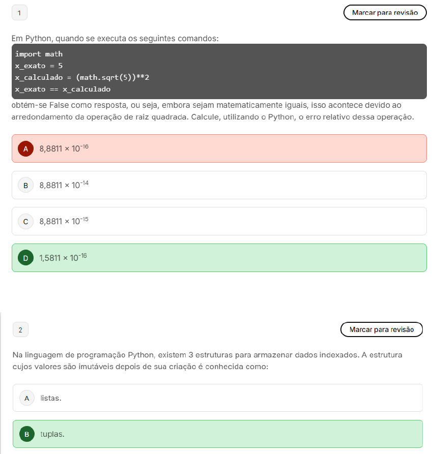 1 Marcar para revisão Em Python quando se executa os seguintes comandos: import math x_exato = 5 x_calculado = (math.sqrt(5))**2 x_exato == x_calculado obtém-se False como resposta, ou seja, embora sejam matematicamente iguais, isso acontece devido ao arredondamento da operação de raiz quadrada. utilizando o Python, o erro relativo dessa operação. A 8,8811 10-16 B 8,8811 10-14 C 8,8811 10-15 D 2 Marcar para revisão Na linguagem de programação Python, existem 3 estruturas para armazenar dados indexados. A estrutura cujos valores são imutáveis depois de sua criação é conhecida como: A listas. B tuplas.3 Marcar para revisão Sabendo-se que a=3, b=5 e c='3', assinale a alternativa que possui uma expressão em cujo resultado compilador Python será True. A a>b B a=b C a == D b>c E a != C 4 Marcar para revisão Qual é formato principal de declarar e formatar string no Python 3? A Aspas simples e Aspas duplas 1 Marcar para revisão Seja uma matriz A de ordem 30x30, foi realizada uma decomposição LU, a soma dos elementos da diagonal principal da matriz L é: A 26 B 27 C 28 D 29 E 302 Marcar para revisão (CESGRANRIO/2011 - Adaptada) Métodos numéricos são fundamentais para a resolução de sistemas lineares. Dentre os métodos diretos utilizados para a resolução de sistemas de equações lineares, estão os de A Eliminação de Gauss e de 3 Marcar para revisão Durante uma competição esportiva universitária, duas equipes precisam negociar para evitar conflitos e assegurar um ambiente saudável para todos os participantes. Como pensamento crítico e a análise sistêmica podem contribuir para uma negociação mais eficaz? A Enfatizando os interesses individuais de cada equipe. B Ignorando as demandas da equipe oposta para manter a competitividade. Buscando um consenso que respeite o interesse de ambas as equipes. 4 Marcar para revisão Uma empresa familiar tradicional, conhecida por seus produtos de alta qualidade, está enfrentando uma forte concorrência de empresas mais modernas e inovadoras. A diretoria decide formar um grupo de trabalho para propor soluções que revitalizem a marca e a tornem mais competitiva. Um dos membros do grupo apresenta uma ideia radical: abandonar completamente a produção dos produtos tradicionais e focar em um novo nicho de mercado, totalmente diferente do atual. A Conformismo: Manter a produção dos produtos tradicionais, ignorando as mudanças no mercado. B Radicalismo: Adotar a nova ideia imediatamente, abandonando completamente legado da empresa. Equilíbrio: Analisar cuidadosamente as vantagens e desvantagens de ambas as opções, buscando um C ponto de equilíbrio entre tradição e inovação. 5 Marcar para revisão Em um debate sobre ética empresarial, sua equipe precisa decidir como lidar com um fornecedor envolvido em práticas trabalhistas questionáveis, que impactam a imagem da empresa. Qual fator é mais importante na tomada de decisão ética neste caso? A Focar exclusivamente nos lucros gerados pelo fornecedor. B Considerar as consequências da associação com o fornecedor na reputação da empresa.6 Marcar para revisão que o pensamento crítico possibilita para a análise de problemas na vida cotidiana? A Eliminar completamente os erros ao tomar decisões. B Realizar uma análise automática de todos os cenários. C Identificar e suposições para explorar novas perspectivas. 7 Marcar para revisão o método de Gauss-Jordan transforma a matriz A do sistema Ax=b, em uma matriz: A Triangular superior. B Triangular inferior. C Tridiagonal. D Identidade. 1 Marcar para revisão Assinale a única alternativa que apresenta valor da integral de -x2 no intervalo de 0 a 1. Divida o intervalo de integração em 10 partes. Utilize método dos Retângulos: A -0,333 2 Marcar para revisão Assinale a ÚNICA alternativa que apresenta valor da integral de x2 - cos(x) no intervalo de 1 a 2. Utilize o método de Romberg, com aproximação até in = 2: A 2,265513 Marcar para revisão Assinale a única alternativa que apresenta o valor da integral de no intervalo de 0 a 1. Utilize método de Romberg, com aproximação até A 0,27268 Assinale a única alternativa que apresenta o valor da integral de e-x no intervalo de 0 a 1. Divida o intervalo de integração em 10 partes. Utilize o método de Simpson: A 0,632 Assinale a única alternativa que apresenta o valor da integral de cos(-x) no intervalo de 0 a 1. Divida o intervalo de integração em 10 partes. Utilize o método dos Trapézios: A 0,841 B 0,741 6 Marcar para revisão Assinale a única alternativa que apresenta o valor da integral de X - cos(x) no intervalo de 1 a 2. Utilize o método de Romberg, com aproximação até = 2: A 1,43217 7 Marcar para revisão Assinale a única alternativa que apresenta o valor da integral de cos(-x) no intervalo de 0 a 1. Divida o intervalo de integração em 10 partes. Utilize o método dos Retângulos: A 0,842 8 Marcar para revisão Assinale a ÚNICA alternativa que apresenta o valor da integral de no intervalo de 1 a 2. Utilize o método de Romberg, com aproximação até in = 2: A 0,916519 Marcar para revisão Assinale a única alternativa que apresenta valor da integral de X - cos(x) no intervalo de 0 a 1. Utilize método de Romberg, com aproximação até = 2: A -0,34147 10 Marcar para revisão Assinale a única alternativa que apresenta valor da integral de sen(x) no intervalo de 0 a 1. Utilize método de Romberg, com aproximação até n = 2: A 0,45970 1 Marcar para revisão Assinale a ÚNICA alternativa que apresenta valor de y(3) em face da resolução da EDO de ordem y' = cos(y) + sen(y), sendo y(0) = 0,2. Considere h = 0,30. Utilize método de Runge-Kutta: A 2,303 2 Marcar para revisão Assinale a ÚNICA alternativa que apresenta valor de y(3) em face da resolução da EDO de ordem y' = cos(y) + sen(y), sendo y(0) = 0,3. Considere h = 0,30. Utilize método de Runge-Kutta: A 2,309 3 Marcar para revisão Assinale a ÚNICA alternativa que apr