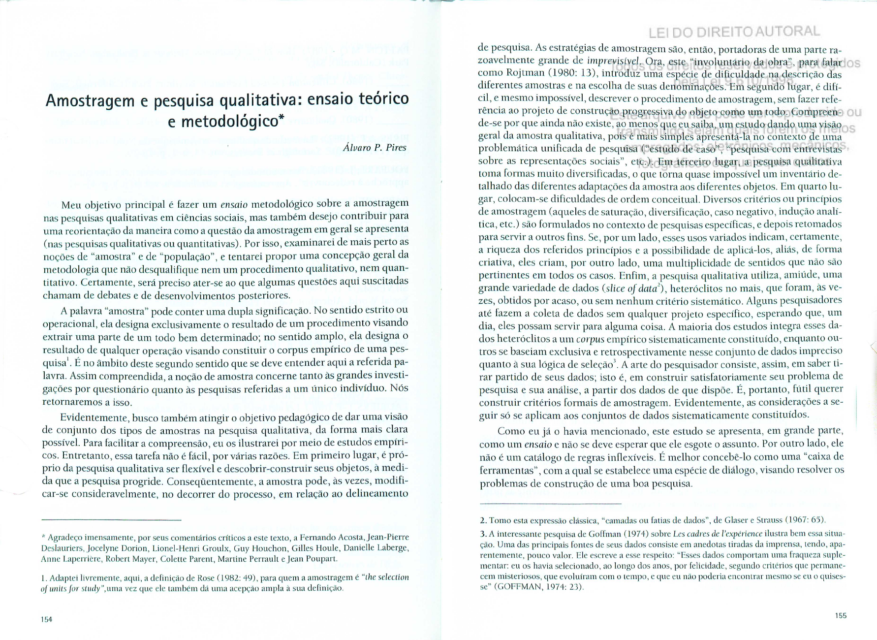 LEI DO DIREITO AUTORAL de pesquisa. As estratégias de amostragem são, então, portadoras de uma parte ra- zoavelmente grande de imprevisível. Ora, este para falar como Rojtman (1980: 13), introduz uma espécie de dificuldade na descrição das diferentes amostras e na escolha de suas denominações. Em segundo lugar, é difí- Amostragem e pesquisa qualitativa: ensaio teórico cil, e mesmo impossível, descrever procedimento de amostragem, sem fazer refe- rência ao projeto de construção progressiva do objeto como um todo. ou e metodológico* de-se por que ainda não existe, ao menos que eu um estudo dando uma visão geral da amostra qualitativa, pois e mais simples no contexto de uma Álvaro P. Pires problemática unificada de pesquisa de entrevistas sobre as representações sociais", etc.) terceiro pesquisa qualitativa toma formas muito diversificadas, o que torna quase impossível um inventário de- talhado das diferentes adaptações da amostra aos diferentes objetos. Em quarto lu- Meu objetivo principal é fazer um ensaio metodológico sobre a amostragem gar, colocam-se dificuldades de ordem conceitual. Diversos critérios ou princípios nas pesquisas qualitativas em ciências sociais, mas também desejo contribuir para de amostragem (aqueles de saturação, diversificação, caso negativo, indução uma reorientação da maneira como a questão da amostragem em geral se apresenta tica, etc.) são formulados no contexto de pesquisas específicas, e depois retomados (nas pesquisas qualitativas ou quantitativas). Por isso, examinarei de mais perto as para servir a outros fins. Se, por um lado, esses usos variados indicam, certamente, noções de "amostra" e de "população", e tentarei propor uma concepção geral da a riqueza dos referidos princípios e a possibilidade de aplicá-los, aliás, de forma metodologia que não desqualifique nem um procedimento qualitativo, nem quan- criativa, eles criam, por outro lado, uma multiplicidade de sentidos que não são titativo. Certamente, será preciso ao que algumas questões aqui suscitadas pertinentes em todos os casos. Enfim, a pesquisa qualitativa utiliza, amiúde, uma grande variedade de dados (slice of heteróclitos no mais, que foram, às ve- chamam de debates e de desenvolvimentos posteriores. zes, obtidos por acaso, ou sem nenhum critério sistemático. Alguns pesquisadores A palavra "amostra" pode conter uma dupla significação. No sentido estrito ou até fazem a coleta de dados sem qualquer projeto específico, esperando que, um operacional, ela designa exclusivamente o resultado de um procedimento visando dia, eles possam servir para alguma coisa. A maioria dos estudos integra esses da- extrair uma parte de um todo bem determinado; no sentido amplo, ela designa o dos heteróclitos a um corpus empírico sistematicamente constituído, enquanto ou- resultado de qualquer operação visando constituir o corpus empírico de uma pes- tros se baseiam exclusiva e retrospectivamente nesse conjunto de dados impreciso É no âmbito deste segundo sentido que se deve entender aqui a referida pa- quanto à sua lógica de A arte do pesquisador consiste, assim, em saber ti- lavra. Assim compreendida, a noção de amostra concerne tanto às grandes investi- rar partido de seus dados; isto é, em construir satisfatoriamente seu problema de gações por questionário quanto às pesquisas referidas a um único indivíduo. Nós pesquisa e sua análise, a partir dos dados de que dispõe. É, portanto, fútil querer retornaremos a isso. construir critérios formais de amostragem. as considerações a se- Evidentemente, busco também atingir o objetivo pedagógico de dar uma visão guir só se aplicam aos conjuntos de dados sistematicamente constituídos. de conjunto dos tipos de amostras na pesquisa qualitativa, da forma mais clara Como eu já o havia mencionado, este estudo se apresenta, em grande parte, possível. Para facilitar a compreensão, eu os ilustrarei por meio de estudos empíri- como um ensaio e não se deve esperar que ele esgote o assunto. Por outro lado, ele cos. Entretanto, essa tarefa não é fácil, por várias razões. Em primeiro lugar, é pró- não é um catálogo de regras inflexíveis. É melhor concebê-lo como uma "caixa de prio da pesquisa qualitativa ser flexível e seus objetos, à medi- ferramentas", com a qual se estabelece uma espécie de diálogo, visando resolver os da que a pesquisa progride. Conseqüentemente, a amostra pode, às vezes, modifi- problemas de construção de uma boa pesquisa. car-se consideravelmente, no decorrer do processo, em relação ao delineamento 2. Tomo esta expressão clássica, "camadas ou fatias de dados", de Glaser e Strauss (1967: 65). * Agradeço imensamente, por seus comentários críticos a este texto, a Fernando Acosta, Jean-Pierre 3. A interessante pesquisa de Goffman (1974) sobre Les cadres de l'expérience ilustra bem essa situa- Deslauriers, Jocelyne Dorion, Lionel-Henri Groulx, Guy Houchon, Gilles Houle, Danielle Laberge, ção. Uma das principais fontes de seus dados consiste em anedotas tiradas da imprensa, tendo, apa- Anne Laperrière, Robert Mayer, Colette Parent, Martine Perrault e Jean Poupart. rentemente, pouco valor. Ele escreve a esse respeito: "Esses dados comportam uma fraqueza suple- mentar: eu os havia selecionado, ao longo dos anos, por felicidade, segundo critérios que permane- 1. Adaptei livremente, aqui, a definição de Rose (1982: 49), para quem a amostragem é "the selection cem misteriosos, que evoluíram com o tempo, e que eu não poderia encontrar mesmo se eu quises- of units for study" vez que ele também dá uma acepção ampla à sua definição. se" (GOFFMAN, 1974: 23). 155 154LEI DO DIREITO AUTORAL Explicitemos, desde o início, três premissas deste estudo. A primeira é que a quem todas as amostras qualitativas na categoria geral dita "amostra teórica", ou qualidade científica de uma pesquisa não depende do tipo de amostra, e também não