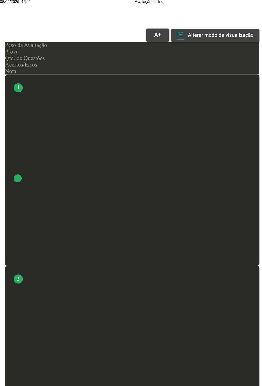 Prova Impressa GABARITO | Avaliação II - Individual (Cod.:1018950) Peso da Avaliação 2,00 Prova 96538177 Qtd. de Questões 10 Acertos/Erros 9/1 Nota 9,00 [Laboratório Virtual – Variáveis Quantitativas e Qualitativas] Para Vieira (2018), “variável é uma condição ou característica que descreve uma pessoa, um animal, um lugar, um objeto, uma ideia”. As variáveis qualitativas são expressas por palavras; já as variáveis quantitativas, por números, inclusive, cada uma dessas variáveis, podem ser classificadas em dois tipos. Nesse sentido, como são classificadas as variáveis quantitativas? Fonte: VIEIRA, S. Estatística básica. 2. ed. São Paulo: Cengage, 2018. A Discretas e Contínuas. B Nominais e Discretas. C Nominais e Ordinais. D Contínuas e Ordinais. Os gráficos estatísticos são elementos empregados dentro do método estatístico, que têm por objetivo apresentar os dados obtidos através da pesquisa estatística. Esse elemento tem como vantagem uma melhor visualização dos dados, facilitando a interpretação do comportamento da variável em estudo. Considerando o exposto, analise as sentenças a seguir: I- O gráfico por setores também é conhecido como gráfico de pizza. II- Os gráficos substituem totalmente o uso das tabelas, ou seja, utilizando gráficos podemos deixar de lado o emprego de tabelas. III- O gráfico de linhas consiste em um conjunto de colunas ou barras que representam o comportamento da variável em estudo. IV- Somente obtemos as informações necessárias para construir os gráficos de cálculos matemáticos. Assinale a alternativa CORRETA: A Somente a sentença III está correta. VOLTAR A+ Alterar modo de visualização 1 2 08/04/2025, 16:11 Avaliação II - Individual about:blank 1/5 B As sentenças II e IV estão corretas. C As sentenças I e IV estão corretas. D Somente a sentença I está correta. Para que os dados de uma pesquisa estatística sejam resumidos, pode se utilizar séries estatísticas, distribuição de frequência simples ou de intervalos de classes. Isso pode ser feito por meio de tabelas, o tipo de tabela a ser utilizada depende das peculiaridades da variável estudada: tabelas de frequência simples são indicadas para variáveis qualitativas e variáveis quantitativas discretas, enquanto as tabelas de intervalos de classe são indicadas para variáveis quantitativas contínuas. Existe uma outra maneira pela qual os dados de uma pesquisa podem ser apresentados. Que forma é essa? A Tabelas dinâmicas. B Resumos estatísticos. C Gráficos estatísticos. D Síntese de Resultados. Há estudos que apontam um crescimento exponencial na criação e na utilização dos dados virtuais, de modo que, ao longo dos últimos dez anos, foram criados mais dados do que em toda a história humana. Para transformar esses dados em informações úteis para a tomada de decisão, o que é necessário? A Organização e estruturação dos dados. B Planejamento e organização dos dados. C Fontes de obtenção de dados. D Sistemas computacionais para identificação dos dados. Para melhor interpretar e avaliar dados estatísticos, podemos utilizar as Medidas de Tendência Central e as Medidas de Dispersão. Medida de Tendência Central é um valor único que tenta descrever as características de um conjunto de dados, identificando uma posição central dentro do conjunto de dados, já as de dispersão avaliam o quanto que os valores de uma série contornam este "centro". Sobre as Medidas de Tendência Central, analise as opções a seguir: I- Média. II- Mediana. III- Desvio padrão. IV- Coeficiente de variação. V- Moda. Assinale a alternativa CORRETA: 3 4 5 08/04/2025, 16:11 Avaliação II - Individual about:blank 2/5 A As opções III e IV estão corretas. B As opções I, II e V estão corretas. C As opções I, II e IV estão corretas. D As opções II, III e V estão corretas. A qualidade é hoje uma das principais estratégias competitivas nas diversas empresas e nos diversos setores. A qualidade está intimamente ligada à produtividade, à melhoria de resultados e ao aumento de lucros, por meio de redução de perdas e do desperdício, do envolvimento de todos na empresa e consequente motivação. Uma indústria de componentes eletrônicos verificou durante uma semana (de segunda a sábado) o número de defeitos de seus aparelhos, obtendo, respectivamente, os seguintes resultados: 2 - 9 - 8 - 5 - 7 - 5. Considerando esses dados, analise as sentenças a seguir: I- A média foi 6 no período de componentes com defeitos. II- A moda dos dados obtidos é 5. III- A mediana da pesquisa é 3. IV- O coeficiente de variação calculado foi de 2,1. Assinale a alternativa CORRETA: A As sentenças I e III estão corretas. B As sentenças II e IV estão corretas. C As sentenças I e II estão corretas. D As sentenças II e III estão corretas. Revisar Conteúdo do Livro 6 08/04/2025, 16:11 Avaliação II - Individual about:blank 3/5 O conceito do Big Data pode ser avaliado dentro de uma terminologia chamada de 6 Vs (seis "V"). Esse tema tem sido amplamente discutido na indústria da computação como fatores determinantes que definem o Big Data. Um desses Vs se chama veracidade. Sobre o que esse termo diz respeito, assinale a alternativa CORRETA: A O termo veracidade diz respeito à velocidade em que os dados são gerados. B O termo veracidade aborda sobre o valor que os dados podem fornecer a um negócio. C O termo veracidade consiste na precisão e confiabilidade dos dados. D O termo veracidade diz respeito à previsibilidade com que os dados são gerados e consumidos. Há estudos que apontam um crescimento exponencial na criação e na utilização dos dados virtuais, de modo que, ao longo dos últimos dez anos, foram criados mais dados do que em toda a história humana. Para transformar esses dados em informações úteis para a tomada de decisão, o que é necessário? A Big Data. B Big Apple. C Big Job. D Big Plan. De acordo com L