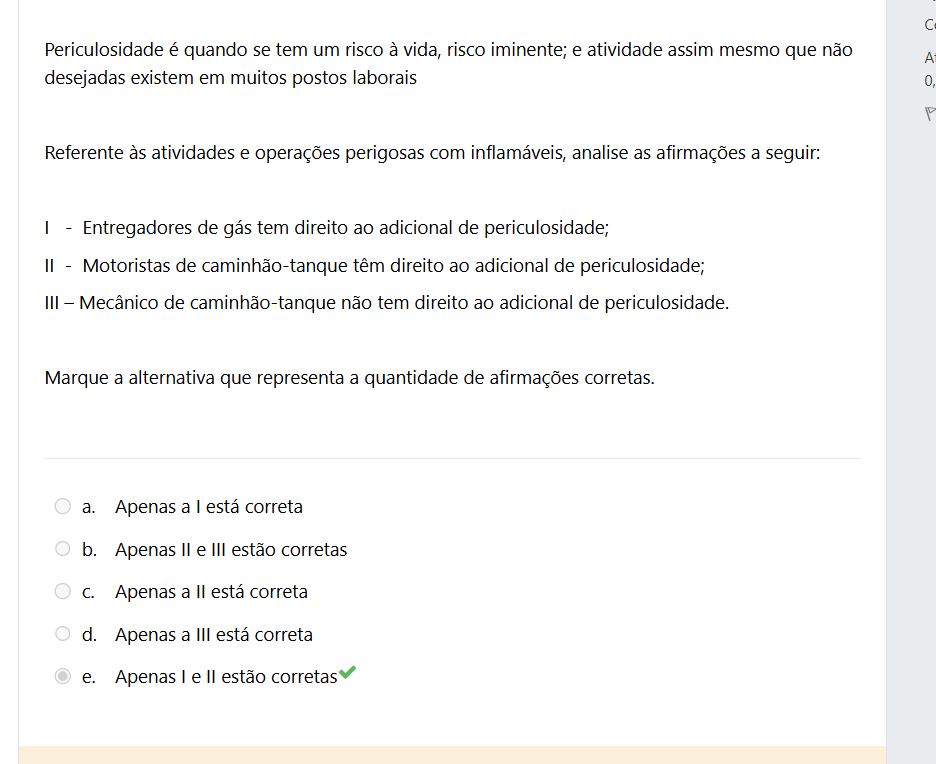 Periculosidade é quando se tem um risco à vida, risco iminente; e atividade assim mesmo que não desejadas existem em muitos postos laborais Referente às atividades e operações perigosas com inflamáveis, analise as afirmações a seguir: - Entregadores de gás tem direito ao adicional de periculosidade; - Motoristas de caminhão-tanque têm direito ao adicional de periculosidade; III - Mecânico de caminhão-tanque não tem direito ao adicional de periculosidade. Marque a alternativa que representa a quantidade de afirmações corretas. a. Apenas a está correta b. Apenas II e III estão corretas C. Apenas a II está correta d. Apenas a III está correta e. Apenas e II estão corretas