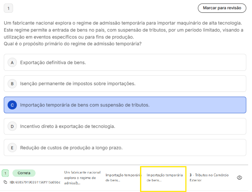 1 Marcar para revisão Um fabricante nacional explora regime de admissão temporária para importar de alta tecnologia. Este regime permite a entrada de bens no país, com suspensão de tributos, por um período limitado, visando a utilização em eventos específicos ou para fins de produção. Qual é propósito primário do regime de admissão temporária? A Exportação definitiva de bens. B Isenção permanente de impostos sobre importações. C Importação temporária de bens com suspensão de tributos. D Incentivo direto à exportação de tecnologia. E Redução de custos de produção a longo prazo. 1 Correta Um fabricante nacional Importação Importação 3 - Tributos no Comércio explora o regime de de bens.. de bens.. Exterior ID: admiss&...2 Marcar para revisão Uma companhia de comércio exterior está considerando usar regime de exportação temporária para enviar uma remessa de equipamentos para uma feira internacional. Este regime permite enviar bens para o exterior temporariamente, sem pagamento de tributos, com a condição de retorno ao país.Qual é a característica fundamental do regime de exportação temporária? A Isenção permanente de impostos na exportação. B Suspensão de tributos na exportação temporária de bens. C Redução de custos logísticos para exportações permanentes. D Aumento de quotas de exportação. E Eliminação total de processos aduaneiros. 2 Correta Uma companhia de Suspensão de tributo Suspensão de tributos 3 Tributos no Comércio comércio exterior ID: 6585793f0351156f115a07ad na na Exterior est&aacu... 3 Marcar para revisão Uma empresa de tecnologia utiliza o regime de admissão temporária para importar componentes eletrônicos avançados. Esses componentes são necessários para a realização de testes e desenvolvimento de novos produtos, antes de serem reexportados ou nacionalizados. Qual é principal benefício do regime de admissão temporária para a empresa de tecnologia? A Permissão para venda imediata dos componentes importados. B Isenção definitiva de impostos sobre os componentes. C Suspensão temporária de tributos sobre importações para testes. D Aumento direto das quotas de importação de componentes. E Redução de tarifas alfandegárias para exportação dos produtos finais. 3 Correta Uma empresa de Suspensão temporári Suspensão temporária 3 Tributos no Comércio tecnologia utiliza ID: 658579ac0351156f115a0ced de tributos sob.. de tributos sob.. Exterior regime de admi..4 Marcar para revisão Uma empresa brasileira inicia suas operações de exportação, utilizando regime de drawback. Este regime visa a isentar ou suspender tributos incidentes sobre insumos importados usados na produção de bens exportados. A empresa busca entender melhor como esse regime pode beneficiá-la. Qual é a principal vantagem do regime de drawback para empresas exportadoras? A Isenção de impostos sobre produtos finais. B Suspensão temporária de tributos sobre insumos C Redução de tarifas alfandegárias sobre produtos importados. D Aumento de quotas de exportação. E Diminuição de custos logísticos internacionais. 4 Correta Uma empresa brasileira Suspensão Suspensão 3 Tributos no Comércio ID: 658578e70351156f115a01a inicia suas de tributos sob.. de tributos sob... Exterior 5 Marcar para revisão Em uma dissertação sobre estratégias aduaneiras, foco recai sobre as Zonas de Processamento de Exportações (ZPE). autor argumenta que as ZPEs desempenham um papel crucial na promoção das exportações brasileiras, destacando os benefícios fiscais específicos que elas oferecem. Qual benefício fiscal é mais significativo nas Zonas de Processamento de Exportações (ZPE) para impulsionar as exportações? A Créditos fiscais para exportadores. B Isenção de impostos sobre a renda corporativa C Isenção de impostos sobre produtos exportados. D Redução de tarifas de importação de E Subsídios diretos para pesquisa e desenvolvimento.5 Correta 4 os REGIMES Em uma dissertação Isenção de impostos Isenção de impostos ADUANEIROS APLICADOS sobre estrat&eacu... sobre produtos e... sobre produtos e... EM ÁREAS ESPECIAIS 6 Marcar para revisão Em um debate sobre políticas econômicas, um dos tópicos abordados são as Zonas de Processamento de Exportações (ZPE). Um dos debatedores ressalta a função das ZPE na promoção de exportações, citando benefícios fiscais e administrativos específicos. Qual é a principal vantagem oferecida pelas Zonas de Processamento de Exportações (ZPE) às empresas? A Subsídios governamentais para exportações. B Isenção de impostos sobre a renda das empresas. C Créditos fiscais para importação de matérias-primas. D Isenção de impostos de importação sobre insumos industriais. E Redução de taxas aduaneiras para produtos exportados. 6 Correta 4 os REGIMES Em um debate sobre Isenção de impostos de Isenção de impostos de ADUANEIROS APLICADOS ID: 657a19730351156f114cc5de políticas econômic.. importa&ccedi.. importa&ccedi.. EM ÁREAS ESPECIAIS7 Marcar para revisão Em um cenário de comércio internacional, uma empresa importadora enfrenta desafios ao classificar seus produtos. Esta tarefa é crucial para determinar os tributos apropriados e garantir a conformidade com as normas aduaneiras. A classificação incorreta pode levar a multas significativas e atrasos nas operações de importação. Qual das seguintes opções descreve corretamente a importância da classificação tarifária nos regimes aduaneiros especiais? A Define apenas as taxas de frete B É irrelevante para a determinação de tributos. C Determina os tributos e as normas aduaneiras aplicáveis D Estabelece exclusivamente as normas de segurança dos produtos. E Regula unicamente as relações comerciais internacionais. 7 Correta Determina os tributos e Determina os tributos e Em um cenário de 5 Regimes Aduaneiros as normas aduaneiras as normas aduaneiras comércio ID: 658575a4035115
