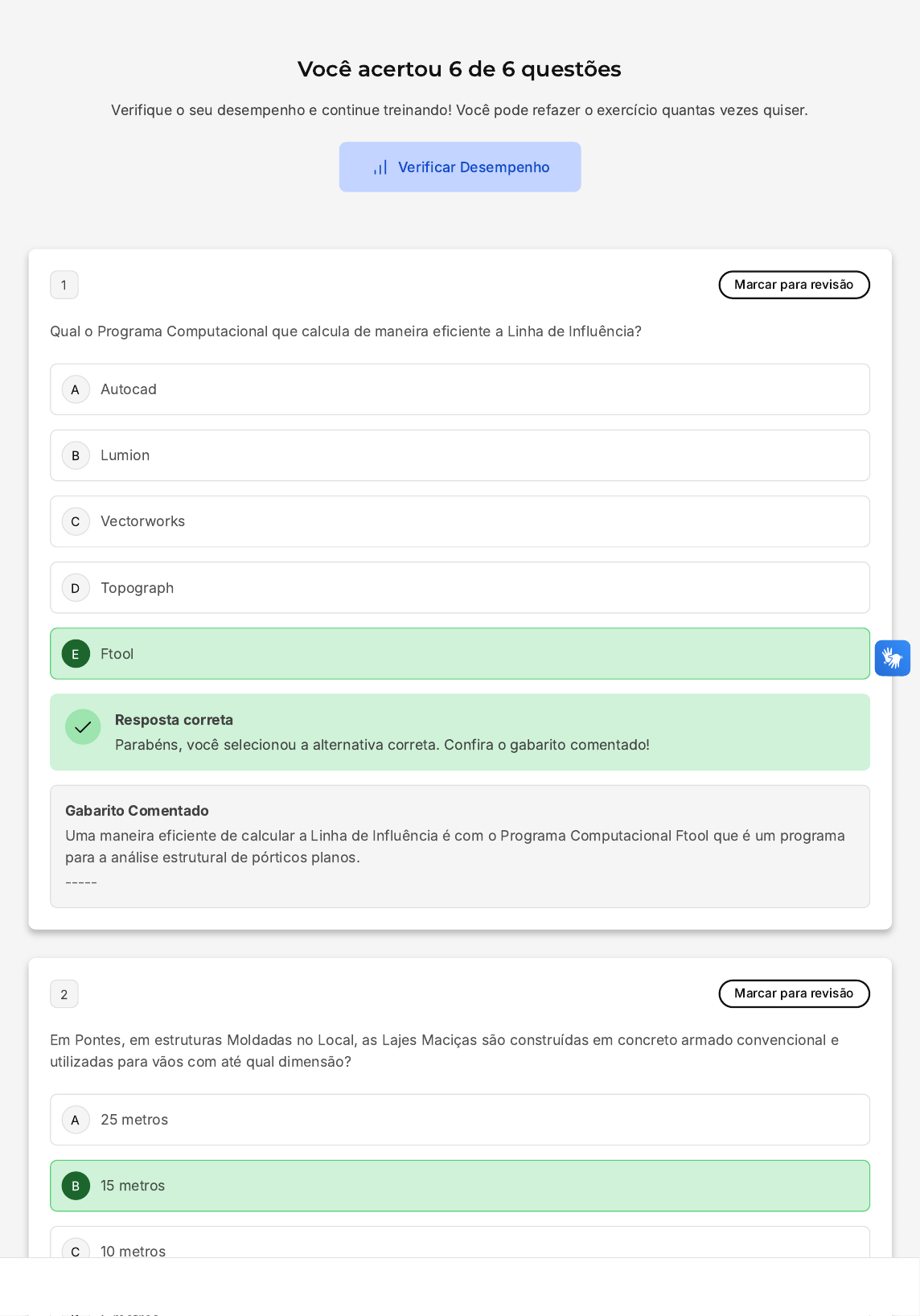 Você acertou 6 de 6 questões Verifique o seu desempenho e continue treinando! Você pode refazer o exercício quantas vezes quiser. Verificar Desempenho A B C D E A B C D 1 Marcar para revisão Qual o Programa Computacional que calcula de maneira eficiente a Linha de Influência? Autocad Lumion Vectorworks Topograph Ftool Resposta correta Parabéns, você selecionou a alternativa correta. Confira o gabarito comentado! Gabarito Comentado Uma maneira eficiente de calcular a Linha de Influência é com o Programa Computacional Ftool que é um programa para a análise estrutural de pórticos planos. ----- 2 Marcar para revisão Em Pontes, em estruturas Moldadas no Local, as Lajes Maciças são construídas em concreto armado convencional e utilizadas para vãos com até qual dimensão? 25 metros 15 metros 10 metros 5 metros D E A B C D E A B 5 metros 3 metros Resposta correta Parabéns, você selecionou a alternativa correta. Confira o gabarito comentado! Gabarito Comentado Em Pontes, em estruturas Moldadas no Local, as Lajes Maciças são construídas em concreto armado convencional e utilizadas para vãos com até 15 metros. ----- 3 Marcar para revisão Podem ser consideradas Ações Excepcionais? Explosões Carga dos Veículos Carga Permanente Ação do Vento e da Água Ação do recapeamento asfáltico Resposta correta Parabéns, você selecionou a alternativa correta. Confira o gabarito comentado! Gabarito Comentado As Ações Excepcionais são as que possuem uma curta duração e uma pequena probabilidade da sua ocorrência durante toda vida útil dos elementos construtivos das Lajes do Tabuleiro, mas devem ser previstos no projeto, pois dentre estas ações excepcionais estão o choque de objetos móveis, explosões e desastres naturais. 4 Marcar para revisão Como podem ser classificados os Encontros de Pontes? Podem ser classificados como Encontros Leves e Encontros de Grande Porte. Podem ser classificados como Encontros Leves e Encontros de Pequeno Porte. C D E A B C D E Podem ser classificados como Encontros Pesados e Encontros de Grande Porte. Podem ser classificados como Encontros Leves e Encontros Médios. Podem ser classificados como Encontros Rigidos e Encontros de Grande Porte. Resposta correta Parabéns, você selecionou a alternativa correta. Confira o gabarito comentado! Gabarito Comentado Os Encontros de Pontes podem ser classificados como Encontros Leves e Encontros de Grande Porte. Os Encontros de Pontes podem ser classificados como Encontros Leves e Encontros de Grande Porte. Os Encontros Leves são aqueles que não possuem grande peso e são construídos com materiais leves, como madeira e aço. Os Encontros de Grande Porte são aqueles que possuem grande peso e são construídos com materiais pesados, como concreto e ferro. 5 Marcar para revisão O que são os Esforços nas Lajes do Tabuleiro? São a combinação de ações previstas apenas no Projeto de Pontes Rodoviárias. São a combinação de ações previstas apenas no Projeto de Pontes Ferroviárias São a combinação de ações não previstas apenas no Projeto de Pontes Ferroviárias São a combinação de ações previstas no Projeto de Pontes Rodoviárias e Ferroviárias São a combinação de ações não previstas apenas no Projeto de Pontes Rodoviárias Resposta correta Parabéns, você selecionou a alternativa correta. Confira o gabarito comentado! Gabarito Comentado Os Esforços nas Lajes do Tabuleiro são a combinação de ações previstas no Projeto de Pontes Rodoviárias e Ferroviárias. Os Esforços nas Lajes do Tabuleiro são as ações que atuam sobre as lajes do tabuleiro de uma ponte. Essas ações podem ser de natureza estática ou dinâmica, e podem ser causadas por diversos fatores, como o peso próprio da estrutura, o peso das cargas que trafegam sobre a ponte, o vento, o terremoto, etc. Os Esforços nas Lajes do Tabuleiro são importantes para o projeto de uma ponte, pois eles determinam a resistência necessária da estrutura para suportar as ações que atuarão sobre ela. Os Esforços nas Lajes do Tabuleiro são calculados por meio de métodos de análise estrutural, como o método dos elementos finitos. Os Esforços nas Lajes do Tabuleiro são importantes para garantir a segurança e a estabilidade de uma ponte. A B C D E Os s o ços as ajes do abu e o são po ta tes pa a ga a t a segu a ça e a estab dade de u a po te. ----- 6 Marcar para revisão Quanto aos esforços nas Lajes do Tabuleiro, tratando das Cargas Móveis, os Carros de Passeio pertencem a qual classe? Classe 12 Classe 30 Classe 45 Classe 60 Classe 70 Resposta correta Parabéns, você selecionou a alternativa correta. Confira o gabarito comentado! Gabarito Comentado Quanto aos esforços nas Lajes do Tabuleiro, tratando das Cargas Móveis, os Carros de Passeio pertencem à Classe 12? A resposta correta é a alternativa A, pois a Classe 12 é a classe de veículos mais leve, e os Carros de Passeio são veículos leves.