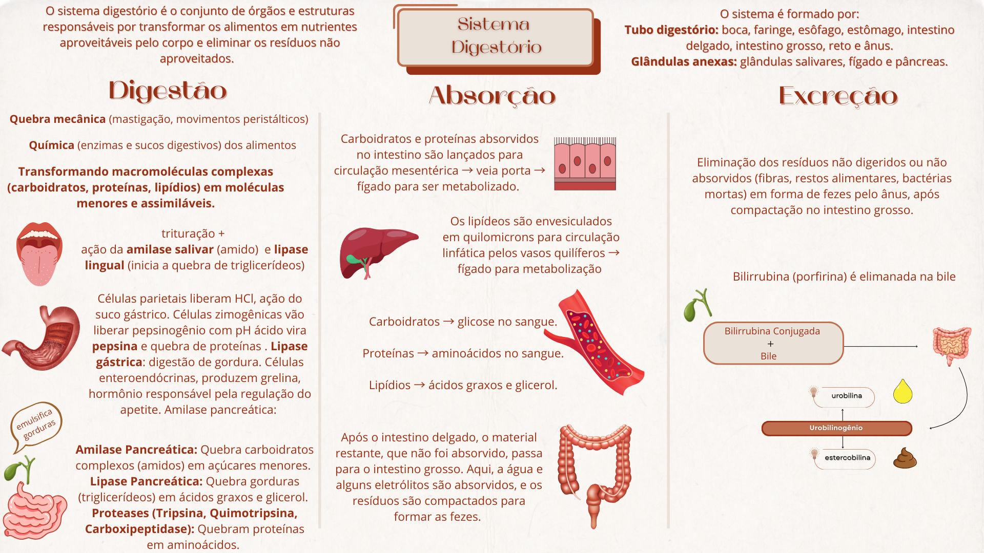 sistema digestório é conjunto de órgãos e estruturas sistema é formado por: responsáveis por transformar os alimentos em nutrientes Sistema Tubo digestório: boca, faringe, esôfago, estômago, intestino aproveitáveis pelo corpo e eliminar resíduos não Digestório delgado, intestino grosso, reto e ânus. aproveitados. Glândulas anexas: glândulas salivares, fígado e pâncreas. Digestão Absorção Excreção Quebra mecânica (mastigação, movimentos peristálticos) Química (enzimas e sucos digestivos) dos alimentos Carboidratos e proteínas absorvidos no intestino são lançados para Eliminação dos resíduos não digeridos ou não Transformando macromoléculas complexas circulação mesentérica veia porta absorvidos (fibras, restos alimentares, bactérias (carboidratos, proteínas, lipídios) em moléculas fígado para ser metabolizado. mortas) em forma de fezes pelo ânus, após menores e assimiláveis. compactação no intestino grosso. Os lipídeos são envesiculados trituração + em quilomicrons para circulação ação da amilase salivar (amido) e lipase linfática pelos vasos quilíferos lingual (inicia a quebra de triglicerídeos) fígado para metabolização Bilirrubina (porfirina) é elimanada na bile Células parietais liberam HCI, ação do suco gástrico. Células zimogênicas vão Carboidratos glicose no sangue. liberar pepsinogênio com pH ácido vira Bilirrubina Conjugada pepsina e quebra de proteínas Lipase + Proteínas aminoácidos no sangue. Bile gástrica: digestão de gordura. Células enteroendócrinas, produzem grelina, Lipídios ácidos graxos e glicerol. hormônio responsável pela regulação do urobilina apetite. Amilase pancreática: Urobilinogênio Após intestino delgado, material Amilase Pancreática: Quebra carboidratos restante, que não foi absorvido, passa estercobilina complexos (amidos) em açúcares menores. para intestino grosso. Aqui, a água e Lipase Pancreática: Quebra gorduras alguns eletrólitos são absorvidos, e os (triglicerídeos) em ácidos graxos e glicerol. resíduos são compactados para Proteases (Tripsina, Quimotripsina, formar as fezes. Carboxipeptidase): Quebram proteínas em aminoácidos.