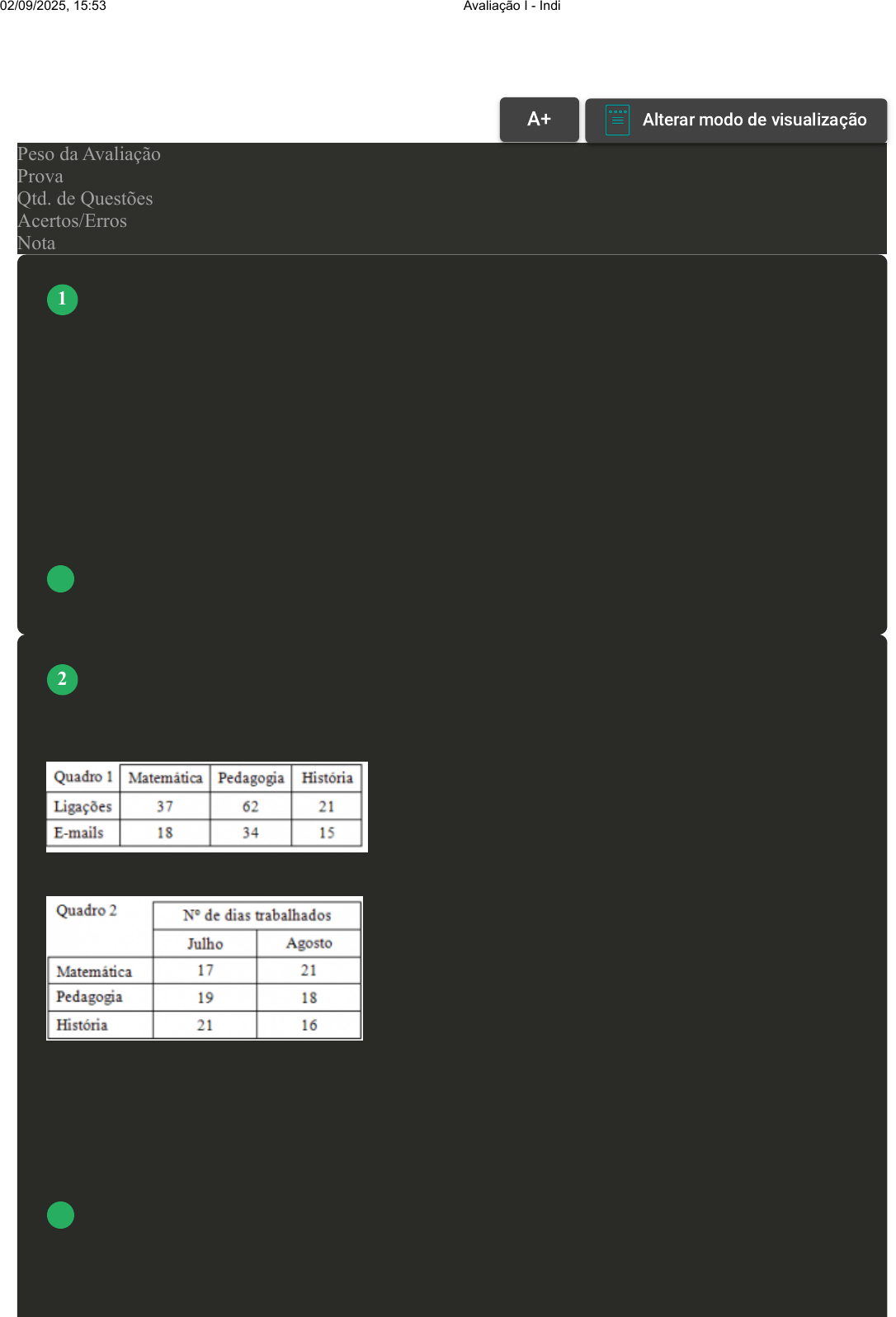 Prova Impressa GABARITO | Avaliação I - Individual (Cod.:1526590) Peso da Avaliação 2,00 Prova 104228713 Qtd. de Questões 10 Acertos/Erros 6/4 Nota 6,00 No desenvolvimento do cálculo com matrizes, realizamos operações matemáticas seguindo regras específicas. Acerca da propriedade comutativa, assinale a alternativa CORRETA: A Para cada matriz A existe uma matriz -A, denominada a oposta de A, cuja soma entre ambas fornecerá a matriz nula de mesma ordem. B Existe uma matriz nula 0 que somada com qualquer outra matriz A de mesma ordem fornecerá a própria matriz A. C Para quaisquer matrizes A, B e C, de mesma ordem mxn, vale a igualdade. D Para quaisquer matrizes A e B, de mesma ordem mxn, vale a igualdade. O serviço de tutoria de uma IES realiza atendimento aos alunos por telefone ou e-mail. O número médio de ligações e e-mails recebido diariamente pelos tutores de Matemática, Pedagogia e História é dado no quadro 1: Considerando que o quadro 2 apresenta o número de dias trabalhados pelos tutores no mês de julho e agosto: Determine o total de atendimentos (ligações e e-mails) realizados pelos tutores nesses dois meses e assinale a alternativa CORRETA: A O total de atendimentos é 7030. B O total de atendimentos é 6854. C O total de atendimentos é 6974. VOLTAR A+ Alterar modo de visualização 1 2 02/09/2025, 15:53 Avaliação I - Individual about:blank 1/6 D O total de atendimentos é 6873. Professor Luiz tem a mania de customizar suas notas para que poucos entendam os resultados. Ele o faz para evitar que os alunos identifiquem as médias dos colegas de forma clara, para assim, evitar constrangimentos. Para o aluno Leonardo, ele anotou as notas de quatro bimestres de Matemática, Estatística, Análise e Cálculo em uma tabela com quatro linhas e quatro colunas, formando a matriz X. Sabe-se que as notas de todos os bimestres têm o mesmo peso, isto é, para calcular a média anual do aluno em cada matéria basta fazer a média aritmética de suas médias bimestrais. Neste sentido, para gerar uma nova matriz cujos elementos representem as médias anuais de um aluno na mesma ordem da matriz apresentada, bastará multiplicar a matriz X por: A Somente a opção II está correta. B Somente a opção III está correta. C Somente a opção I está correta. D Somente a opção IV está correta. Existe um tipo de matriz muito importante na álgebra linear porque ela é o elemento neutro da adição de matrizes. Ou seja, quando você soma uma matriz qualquer com a essa matriz, o resultado é a própria matriz. Desta forma, como é denominada a matriz que tem todos os elementos iguais a zero? A Matriz nula. B Matriz transposta. C Matriz linha. D Matriz oposta. 3 Revisar Conteúdo do Livro 4 02/09/2025, 15:53 Avaliação I - Individual about:blank 2/6 Uma das aplicações que envolvem o cálculo de determinantes de uma matriz de ordem 3 é o cálculo de volume dos vetores escritos na forma matricial. A partir deste cálculo, principalmente na engenharia, podemos projetar a quantidade de material necessário na confecção de peças em geral. Nesta perspectiva, assinale entre as opções, aquela que apresenta o módulo do determinante da matriz A. A 8. B 12. C -12. D -8. Para realizar a discussão de um sistema linear, devemos verificar se o sistema é SPD (possível e determinado), SPI (possível e indeterminado) ou SI (impossível). Baseado nisto, acerca do sistema exposto, x + 3y + 2z = 1 -2x + y + z = -2 -x + 4y + 3z = -1Analise as opções a seguir e assinale a alternativa CORRETA: I. O Sistema é SPI II. O Sistema é SPD III. O Sistema é SI IV. Não é possível discutir o sistema. A Somente a opção II está correta. B Somente a opção III está correta. C Somente a opção IV está correta. D Somente a opção I está correta. Ao realizar o produto entre duas matrizes, devemos saber que o produto de uma matriz por outra não é determinado por meio do produto dos seus respectivos elementos. Precisamos realizar a verificação da possibilidade de resolução procedendo à análise das ordens das matrizes envolvidas. Baseado nisto, observe o produto de duas matrizes: Sobre a matriz resultante da multiplicação, classifique V para as sentenças verdadeiras e F para as falsas: 5 6 Revisar Conteúdo do Livro 7 02/09/2025, 15:53 Avaliação I - Individual about:blank 3/6 ( ) Todos os elementos são nulos. ( ) O produto é possível e a matriz terá apenas uma coluna. ( ) O determinante é zero. ( ) A matriz possui o mesmo número de linhas e colunas. Assinale a alternativa que apresenta a sequência CORRETA: A V - F - F - V. B V - F - F - F. C F - V - F - F. D F - V - F - V. Formulário - Álgebra Linear e VetorialClique para baixar o anexo da questão O escalonamento de uma matriz consiste em transformar uma matriz quadrada numa matriz identidade de mesma ordem, utilizando-se de operações elementares sobre linha de matriz. Torna-se, também, uma ferramenta importante de cálculo de Sistemas Lineares. Então, sobre o escalonamento de uma matriz, leia a questão a seguir e assinale a alternativa CORRETA: A Somente a opção III está correta. B Somente a opção I está correta. C Somente a opção II está correta. D Somente a opção IV está correta. Revisar Conteúdo do Livro 8 Revisar Conteúdo do Livro 02/09/2025, 15:53 Avaliação I - Individual about:blank 4/6 Quando o número de colunas é igual ao número de linhas, dizemos que a matriz é quadrada de ordem n. Considere a matriz A quadrada de ordem 3, em que seus elementos são definidos por aij = i + 2j. Acerca da matriz descrita no enunciado, assinale a alternativa CORRETA: A A matriz possui 5 elementos. B A matriz possui 9 elementos. C A matriz possui 4 elementos. D A matriz possui 3 elementos. Podemos definir matrizes por meio de regras de formação. Algumas das principais regras de formação de matrizes incluem a matriz diagonal, triangular, transposta, entre outras. Porém é possível definir por uma 