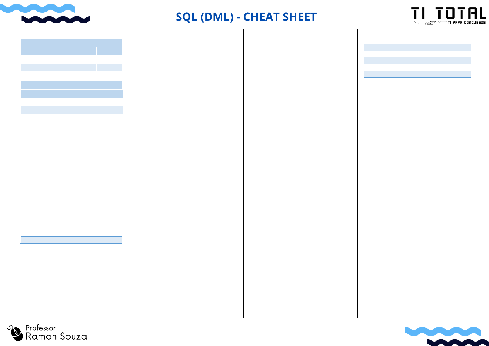 DADOS DE AMOSTRA pais id nome populacao area 1 França 66600000 640680 2 Alemanha 80700000 357000 ... ... ... ... cidade id nome id_pais populacao nota 1 Paris 1 2243000 5 2 Berlin 2 3460000 3 ... ... ... ... ... CONSULTA EM ÚNICA TABELA Buscar todas as colunas da tabela pais: SELECT * FROM pais; Buscar colunas id e nome da tabela cidade: SELECT id, nome FROM cidade; Buscar notas distintas da tabela cidade: SELECT DISTINCT(nota) FROM cidade; FILTRANDO OS RESULTADOS OPERADORES DE COMPARAÇÃO = ou != > > Buscar nome de cidades com nota maior que 3: SELECT nome FROM cidade WHERE nota > 3; Buscar nomes de cidades que não tem nota 5: SELECT nome FROM cidade WHERE nota 5; PADRÃO TEXTUAL LIKE busca um padrão textual em uma coluna. % substitui um nº qualquer de caracteres. _ substitui um único caractere. Buscar nomes de cidades que começam com ‘P’: SELECT nome FROM cidade WHERE nome LIKE 'P%'; Buscar nomes de cidades que começam com qualquer letra seguidos de 'ublin': SELECT nome FROM cidade WHERE nome LIKE '_ublin'; OUTROS OPERADORES BETWEEN busca registros em intervalo. Buscar nomes de cidades que possuam nota no intervalo de 3 a 5: SELECT nome FROM cidade WHERE nota BETWEEN 3 AND 5; IN busca registros em uma lista de valores. Buscar nomes de cidades que possuam nota entre 4 ou 5: SELECT nome FROM cidade WHERE nota IN (4, 5); IS NULL testa se um valor é nulo. Buscar nomes de cidades que não possuam valor em nota: SELECT nome FROM cidade WHERE nota IS NULL; NEGAÇÃO DE CONDIÇÃO Buscar nomes de cidades que não possuam notas 1 e 2: SELECT nome FROM cidade WHERE nota NOT IN (1, 2); COMBINAÇÃO DE CONDIÇÕES Buscar nomes de cidades que possuam nota 5 E população menor que 300 mil: SELECT nome FROM cidade WHERE nota = 5 AND populacao 3 THEN 'Avaliação boa' WHEN nota = 3 THEN 'Avaliacão Média' ELSE 'Avaliação ruim' END AS Classificacao FROM cidade; AGREGAÇÃO E AGRUPAMENTO FUNÇÕES MIN Menor valor de uma coluna MAX Maior valor de uma coluna COUNT Número de linhas AVG Média de valores de coluna numérica SUM Soma de valores de coluna numérica Descobrir o número de cidades: SELECT COUNT(*) FROM cidade; Descobrir o número de cidades sem notas nulas: SELECT COUNT(nota) FROM cidade; Buscar a menor e a maior população dos países: SELECT MIN(populacao), MAX(populacao) FROM pais; GRUPOS GROUP BY agrupa registros que possuem os mesmos valores em colunas especificadas. Buscar a população total de cidades de cada país: SELECT id_pais, SUM(populacao) FROM cidade GROUP BY id_pais; HAVING define uma condição para os grupos, operando com as funções agregadas. Descobrir a classificação média das cidades nos países se a média estiver acima de 3: SELECT id_pais, AVG(nota) FROM cidade GROUP BY id_pais HAVING AVG(nota) > 3; Traduzido e adaptado de LearnSQL.com CONSULTA EM VÁRIAS TABELAS PRODUTO CARTESIANO (CROSS JOIN) O produto cartesiano (ou o CROSS JOIN) faz o cruzamento de todos os pares de linhas das tabelas, independente de correspondência. SELECT * FROM cidade, pais; SELECT * FROM cidade CROSS JOIN pais; cidade pais id nome id_pais id nome 1 Paris 1 1 França 1 Paris 1 2 Alemanha 2 Berlin 2 1 França 2 Berlin 2 2 Alemanha ... ... ... ... ... INNER JOIN (JOIN) O INNER JOIN retorna somente os registros que possuem valores relacionados em ambas as tabelas, isto é, as intersecções. SELECT * FROM cidade INNER JOIN pais ON cidade.id_pais = pais.id; cidade pais id nome id_pais id nome 1 Paris 1 1 França 2 Berlin 2 2 Alemanha 3 Warsaw 4 3 Islândia LEFT JOIN (LEFT OUTER JOIN) O LEFT JOIN retorna todos os registros da tabela da esquerda e os correspondentes da direita. Se não houver correspondência, os campos da direita serão preenchidos com NULL. SELECT * FROM cidade LEFT JOIN pais ON cidade.id_pais = pais.id; cidade pais id nome id_pais id nome 1 Paris 1 1 França 2 Berlin 2 2 Alemanha 3 Warsaw 4 NULL NULL RIGHT JOIN (RIGHT OUTER JOIN) O RIGHT JOIN retorna todos os registros da tabela da direita e os correspondentes da esquerda. Se não houver correspondência, os campos da esquerda serão preenchidos com NULL. SELECT * FROM cidade RIGHT JOIN pais ON cidade.id_pais = pais.id; cidade pais id nome id_pais id nome 1 Paris 1 1 França 2 Berlin 2 2 Alemanha NULL NULL NULL 3 Islândia FULL JOIN (FULL OUTER JOIN) O FULL JOIN retorna todas as linhas de ambas as tabelas. Se não houver correspondência na outra tabela, os valores serão retornados como NULL. SELECT * FROM cidade FULL JOIN pais ON cidade.id_pais = pais.id; cidade pais id nome id_pais id nome 1 Paris 1 1 França 2 Berlin 2 2 Alemanha 3 Warsaw 4 NULL NULL NULL NULL NULL 3 Islândia OPERAÇÕES DE CONJUNTOS Combinam resultados de duas ou mais consultas. ciclistas skatistas id nome pais id nome pais 1 João BR 1 João BR 2 Maria BR 2 Júlio BR 3 Peter US 3 Zaz FR UNION O UNION combina os resultados de dois conjuntos de dados e remove duplicatas. O UNION ALL não remove as duplicatas. Buscar o nome de ciclistas e de skatistas do Brasil: SELECT nome FROM ciclistas WHERE pais = ‘BR’ UNION / UNION ALL SELECT nome FROM skatistas WHERE pais = ‘BR’ INTERSECT O INTERSECT retorna somente as linhas que aparecem em ambos os resultados. Buscar o nome dos brasileiros que são ciclistas e skatistas: SELECT nome FROM ciclistas WHERE pais = ‘BR’ INTERSECT SELECT nome FROM skatistas WHERE pais = ‘BR’ EXCEPT O EXCEPT retorna linhas que aparecem no primeiro resultado e não aparecem no segundo. Buscar o nome dos brasileiros ciclistas que não são skatistas: SELECT nome FROM ciclistas WHERE pais = ‘BR’ EXCEPT SELECT nome FROM skatistas WHERE pais = ‘BR’ SUBCONSULTAS Uma subconsulta é uma consulta aninhada dentro de outra consulta ou dentro de outra subconsulta. VALORES SIMPLES Retorna exatamente uma coluna e uma linha. Ela pode ser usada com operadores de comparação como =, , ou >=. Buscar cidades com a mesma nota de Paris: SELECT nome FROM cidade WHERE nota = ( SELECT nota FROM cidade WHERE nome = 'P