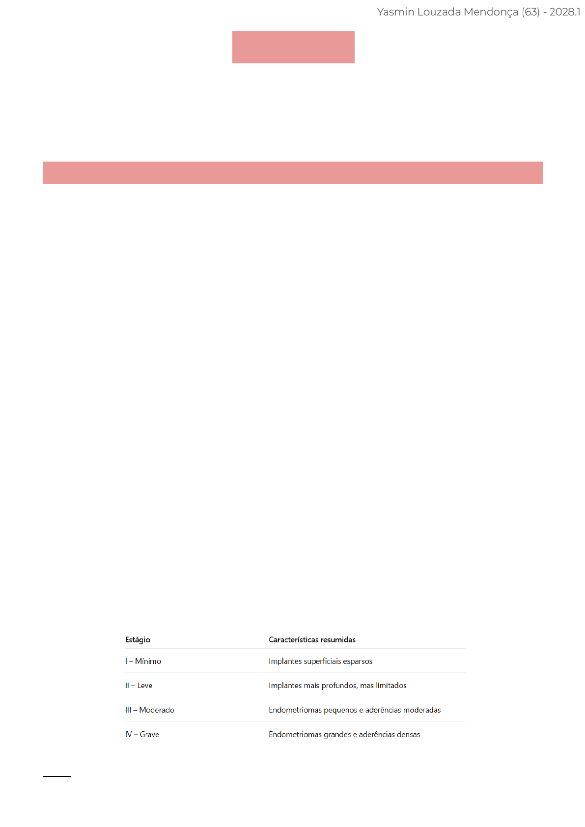 Endometriose. ➔ Condição inflamatória crônica caracterizada pela presença de tecido semelhante ao endométrio (glândulas e estroma endometrial) fora da cavidade uterina. ➔ Locais mais acometidos: ovário, fundo da vagina, ligamentos útero sacro, largo, trompas, bexiga, intestino, órgãos pélvicos. Em raros casos pode-se ter foco em órgãos mais distantes. Classificação . ➔ A endometriose pode ser classificada de acordo com o tipo e a localização das lesões. Essa classificação ajuda a guiar o tratamento e a prever sintomas e complicações. Os principais tipos são: 1) ENDOMETRIOSE PERITONEAL SUPERFICIAL ➔ Implantes superficiais na camada de revestimento do peritônio pélvico. ➔ Placas ou pápulas avermelhadas, marrons ou esbranquiçadas, geralmente com menos de 5 mm de profundidade. ➔ Dor pélvica cíclica, mas nem sempre correlaciona com a intensidade da lesão. ➔ Escavação reto-uterina, ligamentos uterossacros, serosa do útero, trompas. 2) ENDOMETRIOMA OVARIANO ➔ Cisto ovariano preenchido por conteúdo hemático espesso, resultante de hemorragia repetida. ➔ Dor pélvica, dismenorreia, infertilidade, aumento de volume ovariano. ➔ Pode distorcer a anatomia pélvica e comprometer a reserva ovariana. 3) ENDOMETRIOSE PROFUNDA INFILTRATIVA ➔ Lesões que penetram ≥5 mm abaixo da superfície peritoneal. ➔ Dor pélvica intensa, dispareunia profunda, sintomas urinários ou intestinais cíclicos. ➔ Ligamentos útero sacros, septo retovaginal, intestino (reto, sigmoide), bexiga, ureter Outras formas/locais menos comuns ➔ Endometriose extrapélvica: pulmão, diafragma, cicatriz cirúrgica (ex.: cesariana). ➔ Endometriose de parede abdominal: em cicatriz de laparotomia/cesariana. ➔ Além da classificação quanto ao tipo, a endometriose ainda pode ser classificada quanto ao seu estadiamento cirúrgico: OBS: O estadiamento cirúrgico NÃO se correlaciona com a intensidade dos sintomas, ou seja, lesões mínimas podem causar dor intensa, e vice-versa. Epidemiologia . ➔ Acomete cerca de 10% das mulheres na menacme ➔ Prevalência subestimada devido à dificuldade diagnóstica ➔ O diagnóstico pode levar cerca de 10 anos ➔ Pico de prevalência entre 25 e 30 anos ➔ Incidência de 50% em mulheres inférteis ou com dismenorréia refratária ➔ Na pós menopausa é incomum que mulheres apresentem endometriose, no entanto, quando presente, se deve à conversão periférica de androgênios em estroma. Por isso, nem sempre é possível uma “cura” após o fim da idade reprodutiva. Fisiopatologia . ➔ A teoria da menstruação retrógrada é a explicação clássica e mais aceita para a origem da endometriose. ➔ De acordo com essa teoria, durante a menstruação, parte do sangue e do tecido endometrial não é eliminado apenas pelo colo do útero e vagina. Em vez disso, reflui pelas trompas de Falópio para a cavidade peritoneal. Células endometriais viáveis presentes nesse sangue conseguem aderir ao peritônio ou a órgãos pélvicos (ovários, ligamentos, bexiga, intestino). Essas células, estimuladas pelos estrogênios, se multiplicam, formam vasos (angiogênese) e passam a responder ao ciclo hormonal como se estivessem dentro do útero, gerando inflamação, dor e fibrose. ➔ No entanto, nem toda mulher com menstruação retrógrada desenvolve endometriose, o que indica que outros fatores são necessários. Por isso, hoje se aceita que a doença é multifatorial, combinando: ● Menstruação retrógrada (porta de entrada das células) ● Disfunção imunológica ● Predisposição genética Fatores de risco . ➔ Têm relação direta com a exposição ao estrogênio e ao fluxo menstrual: ● Menarca precoce ● Menopausa tardia ● Fluxo menstrual aumentado ● Ciclos menstruais curtos (episódios mais frequentes) ● Nuliparidade ou gestação tardia ● Malformações uterinas - hímen imperfurado ● Estenose cervical ● História familiar ➔ Fatores protetores: menarca tardia, uso de ACO, consumo de ácidos graxos… Quadro clínico . ➔ Dismenorreia progressiva ➔ Dispareunia de profundidade (associada à redução da mobilidade uterina) ➔ Dor pélvica crônica, dor lombar ➔ Alterações urinárias: disúria cíclica ➔ Alteração da função intestinal / disquesia / fezes em fita ➔ Infertilidade ➔ Fadiga crônica Exame físico . ➔ Inspeção: às vezes é possível observar implantes de endometriose no fundo uterino sob o exame especular. A lateralização do colo pode ser sugestiva de retração / encurtamento de ligamento comprometido. ➔ Toque bimanual: pode-se identificar anexos aumentados (endometrioma ovariano). Também pode haver dor à palpação. ➔ Toque retal: pode-se perceber endometrioma no reto Diagnóstico . ➔ USG de parede abdominal e transvaginal ➔ USG especializada com preparo intestinal e RM ➔ TC para suspeita de endometriose torácica ou cerebral (não é exame para avaliação de pelve!!!) ➔ CA 125 - marcador para segmento terapêutico ➔ Videolaparoscopia com biópsia e exame histopatológico - padrão ouro Tratamento . ➔ Bloqueio do neuroeixo: AC hormonais (progesterona isolada) - 1° linha para pacientes menores de 35 anos ➔ 2° linha: progesterona injetável (trimestral) ➔ Análogos de GnRH: estado hipoestrogênico semelhante à menopausa, levando à atrofia dos implantes endometrióticos. ➔ Tratamento cirúrgico: lise de aderências, retirada de focos - IMPORTANTE FAZER O TTO MEDICAMENTOSO ADJUVANTE!!! ➔ Histerectomia total com retirada de trompas e ovários