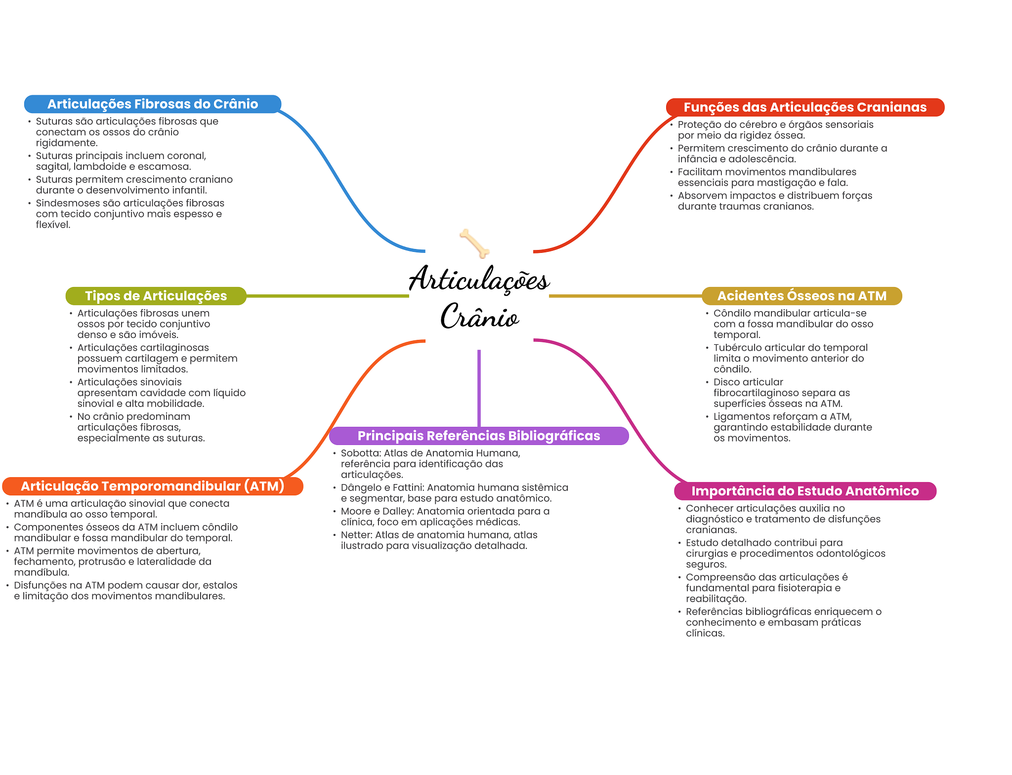 Articulações Fibrosas do Crânio Funções das Articulações Cranianas Suturas são articulações fibrosas que Proteção do cérebro e órgãos sensoriais conectam os do crânio por meio da rigidez óssea. rigidamente. Permitem crescimento do crânio durante a Suturas principais incluem coronal, infância e adolescência. sagital, lambdoide e escamosa. Facilitam movimentos mandibulares Suturas permitem crescimento craniano essenciais para mastigação e fala. durante desenvolvimento infantil. Absorvem impactos e distribuem forças Sindesmoses são articulações fibrosas durante traumas cranianos. com tecido conjuntivo mais espesso e flexível. Articulações Tipos de Articulações Acidentes Ósseos na ATM Articulações fibrosas unem OSSOS por tecido conjuntivo Crânio Côndilo mandibular articula-se com a fossa mandibular do denso e são imóveis. temporal. Articulações cartilaginosas Tubérculo articular do temporal possuem cartilagem e permitem limita O movimento anterior do movimentos limitados. côndilo. Articulações sinoviais Disco articular apresentam cavidade com líquido fibrocartilaginoso separa as sinovial e alta mobilidade. superfícies ósseas na ATM. No crânio predominam Ligamentos reforçam a ATM, articulações fibrosas, garantindo estabilidade durante especialmente as suturas. Principais Referências Bibliográficas OS movimentos. Sobotta: Atlas de Anatomia Humana, referência para identificação das articulações. Articulação (ATM) Dângelo e Fattini: Anatomia humana sistêmica Importância do Estudo Anatômico ATM é uma articulação sinovial que conecta e segmentar, base para estudo anatômico. mandíbula ao OSSO temporal. Moore e Dalley: Anatomia orientada para a Conhecer articulações auxilia no Componentes ósseos da ATM incluem côndilo clínica, foco em aplicações médicas. diagnóstico e tratamento de disfunções cranianas. mandibular e fossa mandibular do temporal. Netter: Atlas de anatomia humana, atlas ilustrado para visualização detalhada. Estudo detalhado contribui para ATM permite movimentos de abertura, cirurgias e procedimentos odontológicos fechamento, protrusão e lateralidade da seguros. mandíbula. Compreensão das articulações é Disfunções na ATM podem causar dor, estalos fundamental para fisioterapia e e limitação dos movimentos mandibulares. reabilitação. Referências bibliográficas enriquecem O conhecimento e embasam práticas clínicas.