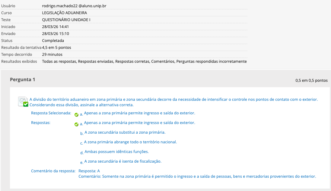 Usuário rodrigo.machado22 @aluno.unip.br Curso LEGISLAÇÃO ADUANEIRA Teste QUESTIONÁRIO UNIDADE I Iniciado 28/03/26 14:41 Enviado 28/03/26 15:10 Status Completada Resultado da tentativa 4,5 em 5 pontos Tempo decorrido 29 minutos Resultados exibidos Todas as respostas, Respostas enviadas, Respostas corretas, Comentários, Perguntas respondidas incorretamente Pergunta 1 0,5 em 0,5 pontos A divisão do território aduaneiro em zona primária e zona secundária decorre da necessidade de intensificar controle nos pontos de contato com O exterior. Considerando essa divisão, assinale a alternativa correta. Resposta Selecionada: a. Apenas a zona primária permite ingresso e saída do exterior. Respostas: a. Apenas a zona primária permite ingresso e saída do exterior. b. A zona secundária substitui a zona primária. C. A zona primária abrange todo território nacional. d. Ambas possuem idênticas funções. e. A zona secundária é isenta de fiscalização. Comentário da resposta: Resposta: A Comentário: Somente na zona primária é permitido 0 ingresso e a saída de pessoas, bens e mercadorias provenientes do exterior.
