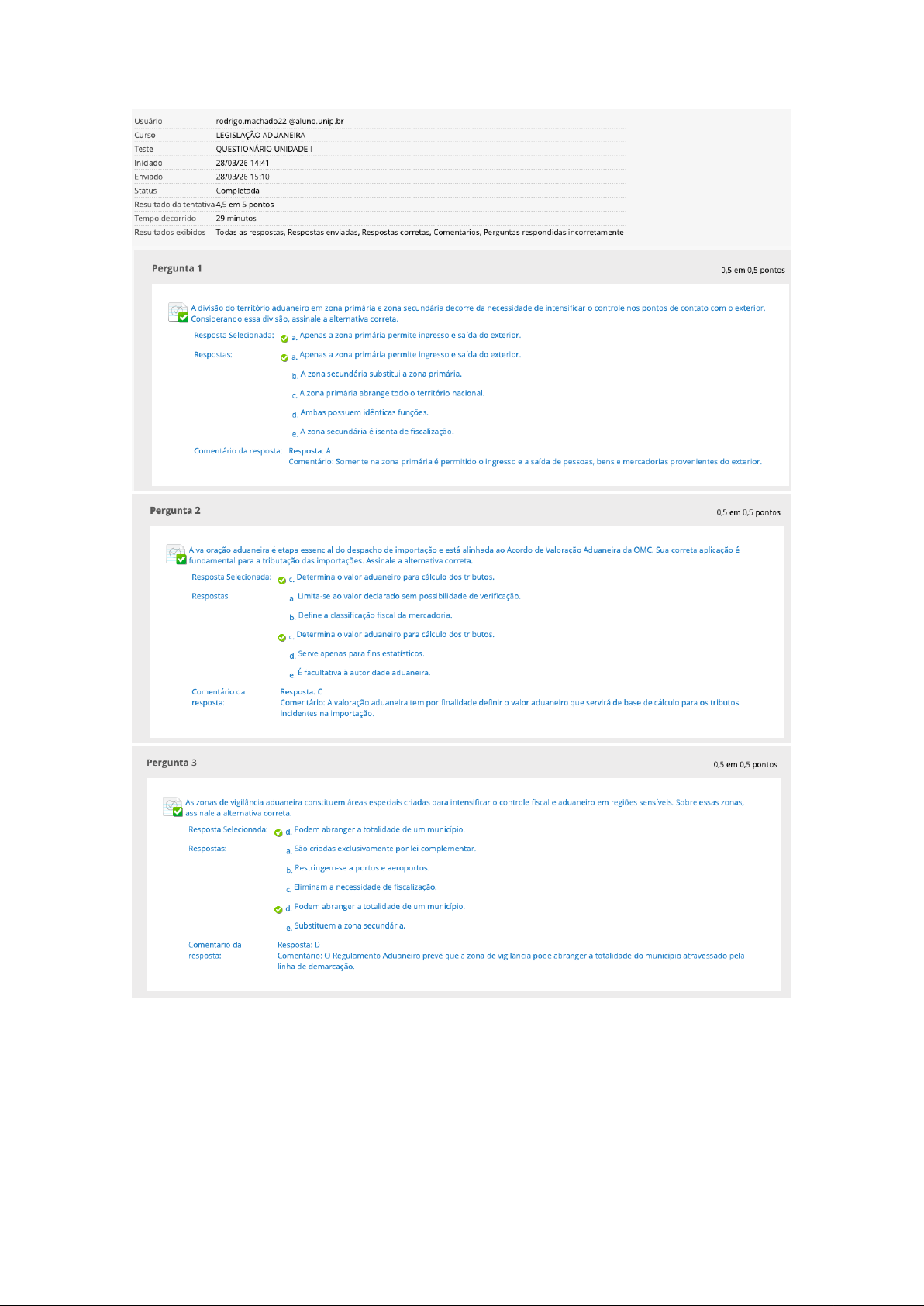 Usuário rodrigo.machado22 @aluno.unip.br Curso LEGISLAÇÃO ADUANEIRA Teste QUESTIONÁRIO UNIDADE Iniciado 28/03/26 14:41 Enviado 28/03/26 15:10 Status Completada Resultado da em 5 pontos Tempo decorrido 29 minutos Resultados exibidos Todas as respostas, Respostas enviadas, Respostas corretas, Comentários, Perguntas respondidas incorretamente Pergunta 1 0,5 em 0,5 pontos A divisão do território aduaneiro em zona primária e zona secundária decorre da necessidade de intensificar controle nos pontos de contato com exterior. Considerando essa divisão, assinale a alternativa correta. Resposta Selecionada: a. Apenas a zona primária permite ingresso e saída do exterior. Respostas: a. Apenas a zona primária permite ingresso e saída do exterior. b. A zona secundária substitui a zona primária. A zona primária abrange todo o território nacional. d. Ambas possuem idênticas funções. e. A zona secundária é isenta de fiscalização. Comentário da resposta: Resposta: A Comentário: Somente na zona primária é permitido ingresso e a saída de pessoas, bens e mercadorias provenientes do exterior. Pergunta 2 0,5 em 0,5 pontos A valoração aduaneira é etapa essencial do despacho de importação e está alinhada ao Acordo de Valoração Aduaneira da OMC. Sua correta aplicação é fundamental para a tributação das importações. Assinale a alternativa correta. Resposta Selecionada: Determina valor aduaneiro para cálculo dos tributos. Respostas: a. Limita-se ao valor declarado sem possibilidade de verificação. b. Define a classificação fiscal da mercadoria. Determina valor aduaneiro para cálculo dos tributos. d. Serve apenas para fins estatísticos. e. É facultativa à autoridade aduaneira. Comentário da Resposta: resposta: Comentário: A valoração aduaneira tem por finalidade definir valor aduaneiro que servirá de base de cálculo para os tributos incidentes na importação. Pergunta 3 0,5 em 0,5 pontos As zonas de vigilância aduaneira constituem áreas especiais criadas para intensificar controle fiscal e aduaneiro em regiões sensíveis. Sobre essas zonas, assinale a alternativa correta. Resposta Selecionada: d. Podem abranger a totalidade de um município. Respostas: a. São criadas exclusivamente por lei complementar. b. Restringem-se a portos e aeroportos. C. Eliminam a necessidade de fiscalização. d. Podem abranger a totalidade de um município. e. Substituem a zona secundária. Comentário da Resposta: D resposta: Comentário: o Regulamento Aduaneiro prevê que a zona de vigilância pode abranger a totalidade do município atravessado pela linha de demarcação.Pergunta 4 em 0,5 pontos No ordenamento jurídico brasileiro, a legislação aduaneira está diretamente vinculada à Constituição Federal, que atribui competência privativa à União para legislar sobre comércio exterior e regime dos portos. Considerando essa base constitucional e disposto no Regulamento Aduaneiro, a jurisdição aduaneira brasileira apresenta características próprias quanto à sua natureza e forma de exercício. Nesse contexto, em relação à jurisdição aduaneira, assinale a alternativa correta. Resposta Selecionada: a. É administrativa, exercida pela União, e sujeita ao controle judicial. Respostas: a. É administrativa, exercida pela União, e sujeita ao controle judicial. b. É exercida pelo Poder Judiciário, com caráter jurisdicional pleno. É compartilhada entre União, estados e municípios. d. Restringe-se apenas às operações tributadas. e. Limita-se exclusivamente à zona primária. Comentário da Resposta: A resposta: Comentário: A jurisdição aduaneira é administrativa, exercida pela União por meio da Receita Federal, estando seus atos sujeitos ao controle judicial. Pergunta 5 0,5 em 0,5 pontos controle aduaneiro brasileiro abrange não apenas mercadorias, mas também outros elementos envolvidos nas operações de comércio exterior. A esse respeito, assinale a alternativa correta. Resposta Selecionada: a. Abrange mercadorias, veículos e pessoas. Respostas: a. Abrange mercadorias, veículos e pessoas. b. Limita-se às mercadorias tributadas. C. Exclui veículos e pessoas. d. Ocorre apenas após desembaraço. e. É facultativo nas zonas secundárias. Comentário da resposta: Resposta: A Comentário: o controle aduaneiro incide sobre mercadorias, veículos e pessoas que ingressam ou saem do território aduaneiro. Pergunta 6 0,5 em 0,5 pontos controle aduaneiro brasileiro não se limita à arrecadação de tributos, possuindo finalidade mais ampla relacionada à proteção da economia nacional. Essa característica decorre do caráter extrafiscal dos tributos incidentes sobre comércio exterior. À luz do texto-base, assinale a alternativa correta. Resposta Selecionada: e. controle aduaneiro visa regular e proteger o comércio exterior. Respostas: a. controle aduaneiro ocorre apenas após despacho. b. controle aduaneiro possui finalidade exclusivamente arrecadatória. C. Mercadorias imunes estão dispensadas do controle aduaneiro. d. controle aduaneiro é exercido apenas pelo Banco Central. e. controle aduaneiro visa regular e proteger o comércio exterior. Comentário da Resposta: E resposta: Comentário: controle aduaneiro tem caráter extrafiscal, visando proteger a economia nacional e assegurar a regularidade das operações de comércio exterior. Pergunta 7 0,5 em 0,5 pontos método do valor de transação é primeiro método previsto no sistema de valoração aduaneira. Sua aplicação está condicionada ao atendimento de determinados requisitos legais. Assinale a alternativa correta. Resposta Selecionada: e. Exige inexistência de restrições relevantes à venda. Respostas: a. Aplica-se automaticamente a qualquer importação. b. Utiliza valores arbitrados pela autoridade aduaneira. C. Aplica-se apenas a bens de capital. d. Admite restrições relevantes à venda da mercadoria. e. Exige inexistência de restrições relevantes à venda. Comentário da