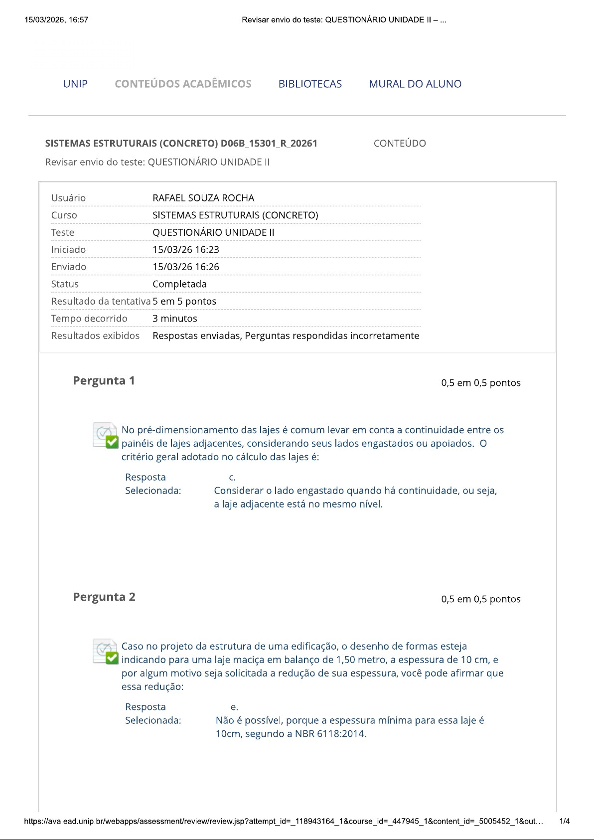 15/03/2026, 16:57 Revisar envio do teste: QUESTIONÁRIO UNIDADE UNIP CONTEÚDOS ACADÊMICOS BIBLIOTECAS MURAL DO ALUNO SISTEMAS ESTRUTURAIS (CONCRETO) D06B_15301_R_20261 CONTEÚDO Revisar envio do teste: QUESTIONÁRIO UNIDADE Usuário RAFAEL SOUZA ROCHA Curso SISTEMAS ESTRUTURAIS (CONCRETO) Teste QUESTIONÁRIO UNIDADE Iniciado 15/03/26 16:23 Enviado 15/03/26 16:26 Status Completada Resultado da tentativa 5 em 5 pontos Tempo decorrido 3 minutos Resultados exibidos Respostas enviadas, Perguntas respondidas incorretamente Pergunta 1 0,5 em 0,5 pontos No pré-dimensionamento das lajes é comum levar em conta a continuidade entre os painéis de lajes adjacentes, considerando seus lados engastados ou apoiados. critério geral adotado no cálculo das lajes é: Resposta C. Selecionada: Considerar lado engastado quando há continuidade, ou seja, a laje adjacente está no mesmo nível. Pergunta 2 0,5 em 0,5 pontos Caso no projeto da estrutura de uma edificação, desenho de formas esteja indicando para uma laje maciça em balanço de 1,50 metro, a espessura de 10 cm, e por algum motivo seja solicitada a redução de sua espessura, você pode afirmar que essa redução: Resposta e. Selecionada: Não é possível, porque a espessura mínima para essa laje é 10cm, segundo a NBR 6118:2014. 1/415/03/2026, 16:57 Revisar envio do teste: QUESTIONÁRIO UNIDADE Pergunta 3 0,5 em 0,5 pontos No pré-dimensionamento rápido de uma viga com 15cm de largura, com 3 vãos de 6,12m, sua altura recomendada deve ser: Resposta C. Selecionada: 1/12 X 612 = 51 cm, portanto pode-se recomendar 50cm. Pergunta 4 0,5 em 0,5 pontos As larguras das vigas devem obedecer às dimensões limitadas pelas normas em vigor. Segundo a NBR 6118:2014, a largura da viga não deve ser: Resposta d. Selecionada: Menor que 12 cm, exceto casos de vigas sem importância estrutural. Pergunta 5 0,5 em 0,5 pontos Nos pré-dimensionamentos de pilares de uma edificação, é comum considerar que a carga em cada pavimento aplicada no pilar é calculada a partir de uma estimativa. Essa estimativa leva em conta: Resposta a. Selecionada: Uma carga média aplicada em uma área de influência para cada pilar, com base nas distâncias entre os pilares. Pergunta 6 0,5 em 0,5 pontos Conforme a NBR 6118:2014, no item 13.2.3, os pilares de edificações devem ter seção transversal com área mínima de e não podem ter o lado menor com menos de 19cm, exceto em casos especiais, em que é permitido que tenham até: 2/415/03/2026, 16:57 Revisar envio do teste: QUESTIONÁRIO UNIDADE Resposta e. Selecionada: 14cm, contanto que os esforços sejam multiplicados por um coeficiente adicional. Pergunta 7 0,5 em 0,5 pontos Para a maioria das vigas, é possível fazer pré-dimensionamento de sua altura como uma porcentagem do vão que a mesma vence. Entretanto, esse critério não se aplica a todas as vigas. Nesse caso, as dimensões de sua seção transversal podem ser obtidas a partir: Resposta Selecionada: a. Da estimativa dos esforços máximos atuantes na viga. Pergunta 8 0,5 em 0,5 pontos A altura de uma viga biapoiada, que se apoia em dois pilares quadrados com 30cm de lado e possui um vão livre (entre as faces dos pilares) de 4,90m, pode ser estimada a partir da formulação: Resposta Selecionada: b. h = 1/10 X 520 cm Pergunta 9 0,5 em 0,5 pontos pré-dimensionamento dos pilares de um edifício residencial é feito com base: Resposta b. Selecionada: Na soma das cargas aplicadas em cada um dos pavimentos, considerando inclusive a cobertura. Pergunta 10 0,5 em 0,5 pontos 3/415/03/2026, 16:57 Revisar envio do teste: QUESTIONÁRIO UNIDADE - No pré-dimensionamento do pilar retangular de um edifício feito em concreto classe a carga total atuante é 980 kN (98 tf). Considerando uma tensão de referência de 1,50 kN/cm2 (150 as dimensões mais adequadas da seção do pilar deverão ser: Resposta Selecionada: d. h = 20 cm e b = 35 cm. Domingo, 15 de Março de 2026 16h57min04s GMT-03:00 OK 4/4