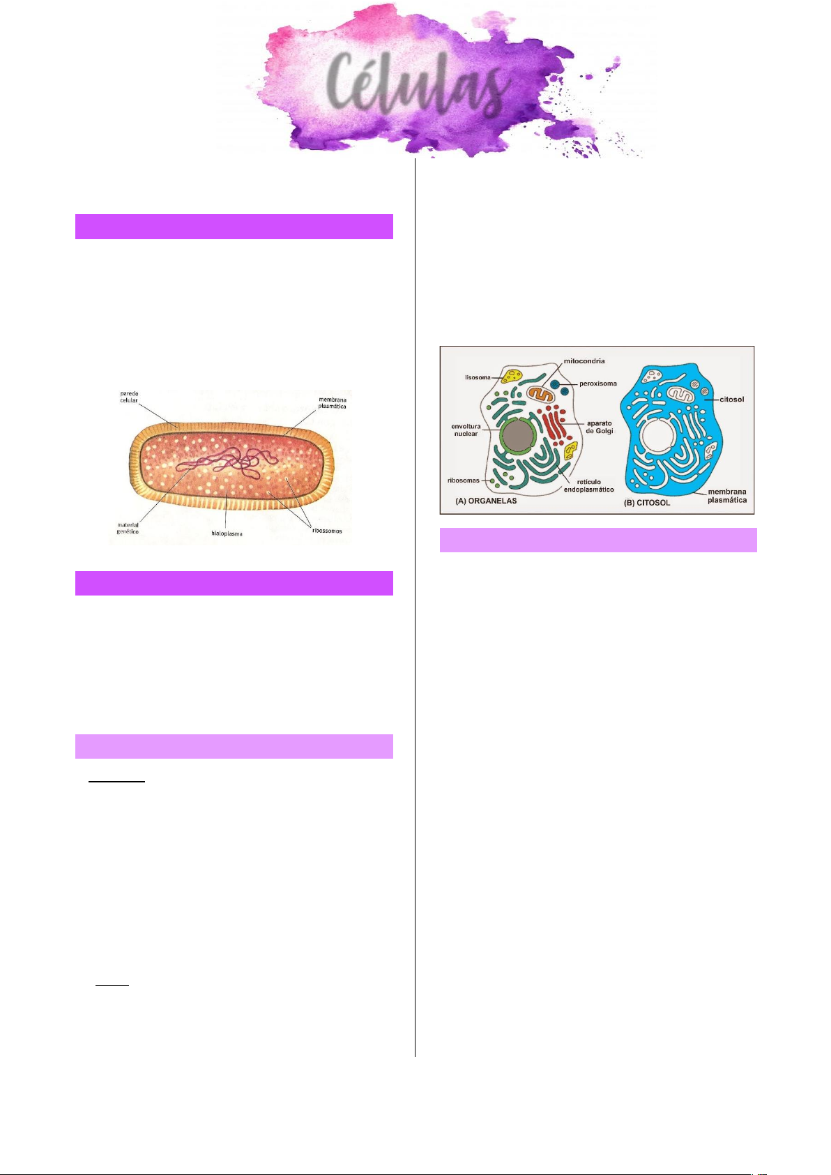 As células são as unidades funcionais e estruturais dos seres vivos. Procarionte x Eucarionte A microscopia eletrônica demonstrou que existem fundamentalmente duas classes de células: os procariontes (pro, primeiro, e cario, núcleo), cujos cromossomos não são separados do citoplasma por membrana, e as eucariontes (eu, verdadeiro, e cario, núcleo), com um núcleo bem individualizado e delimitado pelo envoltório nuclear. (JUNQUEIRA, 9ª ed.) Célula Eucarionte As células eucariontes apresentam duas partes morfologicamente bem distintas – o citoplasma e o núcleo –, entre as quais existe um trânsito constante de moléculas diversas, nos dois sentidos. O citoplasma é envolvido pela membrana plasmática, e o núcleo, pelo envoltório nuclear. (JUNQUEIRA, 9ª ed.) Citoplasma X CITOSOL O citoplasma das células eucariontes contém as organelas, como mitocôndrias, retículo endoplasmático, aparelho de Golgi, lisossomos e peroxissomos. O conceito de organela não é bem definido; varia um pouco de um autor para outro. Além das organelas, o citoplasma pode apresentar depósitos de substâncias diversas, como grânulos de glicogênio e gotículas lipídicas. Preenchendo o espaço entre as organelas e os depósitos, também chamados inclusões, encontra-se a matriz citoplasmática ou citosol. (JUNQUEIRA, 9ª ed.) O citosol contém água, íons diversos, aminoácidos, precursores dos ácidos nucleicos, numerosas enzimas. O citosol contém microfibrilas, constituídas de actina, e microtúbulos, constituídos de tubulina, cujas unidades monoméricas se podem despolimerizar e polimerizar novamente, de modo reversível e dinâmico, o que explica as modificações de sol para gel, e vice-versa, observadas no citoplasma. Quando despolimerizadas (separadas umas das outras), as moléculas das proteínas actina e tubulina conferem maior fluidez ao citosol. Quando polimerizadas em microfibrilas e microtúbulos, conferem a consistência de gel à região citoplasmática em que se encontram. (JUNQUEIRA, 9ª ed.) Membrana PlasmÁtica A membrana plasmática, ou plasmalema, é a estrutura celular que estabelece o limite entre os meios intra e extracelulares. Uma função importante dessa membrana é a manutenção da constância do meio intracelular, cuja composição é diferente da do líquido extracelular. Apesar da existência desse limite, existe grande interação entre o interior da célula e as moléculas extracelulares. As unidades de membrana são bicamadas lipídicas formadas principalmente por fosfolipídios e que contêm uma quantidade variável de moléculas proteicas, mais numerosas nas membranas com maior atividade funcional (as proteínas são responsáveis pela maioria das funções da membrana). (JUNQUEIRA, 9ª ed.) As membranas celulares são compostas principalmente por lipídios e por proteínas. A maior parte dos lipídios se organiza em duas camadas de moléculas de fosfolipídios. Estes, em meio aquoso, espontaneamente se organizam em bicamadas sem gasto de energia. Os grupamentos não polares (hidrofóbicos) dos fosfolipídios se situam no centro da membrana, e os seus grupamentos polares (hidrofílicos) se localizam nas duas superfícies da membrana, expostos aos ambientes em que existe água. Além dos fosfolipídios, as membranas celulares contêm outros lipídios, como glicolipídios e colesterol. Células @jumorbeck O folheto externo da bicamada lipídica da membrana plasmática apresenta muitas moléculas de glicolipídios, com as porções glicídicas se projetando para o exterior da célula. As porções glicídicas dos glicolipídios se juntam porções glicídicas das proteínas da própria membrana, mais glicoproteínas e proteoglicanos secretados, que são adsorvidos pela superfície celular para formar um conjunto denominado glicocálice. Assim, o glicocálice é uma projeção da parte mais externa da membrana, com apenas algumas moléculas adsorvidas, e não uma camada inteiramente extracelular, como se pensou inicialmente. (JUNQUEIRA, 9ª ed.) O glicocálice participa do reconhecimento entre células e da união das células umas com as outras e com as moléculas extracelulares. As proteínas representam aproximadamente 50% do peso da membrana plasmática, percentual que varia muito nas membranas do interior da célula. As moléculas proteicas podem ser classificadas em dois grupos: ➢ Proteínas periféricas: estão fracamente associadas à membrana e podem ser extraídas com certa facilidade por meio de soluções salinas. Essas proteínas se ancoram de diversas maneiras na bicamada lipídica: por interação com porções hidrofóbicas da membrana, por ligações covalentes ou por diversos tipos de âncoras, como, por exemplo, por meio do glicosilfosfatidilinositol (GPI) – âncora GPI. ➢ Proteínas integrais: são proteínas fortemente ligadas a moléculas da membrana e só podem ser extraídas por tratamentos drásticos, como, por exemplo, pelo uso de detergentes. A maioria dessas proteínas atravessam a bicamada totalmente e são denominadas proteínas transmembrana. Algumas proteínas transmembrana atravessam a membrana uma única vez, enquanto outras têm cadeias longas e dobradas, que atravessam a membrana diversas vezes. Por isso, as proteínas transmembrana podem ser classificadas em proteínas de passagem única e proteínas de passagem múltipla. As proteínas transmembrana exercem funções muito importantes na célula: algumas agem como poros funcionais por onde transitam íons e moléculas, e outras agem como receptores. As proteínas que fazem parte da membrana são sintetizadas no retículo endoplasmático granuloso, modificadas no complexo de Golgi e transportadas para a superfície celular em membranas de vesículas de transporte. As proteínas podem deslizar ao longo do plano da membrana porque a bicamada lipídica é fluida. Conjuntos de moléculas lipídicas e proteicas chamados lipid rafts (jangadas lipídicas) flutuam na supe