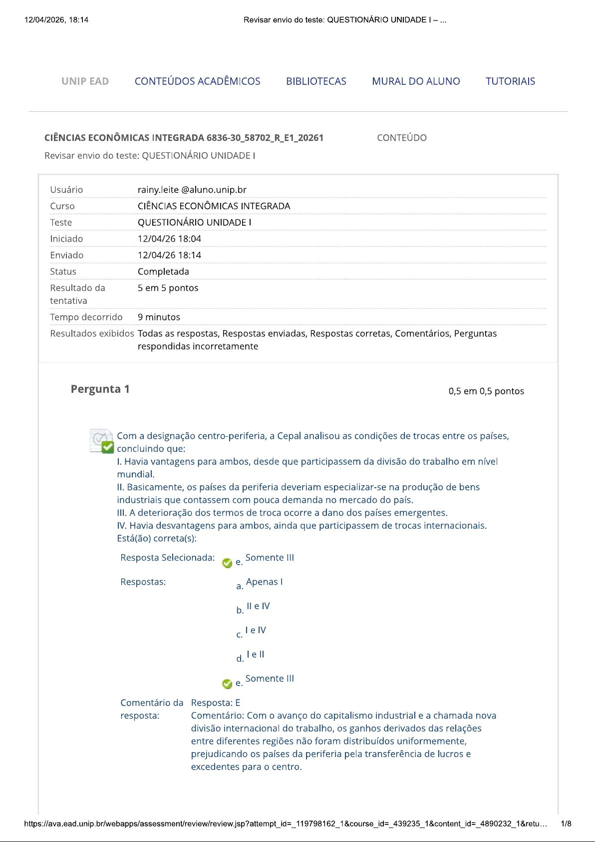 12/04/2026, 18:14 Revisar envio do teste: QUESTIONÁRIO UNIDADE UNIP EAD CONTEÚDOS ACADÊMICOS BIBLIOTECAS MURAL DO ALUNO TUTORIAIS CIÊNCIAS ECONÔMICAS INTEGRADA CONTEÚDO Revisar envio do teste: QUESTIONÁRIO UNIDADE I Usuário rainy.leite @aluno.unip.br Curso CIÊNCIAS ECONÔMICAS INTEGRADA Teste QUESTIONÁRIO UNIDADE I Iniciado 12/04/26 18:04 Enviado 12/04/26 18:14 Status Completada Resultado da 5 em 5 pontos tentativa Tempo decorrido 9 minutos Resultados exibidos Todas as respostas, Respostas enviadas, Respostas corretas, Comentários, Perguntas respondidas incorretamente Pergunta 1 0,5 em 0,5 pontos Com a designação centro-periferia, a Cepal analisou as condições de trocas entre os países, concluindo que: I. Havia vantagens para ambos, desde que participassem da divisão do trabalho em nível mundial. II. Basicamente, os países da periferia deveriam especializar-se na produção de bens industriais que contassem com pouca demanda no mercado do país. III. A deterioração dos termos de troca ocorre a dano dos países emergentes. IV. Havia desvantagens para ambos, ainda que participassem de trocas internacionais. Está(ão) correta(s): Resposta Selecionada: Somente III e. Respostas: a. Apenas b. II e IV C. e IV d. le e. Somente III Comentário da Resposta: E resposta: Comentário: Com avanço do capitalismo industrial e a chamada nova divisão internacional do trabalho, os ganhos derivados das relações entre diferentes regiões não foram distribuídos uniformemente, prejudicando os países da periferia pela transferência de lucros e excedentes para centro. 1/812/04/2026, 18:14 Revisar envio do teste: QUESTIONÁRIO UNIDADE Pergunta 2 0,5 em 0,5 pontos Aponte, entre as alternativas a seguir, quais fatores não são relacionados com as medidas que visem desenvolvimento de uma economia. Resposta a. Selecionada: A imediata substituição de seu parque produtivo, eliminando-se por completo a produção de produtos primários e commodities. Respostas: a. A imediata substituição de seu parque produtivo, eliminando-se por completo a produção de produtos primários e commodities. b. Crescimento de suas exportações. Maior integração das cadeias produtivas internas. d. Melhora da estrutura interna de distribuição de renda. e. Eliminação dos pontos de estrangulamentos que dificultam as atividades econômicas e financeiras. Comentário da Resposta: A resposta: Comentário: Até que não sejam superados os entraves do subdesenvolvimentismo, a base exportadora estará restrita a poucos bens agrícolas e, por consequência, seus efeitos multiplicadores estarão instáveis. Pergunta 3 0,5 em 0,5 pontos Identifique qual alternativa esclarece de forma adequada o que se conceitua como PNB (Produto Nacional Bruto): Resposta C. PIB é maior do que PNB em países emergentes. Selecionada: Respostas: a. PNB somente é apurado/calculado nos países com maior crescimento econômico. b. PNB é maior do que PIB em países com baixa transferência de capital para exterior. PIB é maior do que PNB em países emergentes. C. d. PIB equivale à inclusão de fatores de natureza qualitativa na medição da renda nacional. e. País com maior PIB terá, obrigatoriamente, maior IDH. Comentário da Resposta: resposta: Comentário: PNB difere do PIB porque ele considera tanto as 2/812/04/2026, 18:14 Revisar envio do teste: QUESTIONÁRIO UNIDADE rendas enviadas para exterior quanto as recebidas pelo exterior. Assim: PNB = PIB Ree (Receita Enviada para Exterior) + Rre (Receita Recebida do Exterior). Pergunta 4 0,5 em 0,5 pontos Qual(is) assertiva(s) a seguir relaciona-se com políticas de apoio ao processo de substituição de importações: I. Aumento de cotas de exportação de produtos agrícolas e semimanufaturados. II. Diminuição da tarifa de importação de produtos industriais. III. Adoção de barreiras alfandegárias e intervenções no mercado cambial, com a manipulação da taxa de câmbio e confisco de divisas. IV. Incentivos a indústrias específicas, através de créditos subsidiados e renúncias fiscais, com a participação de empresas estatais e estrangeiras. Está(ão) correta(s): Resposta Selecionada: b. III e IV Respostas: a. e b. III e IV Apenas III d. Apenas e. e IV Comentário da Resposta: B resposta: Comentário: Além do indicado nas assertivas (III) e (IV), podem ser mencionadas como políticas que incentivam o processo de substituição de importações, por exemplo: Controle quantitativo de importações, a fim de evitar a fuga de divisas com gastos supérfluos e proporcionar mercado para a indústria nacional nascente; Implantação de infraestrutura de transportes, energia e comunicações. Pergunta 5 0,5 em 0,5 pontos 3/812/04/2026, 18:14 Revisar envio do teste: QUESTIONÁRIO UNIDADE Com relação ao desenvolvimentismo no pensamento econômico brasileiro, é possível reconhecer como correto: Resposta A defesa da intervenção do estado na economia. e. Selecionada: Respostas: a. Prejudica a intervenção do governo nas atividades econômicas. b. Era exatamente igual às ideias e às propostas dos setores privado e público da economia. Apenas setor privado via com bons olhos um incentivo comparativamente maior para a indústria do que para as demais atividades econômicas. d. Não existia preocupação com aspectos de desenvolvimento social. A defesa da intervenção do estado na economia. e. Comentário da Resposta: E resposta: Comentário: Vale destacar alguns pontos importantes do pensamento desenvolvimentista nacionalista: Defesa de intervenção estatal na economia. Políticas econômicas orientadas ao planejamento. Subordinação da política monetária à política de desenvolvimento. Adoção, por parte do Estado, de medidas econômicas de cunho social. Pergunta 6 0,5 em 0,5 pontos As denominadas falhas de mercado são entendidas como justificativas para a intervenção do governo nas atividades econômicas. A esse respeito, podemos considerar como correta, ent