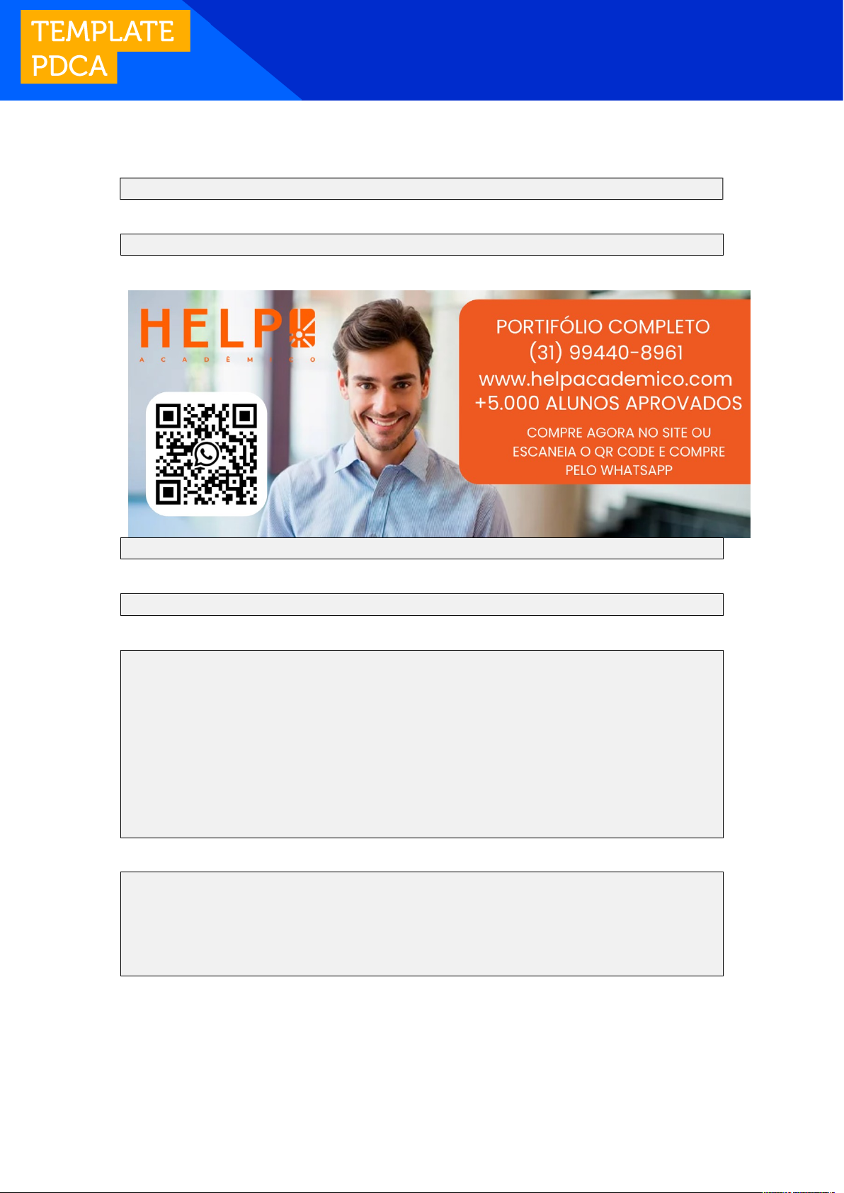 ALUNO: CURSO: CST EM SEGURANÇA NO TRABALHO COMPONENTE CURRICULAR: PROJETO DE EXTENSÃO II - SEGURANÇA NO TRABALHO PROGRAMA DE EXTENSÃO: PROGRAMA DE CONTEXTO À COMUNIDADE. FINALIDADE E MOTIVAÇÃO: A finalidade da extensão no Programa de Contexto à Comunidade é dedicar-se a área educacional e o transferir do saber, desenvolvendo e capacitando a comunidade local e agregando conhecimentos por meio de projetos e atividades pedagógicas extensionistas. Nesse programa é possível a ministração de palestras, aulas de monitoria, cursos, aulas de higiene, saúde e segurança no trabalho e gerenciamento de riscos no trabalho, projetos coletivos multidisciplinar e trabalhos voluntários. Os locais que poderão contemplar esse projeto extensionista podem ser: parcerias com a prefeitura; associações de bairros, escolas, empresas públicas e privadas, instituições religiosas, ONGs e por meio de redes de internet COMPETÊNCIAS: I - Planejar e organizar campanhas de saúde e segurança no trabalho; II - Realizar consultoria, auditoria, assessoria e capacitação na área de segurança do trabalho; III - Elaborar e interpretar relatórios e pareceres técnicos na área de segurança do trabalho. PERFIL DE EGRESSO: O perfil do egresso idealizado pela IES para o curso de Segurança no Trabalho possibilita a formação do profissional crítico, reflexivo, criativo, humanista e ético, capaz de aplicar tecnologias inerentes à sua área de atuação, sendo que pelas atividades extensionistas vinculadas ao Programa de Extensão Contexto à Comunidade, esse egresso poderá atuar em equipes multidisciplinares com ética profissional, social e ambiental, em atividades relacionadas com a área da segurança no trabalho assumindo atribuições e responsabilidades de gerenciamento, planejamento, avaliação e controle dos riscos no ambiente de trabalho, seja na área industrial ou qualquer outro segmento, seguindo uma postura investigativa, proativa, ágil, eficiente e inovadora levando em conta a prevenção de acidentes, melhoria das condições de trabalho, preservação da saúde, segurança e qualidade de vida do trabalhador SOFT SKILLS (COMPETÊNCIAS SOCIOEMOCIONAIS): Criatividade e inovação 1 Público Comunicação Interpessoal Planejamento e organização OBJETIVOS DE APRENDIZAGEM: Os objetivos da extensão em Segurança no Trabalho vinculados ao Programa de Contexto à Comunidade estão relacionados com a disseminação do saber da área de higiene do trabalho, gerenciamento de riscos e normas técnicas para a comunidade local, prestando serviços a questões pedagógicas. Tais ações visam a transferência de conhecimento acadêmico para a comunidade, preparando o egresso para uma atuação global, focado não apenas no conhecimento técnico, mas com a preocupação pelo próximo e por uma sociedade mais justa, buscando transferência de conhecimento para quem não tem oportunidade de acesso CONTEÚDOS: I - Higiene do trabalho; II - Gerenciamento de risco; III - Legislação e normas técnicas. INDICAÇÕES BIBLIOGRÁFICAS: BARSANO, P. R. BARBORA, R. P. Higiene e Segurança do Trabalho. 1. ed. São Paulo : Érica, 2014. CHIRMICI, A; OLIVEIRA, E. A. R. Introdução a Segurança e Saúde no Trabalho. Guanabara Koogan, 2011. CARDELLA, B. Segurança no Trabalho e Prevenção de Acidentes: uma abordagem holística. 2. ed. São Paulo : Atlas, 2016. TEMPLATE PDCA Aluno e Aluna, essa atividade é para sua organização e uso da metodologia PDCA. Por isso é um documento orientativo e não precisa ser entregue. Veja as orientações apresentadas no MANUAL DE ATIVIDADES EXTENSIONISTAS. 1. PLANEJAMENTO (PLAN) Antes de definir sua proposta, explore os Objetivos de Desenvolvimento Sustentável (ODS) da Organização das Nações Unidas (ONU) no link https://brasil.un.org/pt-br/sdgs. Se preferir, pode baixar o documento pelo link https://brasil.un.org/sites/default/files/2020-09/agenda2030-pt- br.pdf. Compreenda a proposta da ONU e engaje-se nessa oportunidade de contribuir com as metas de um organismo internacional tão importante ao mesmo tempo em que participa de soluções de seu contexto! Analise os 17 objetivos e escolha quais metas podem ser aderentes à sua proposta e ao seu projeto. Para isso, clique no ícone de cada objetivo e observe a listagem de metas disponível em cada um. É necessário que você escolha pelo menos uma meta. Pode ser que você encontre metas aderentes à sua proposta em diferentes objetivos, mas não se restrinja. Pode escolher dessa forma e mantenha o foco da essência de sua proposta. 2 Feito isso, liste aqui suas escolhas. Essa informação também deverá ser declarada em seu Relatório Final de Atividades Extensionistas. LISTAR METAS DOS ODS ADERENTES AO SEU PROJETO DEFINA A PROPOSTA. IMERSÃO: DEFINA OS ITENS DA IMERSÃO Segue sugestão de perguntas para utilizar na entrevista com o parceiro. SUGESTÃO DE SCRIPT DE ENTREVISTA 1. Quais os principais problemas, fragilidades ou dificuldades que a instituição/parceiro convive com maior frequência? 1.1. Os problemas estão articulados com o programa/conteúdo proposto no componente curricular? Se não estiver, será necessário voltar à pergunta 1. 1.2. É possível resolver ou mitigar os problemas identificados no prazo de duração de projeto de extensão. Se não for possível deve voltar à pergunta 1. 1.3. A solução ou mitigação auxiliará a comunidade ou um grupo de pessoas da comunidade? Se não auxiliar deve voltar à pergunta 1. 2. Quais serão as pessoas envolvidas na ação para buscar resolver ou mitigar os problemas identificados? 3. Onde será realizada a ação? 4. Há limitação de pessoas ou restrição para acesso ao local indicado? 5. Quais serão as pessoas beneficiadas diretamente? 6. Necessitará de insumos/recursos financeiros para a realização da ação? 7. Será necessário agendamento? 8. Qual o período, dia da semana, horário que será realizada a ação? IDEAÇÃO: DEFINA OS I