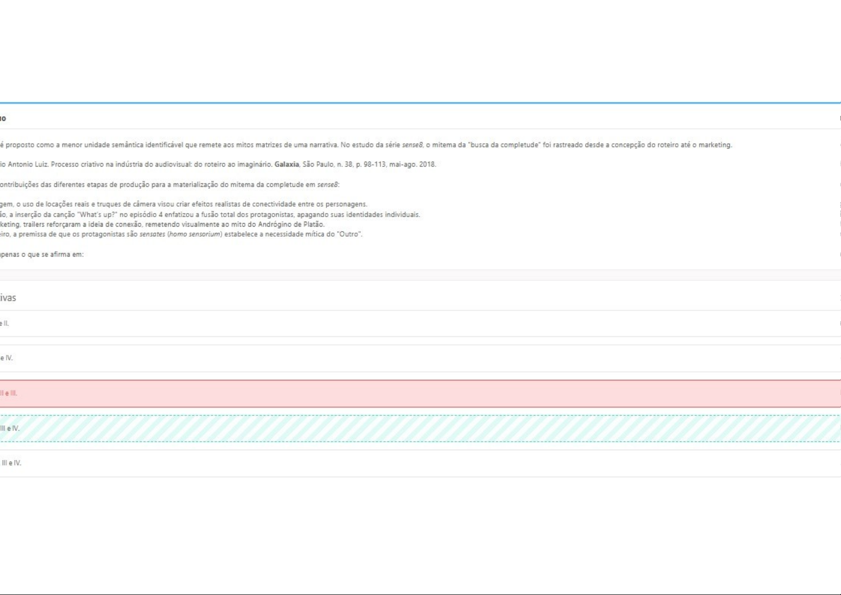 proposto como a menor unidade semântica identificável que remete aos mitos matrizes de uma narrativa. No estudo da série sense8, mitema da "busca da completude" foi rastreado desde a concepção do roteiro até o marketing. Antonio Luiz. Processo criativo na indústria do audiovisual: do roteiro ao imaginário. Galaxia, São Paulo, n. 38, 98-113, mai-ago. 2018. ontribuições das diferentes etapas de produção para a materialização do mitema da completude em sense8: gem, o uso de locações reais e truques de câmera visou criar efeitos realistas de conectividade entre os personagens. a inserção da canção "What's up?" no episódio 4 enfatizou a fusão total dos protagonistas, apagando suas identidades individuais. trailers reforçaram a ideia de conexão, remetendo visualmente ao mito do Andrógino de Platão. a premissa de que os protagonistas são sensates (homo sensorium) estabelece a necessidade mítica do "Outro". o que se afirma em: II. IV. e e IV. III e IV.