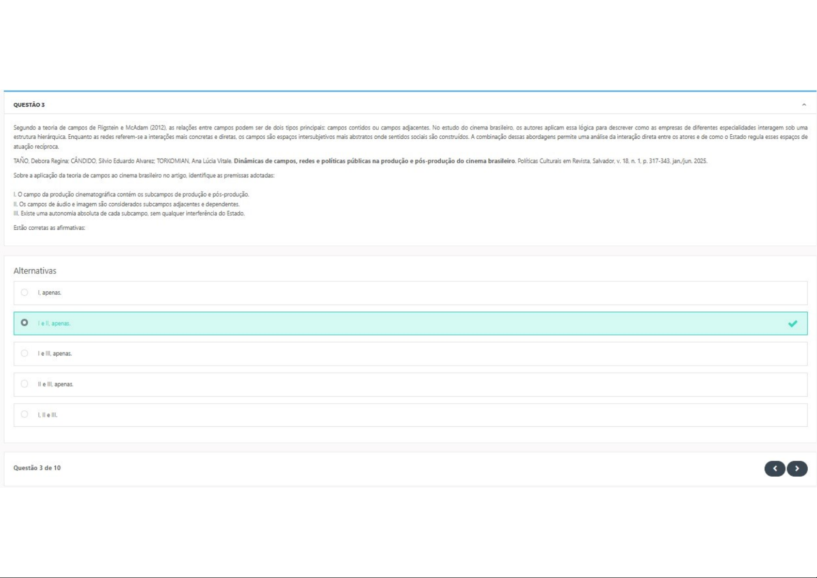 QUESTÃO 3 Segundo a teoria de campos de Fligstein e McAdam (2012), as relações entre campos podem ser de dois tipos principais: campos contidos ou campos adjacentes. No estudo do cinema brasileiro, autores aplicam essa lógica para descrever como as empresas de diferentes especialidades interagem sob uma estrutura hierárquica. Enquanto as redes referem-se a interações mais concretas e diretas, os campos são espaços intersubjetivos mais abstratos onde sentidos sociais são construídos. A combinação dessas abordagens permite uma análise da interação direta entre os atores e de como Estado regula esses espaços de atuação recíproca. Debora CÂNDIDO, Silvio Eduardo Ana Lúcia Vitale. Dinâmicas de campos, redes e políticas públicas na produção e pós-produção do cinema brasileiro. Culturais em Salvador, V. 18, n. 1, p. jan./jun. 2025. Sobre a aplicação da teoria de campos ao cinema brasileiro no artigo, identifique as premissas adotadas: LO campo da produção cinematográfica contém os subcampos de produção e pós-produção. II. Os campos de áudio e imagem são considerados subcampos adjacentes e dependentes. III. Existe uma autonomia absoluta de cada subcampo, sem qualquer interferência do Estado. Estão corretas as afirmativas: Alternativas I, apenas. le II, apenas. le III, apenas. III, apenas. I, III. Questão 3 de 10
