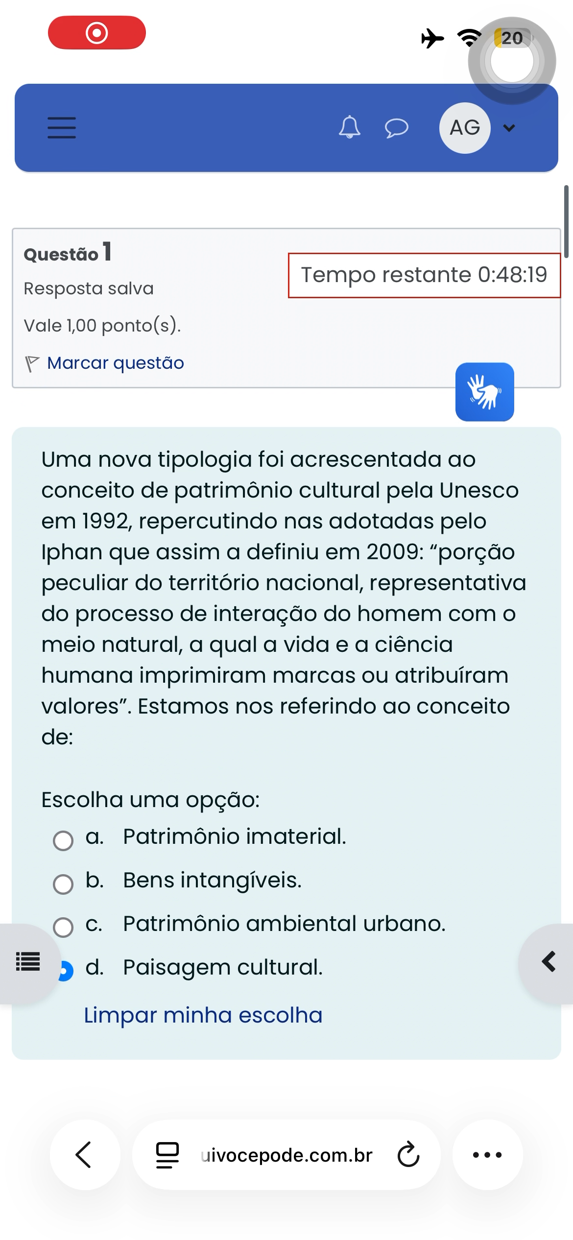 20 AG Questão 1 Tempo restante 0:48:19 Resposta salva Vale 1,00 ponto(s). Marcar questão Uma nova tipologia foi acrescentada ao conceito de patrimônio cultural pela Unesco em 1992, repercutindo nas adotadas pelo Iphan que assim a definiu em 2009: "porção peculiar do território nacional, representativa do processo de interação do homem com meio natural, a qual a vida e a ciência humana imprimiram marcas ou atribuíram valores". Estamos nos referindo ao conceito de: Escolha uma opção: a. Patrimônio imaterial. b. Bens intangíveis. Patrimônio ambiental urbano. d. Paisagem cultural. Limpar minha escolha uivocepode.com.br