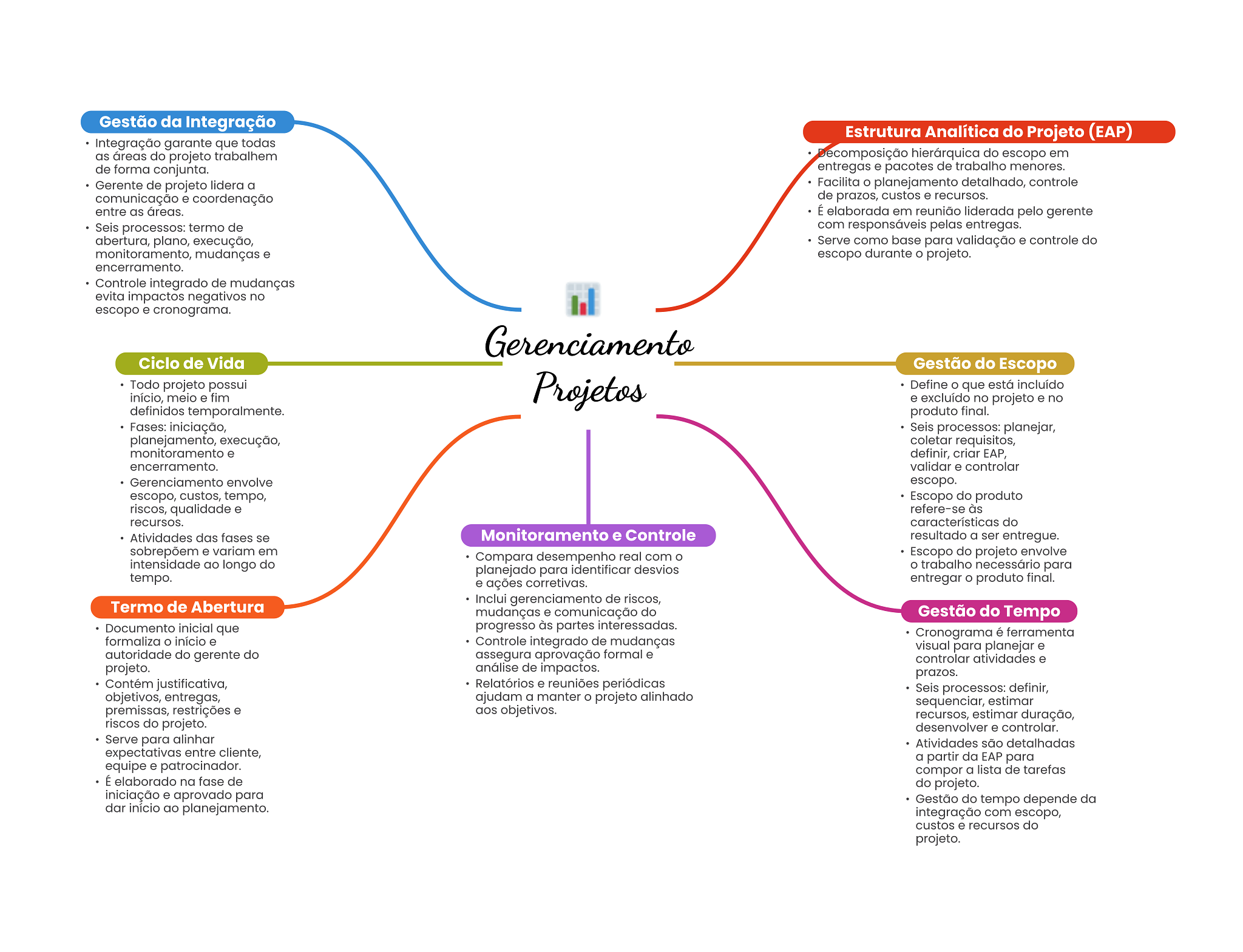 Gestão da Integração Estrutura Analítica do Projeto (EAP) Integração garante que todas as áreas do projeto trabalhem Decomposição hierárquica do escopo em de forma conjunta. entregas e pacotes de trabalho menores. Gerente de projeto lidera a Facilita planejamento detalhado, controle comunicação e coordenação de prazos, custos e recursos. entre as áreas. É elaborada em reunião liderada pelo gerente Seis processos: termo de com responsáveis pelas entregas. abertura, plano, execução, Serve como base para validação e controle do monitoramento, mudanças e escopo durante projeto. encerramento. Controle integrado de mudanças evita impactos negativos no escopo e cronograma. Gerenciamento Ciclo de Vida Gestão do Escopo Todo projeto possui Projetos Define que está incluído início, meio e fim e excluído no projeto e no definidos temporalmente. produto final. Fases: iniciação, Seis processos: planejar, planejamento, execução, coletar requisitos, monitoramento e definir, criar EAP, encerramento. validar e controlar Gerenciamento envolve escopo. escopo, custos, tempo, Escopo do produto riscos, qualidade e refere-se às recursos. características do Atividades das fases se Monitoramento e Controle resultado a ser entregue. sobrepõem e variam em Compara desempenho real com Escopo do projeto envolve intensidade ao longo do planejado para identificar desvios trabalho necessário para tempo. e ações corretivas. entregar produto final. Termo de Abertura Inclui gerenciamento de riscos, mudanças e comunicação do Gestão do Tempo Documento inicial que progresso às partes interessadas. Cronograma é ferramenta formaliza início e Controle integrado de mudanças visual para planejar e autoridade do gerente do assegura aprovação formal e controlar atividades e projeto. análise de impactos. prazos. Contém justificativa, Relatórios e reuniões periódicas Seis processos: definir, objetivos, entregas, ajudam a manter projeto alinhado sequenciar, estimar premissas, restrições e aos objetivos. recursos, estimar duração, riscos do projeto. desenvolver e controlar. Serve para alinhar Atividades são detalhadas expectativas entre cliente, a partir da EAP para equipe e patrocinador. compor a lista de tarefas É elaborado na fase de do projeto. iniciação e aprovado para Gestão do tempo depende da dar início ao planejamento. integração com escopo, custos e recursos do projeto.