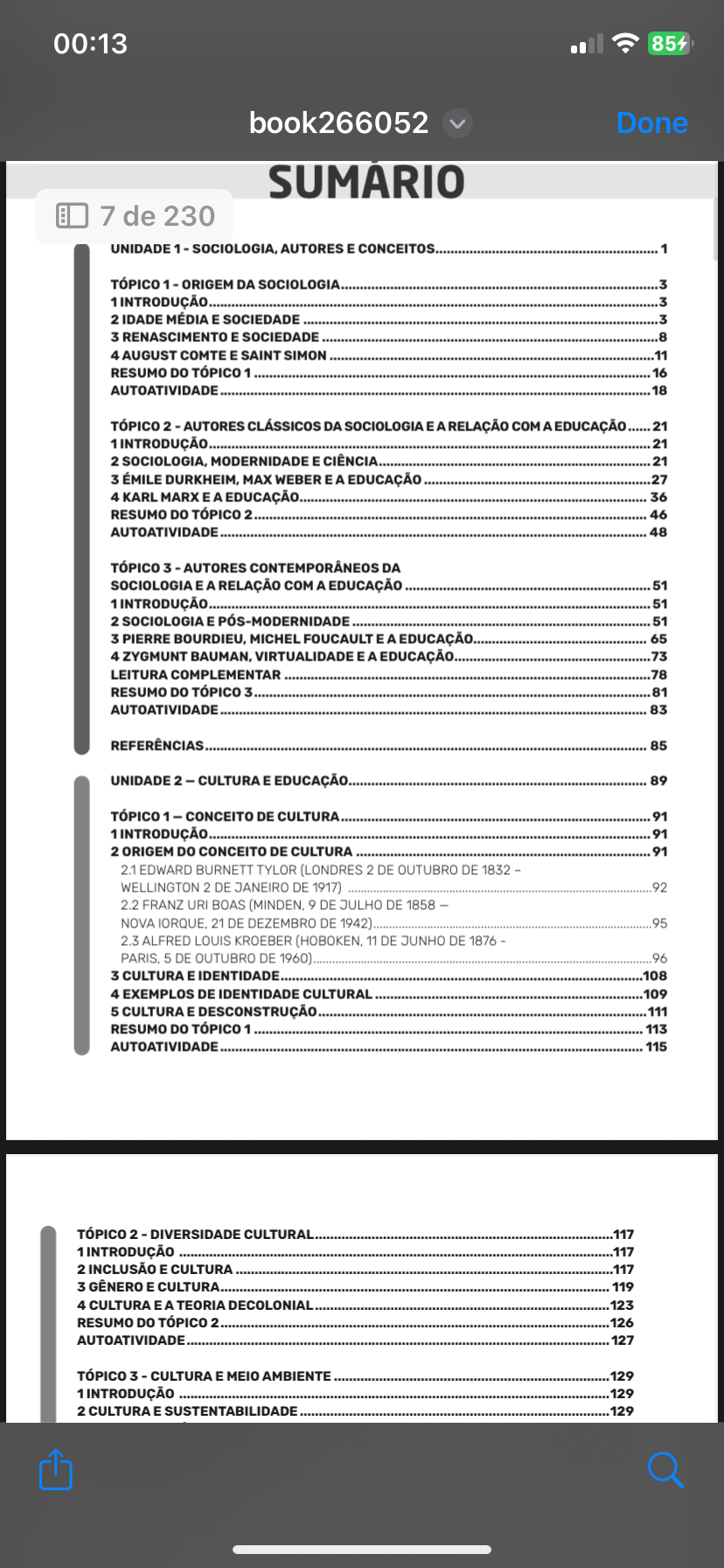 00:13 854 book266052 Done SUMARIO 7 de 230 UNIDADE 1 SOCIOLOGIA, AUTORES E CONCEITOS 1 TÓPICO 1 ORIGEM DA SOCIOLOGIA 3 1 INTRODUÇÃO 3 2 IDADE MÉDIA E SOCIEDADE 3 3 RENASCIMENTO E SOCIEDADE 8 4 AUGUST COMTE E SAINT SIMON 11 RESUMO DO TÓPICO 1 16 AUTOATIVIDADE 18 TÓPICO 2 AUTORES CLÁSSICOS DA SOCIOLOGIA E A RELAÇÃO COM A EDUCAÇÃO 21 1 INTRODUÇÃO 21 2 SOCIOLOGIA, MODERNIDADE E CIÊNCIA 21 3 ÉMILE DURKHEIM, MAX WEBER E A EDUCAÇÃO 27 4 KARL MARX E A EDUCAÇÃO 36 RESUMO DO TÓPICO 2 46 AUTOATIVIDADE 48 TÓPICO 3 AUTORES CONTEMPORÂNEOS DA SOCIOLOGIA E A RELAÇÃO COM A EDUCAÇÃO 51 1 NTRODUÇÃO 51 2 SOCIOLOGIA E PÓS-MODERNIDADE 51 3 PIERRE BOURDIEU, MICHEL FOUCAULT E A EDUCAÇÃO 65 4 ZYGMUNT BAUMAN, VIRTUALIDADE E A EDUCAÇÃO 73 LEITURA COMPLEMENTAR 78 RESUMO DO TÓPICO 3 81 AUTOATIVIDADE 83 REFERÊNCIAS 85 UNIDADE 2 CULTURA E EDUCAÇÃO 89 TÓPICO 1 CONCEITO DE CULTURA 91 1 INTRODUÇÃO 91 2 ORIGEM DO CONCEITO DE CULTURA 91 2.1 EDWARD BURNETT TYLOR (LONDRES 2 DE OUTUBRO DE 1832 WELLINGTON 2 DE JANEIRO DE 1917) 92 2.2 FRANZ URI BOAS (MINDEN, 9 DE JULHO DE 1858 - NOVA 21 DE DEZEMBRO DE 1942) 95 2.3 ALFRED LOUIS KROEBER (HOBOKEN, 11 DE JUNHO DE 1876 PARIS, 5 DE OUTUBRO DE 1960) 96 3 CULTURA E IDENTIDADE 108 4 EXEMPLOS DE IDENTIDADE CULTURAL 109 5 CULTURA E DESCONSTRUÇÃO 111 RESUMO DO TÓPICO 1 113 AUTOATIVIDADE 115 TÓPICO 2 - DIVERSIDADE CULTURAL 117 1 INTRODUÇÃO 117 2 INCLUSÃO E CULTURA 117 3 GÊNERO E CULTURA 119 4 CULTURA E A TEORIA DECOLONIAL 123 RESUMO DO TÓPICO 2 126 AUTOATIVIDADE 127 TÓPICO 3 CULTURA E MEIO AMBIENTE 129 1 INTRODUÇÃO 129 2 CULTURA E SUSTENTABILIDADE 129