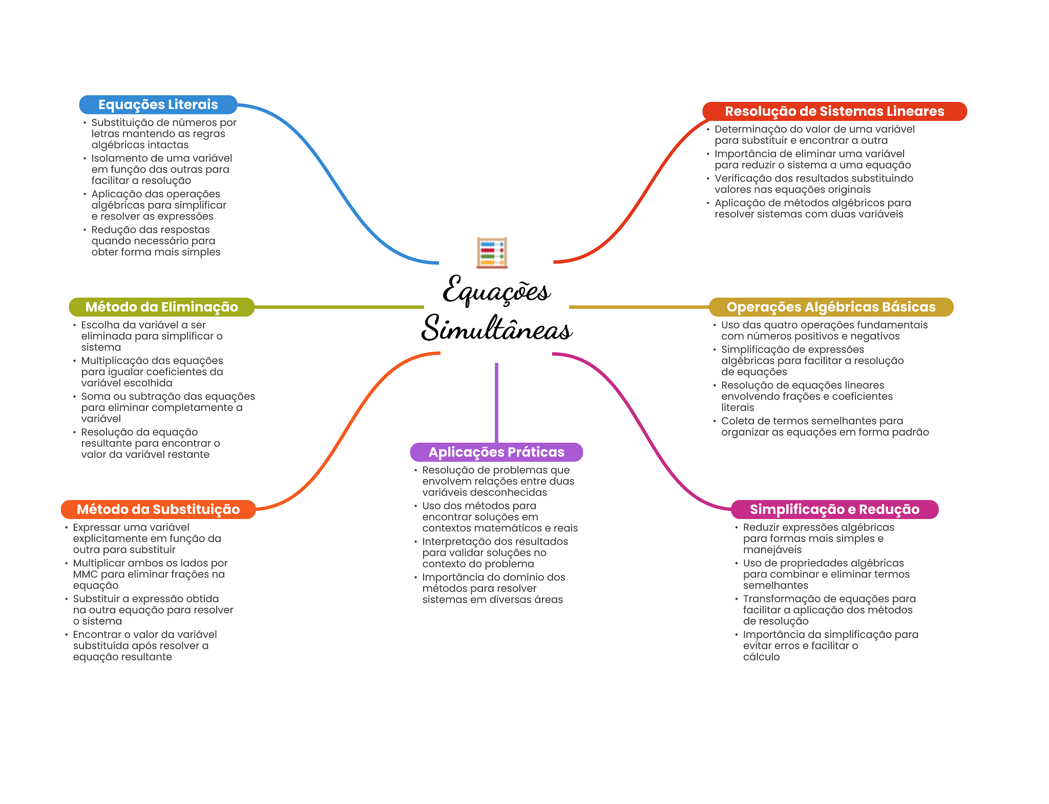 Equações Literais Resolução de Sistemas Lineares Substituição de números por letras mantendo as regras Determinação do valor de uma variável algébricas intactas para substituir e encontrar a outra Isolamento de uma variável Importância de eliminar uma variável em função das outras para para reduzir sistema a uma equação facilitar a resolução Verificação dos resultados substituindo Aplicação das operações valores nas equações originais algébricas para simplificar Aplicação de métodos algébricos para e resolver as expressões resolver sistemas com duas variáveis Redução das respostas quando necessário para obter forma mais simples Equações Método da Eliminação Operações Algébricas Básicas Escolha da variável a ser Simultâneas Uso das quatro operações fundamentais eliminada para simplificar com números positivos e negativos sistema Simplificação de expressões Multiplicação das equações algébricas para facilitar a resolução para igualar coeficientes da de equações variável escolhida Resolução de equações lineares Soma ou subtração das equações envolvendo frações e coeficientes para eliminar completamente a literais variável Coleta de termos semelhantes para Resolução da equação organizar as equações em forma padrão resultante para encontrar valor da variável restante Aplicações Práticas Resolução de problemas que envolvem relações entre duas variáveis desconhecidas Método da Substituição Uso dos métodos para Simplificação e Redução encontrar soluções em Expressar uma variável contextos matemáticos e reais Reduzir expressões algébricas explicitamente em função da Interpretação dos resultados para formas mais simples e outra para substituir para validar soluções no manejáveis Multiplicar ambos lados por contexto do problema Uso de propriedades algébricas MMC para eliminar frações na Importância do domínio dos para combinar e eliminar termos equação métodos para resolver semelhantes Substituir a expressão obtida sistemas em diversas áreas Transformação de equações para na outra equação para resolver facilitar a aplicação dos métodos sistema de resolução Encontrar valor da variável Importância da simplificação para substituída após resolver a evitar erros e facilitar o equação resultante cálculo