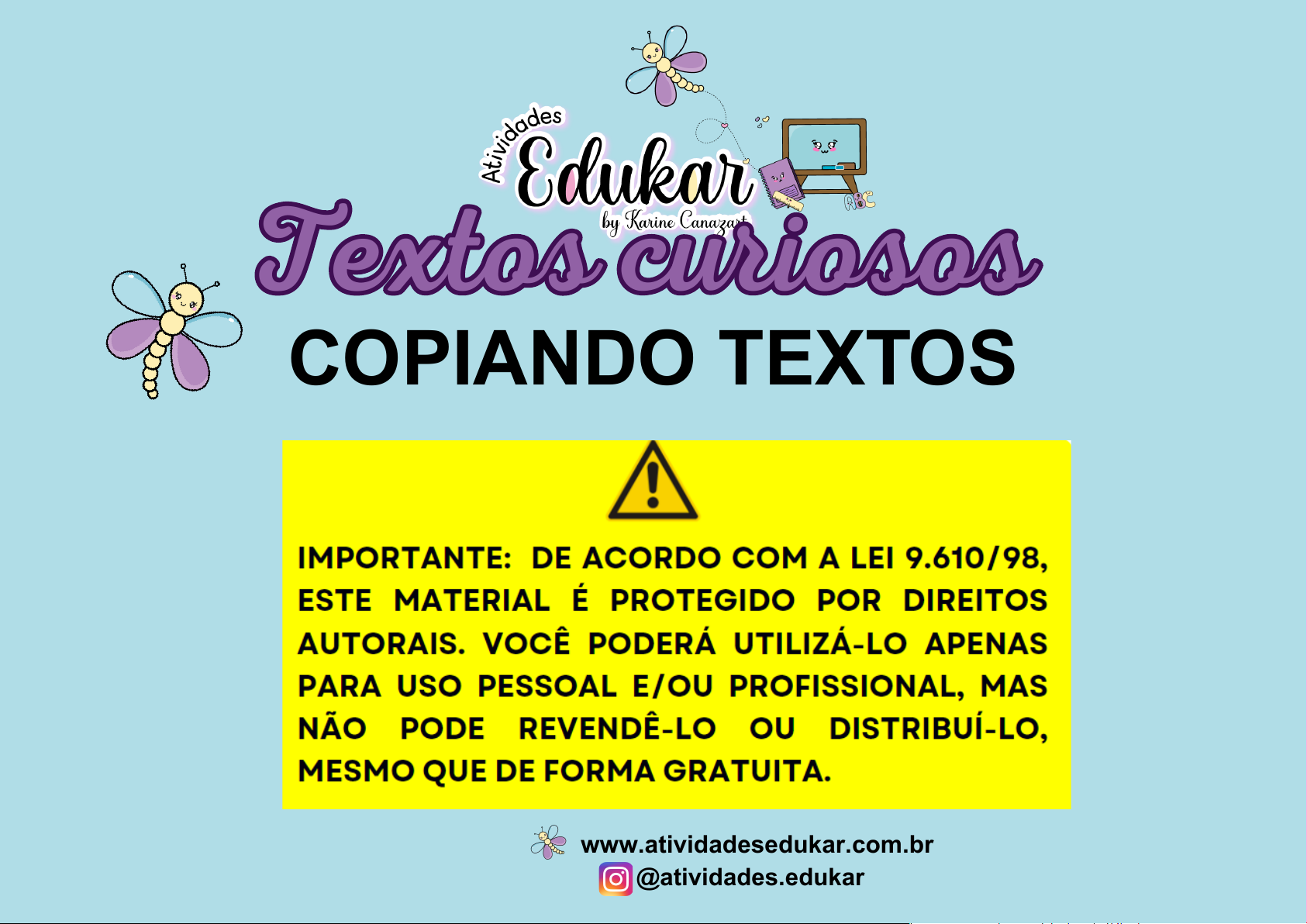 www.atividadesedukar.com.br @atividades.edukar Textos curiosos Textos curiosos COPIANDO TEXTOS Clique aqui Clique aqui LOJALOJA INSTAGRAMINSTAGRAM @atividades.edukar www.atividadesedukar.com.br Utilizou as atividades, fotografou ou filmou? Poste e nos marque no instagram @atividades.edukar Vamos amar ver e compartilhar! Utilizou as atividades, fotografou ou filmou? Poste e nos marque no instagram @atividades.edukar Vamos amar ver e compartilhar! https://atividadesedukar.com.br/ https://www.instagram.com/atividades.edukar/ https://atividadesedukar.com.br/ @ at iv id ad es .e du ka r TEXTOS CURIOSOSTEXTOS CURIOSOS AS BORBOLETAS ADORAM O NÉCTAR DAS FLORES, QUE É BEM DOCINHO. ELAS USAM UMA PARTE COMPRIDA DA BOCA CHAMADA TROMBA PARA BEBER. ALGUMAS TAMBÉM GOSTAM DE FRUTAS MADURAS E MOLHADINHAS. AS BORBOLETAS SÃO LINDAS E MUITO IMPORTANTES PARA A NATUREZA! ________________________________________________________________ ________________________________________________________________ ________________________________________________________________ ________________________________________________________________ ________________________________________________________________ ________________________________________________________________ ________________________________________________________________ ________________________________________________________________ ________________________________________________________________ ________________________________________________________________ ________________________________________________________________ ________________________________________________________________ ________________________________________________________________ ________________________________________________________________ COPIE O TEXTO MANTENDO SUAS CARACTERÍSTICAS. VOLTE PARA O TEXTO SEMPRE QUE TIVER DÚVIDAS SOBRE O ESPAÇAMENTO ENTRE AS PALAVRAS, A ESCRITA DAS PALAVRAS E A PONTUAÇÃO. O QUE AS BORBOLETAS COMEM?O QUE AS BORBOLETAS COMEM? __ __ __ __ __ __ __ __ __ __ __ __ __ __ __ __ __ __ __ __ __ __ __ __ __ __ __ __ __ __ __ __ _ @ at iv id ad es .e du ka r @ at iv id ad es .e du ka r OS GATOS RONRONAM QUANDO ESTÃO FELIZES E TRANQUILOS. ESSE SOM É UMA FORMA DE MOSTRAR CARINHO E CONFIANÇA. ELES TAMBÉM RONRONAM QUANDO QUEREM ACONCHEGO OU ATENÇÃO. ALGUNS ATÉ RONRONAM PARA SE ACALMAR QUANDO ESTÃO DOENTES. O RONRONAR É O JEITINHO DOS GATOS DE DIZER: “EU ESTOU BEM!” ________________________________________________________________ ________________________________________________________________ ________________________________________________________________ ________________________________________________________________ ________________________________________________________________ ________________________________________________________________ ________________________________________________________________ ________________________________________________________________ ________________________________________________________________ ________________________________________________________________ ________________________________________________________________ ________________________________________________________________ ________________________________________________________________ ________________________________________________________________ COPIE O TEXTO MANTENDO SUAS CARACTERÍSTICAS. VOLTE PARA O TEXTO SEMPRE QUE TIVER DÚVIDAS SOBRE O ESPAÇAMENTO ENTRE AS PALAVRAS, A ESCRITA DAS PALAVRAS E A PONTUAÇÃO. POR QUE OS GATOS RONRONAM?POR QUE OS GATOS RONRONAM? __ __ __ __ __ __ __ __ __ __ __ __ __ __ __ __ __ __ __ __ __ __ __ __ __ __ __ __ __ __ __ __ _ @ at iv id ad es .e du ka r TEXTOS CURIOSOSTEXTOS CURIOSOS @ at iv id ad es .e du ka r TEXTOS CURIOSOSTEXTOS CURIOSOS ________________________________________________________________ ________________________________________________________________ ________________________________________________________________ ________________________________________________________________ ________________________________________________________________ ________________________________________________________________ ________________________________________________________________ ________________________________________________________________ ________________________________________________________________ ________________________________________________________________ ________________________________________________________________ ________________________________________________________________ ________________________________________________________________ ________________________________________________________________ COPIE O TEXTO MANTENDO SUAS CARACTERÍSTICAS. VOLTE PARA O TEXTO SEMPRE QUE TIVER DÚVIDAS SOBRE O ESPAÇAMENTO ENTRE AS PALAVRAS, A ESCRITA DAS PALAVRAS E A PONTUAÇÃO. PEIXE PISCA?PEIXE PISCA? __ __ __ __ __ __ __ __ __ __ __ __ __ __ __ __ __ __ __ __ __ __ __ __ __ __ __ __ __ __ __ __ _ @ at iv id ad es .e du ka r OS PEIXES NÃO PISCAM, SABIA? ELES NÃO TÊM PÁLPEBRAS E NEM PRECISAM, PORQUE VIVEM DENTRO DA ÁGUA. SEUS OLHOS JÁ FICAM MOLHADOS O TEMPO TODO! POR ISSO, OS PEIXES ENXERGAM MUITO BEM MESMO SEM PISCAR. A NATUREZA PENSOU EM TUDO PARA ELES VIVEREM FELIZES NO MAR! @ at iv id ad es .e du ka r AS GIRAFAS SÃO OS ANIMAIS MAIS ALTOS DO MUNDO! POR TEREM O PESCOÇO COMPRIDO, PRECISAM DE UM CORAÇÃO MUITO FORTE. O CORAÇÃO DELAS É DO TAMANHO DE UMA BOLA DE FUTEBOL! ELE BOMBEIA SANGUE ATÉ O ALTO DA CABEÇA COM MUITA FORÇA. COPIE O TEXTO MANTENDO SUAS CARACTERÍSTICAS. VOLTE PARA O TEXTO SEMPRE QUE TIVER DÚVIDAS SOBRE O ESPAÇAMENTO ENTRE AS PALAVRAS, A ESCRITA DAS PALAVRAS E A PONTUAÇÃO. O GRANDE CORAÇÃO DA GIRAFAO GRANDE CORAÇÃO DA GIRAFA __ __ __ __ __ __ __ __ __ __ __ __ __ __ __ __ __ __ __ __ __ __ __ __ __ __ __ __ __ __ __ __ _ @ at iv id ad es .e du ka r ________________________________________________________________ ___________________________