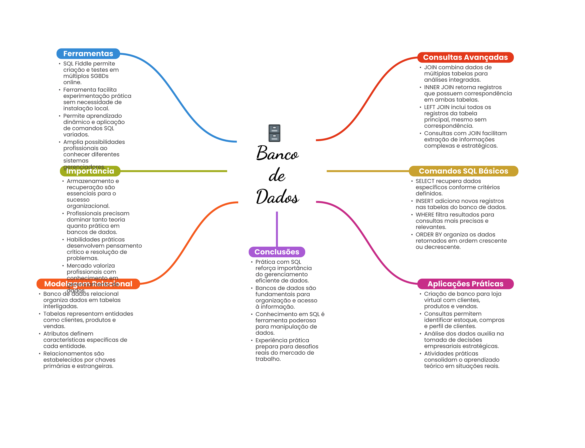 Ferramentas Consultas Avançadas SQL Fiddle permite JOIN combina dados de criação e testes em múltiplos SGBDs múltiplas tabelas para online. análises integradas. Ferramenta facilita INNER JOIN retorna registros experimentação prática que possuem correspondência sem necessidade de em ambas tabelas. instalação local. LEFT JOIN inclui todos Permite aprendizado registros da tabela dinâmico e aplicação principal, mesmo sem de comandos SQL correspondência. variados. Consultas com JOIN facilitam Amplia possibilidades extração de informações profissionais ao complexas e estratégicas. conhecer diferentes Banco sistemas gerenciadores Importância de Comandos SQL Básicos e SELECT recupera dados recuperação são específicos conforme critérios essenciais para sucesso Dados definidos. INSERT adiciona novos registros organizacional. nas tabelas do banco de dados. Profissionais precisam WHERE filtra resultados para dominar tanto teoria consultas mais precisas e quanto prática em relevantes. bancos de dados. ORDER BY organiza dados Habilidades práticas retornados em ordem crescente desenvolvem pensamento ou decrescente. crítico e resolução de Conclusões problemas. Prática com SQL Mercado valoriza reforça importância profissionais com do gerenciamento conhecimento em eficiente de dados. Bancos de dados são Aplicações Práticas Banco de dados relacional fundamentais para Criação de banco para loja organiza dados em tabelas organização e acesso virtual com clientes, interligadas. à informação. produtos e vendas. Tabelas representam entidades Conhecimento em SQL é Consultas permitem como clientes, produtos e ferramenta poderosa identificar estoque, compras vendas. para manipulação de e perfil de clientes. Atributos definem dados. Análise dos dados auxilia na características específicas de Experiência prática tomada de decisões cada entidade. prepara para desafios empresariais estratégicas. Relacionamentos são reais do mercado de Atividades práticas estabelecidos por chaves trabalho. consolidam O aprendizado primárias e estrangeiras. teórico em situações reais.