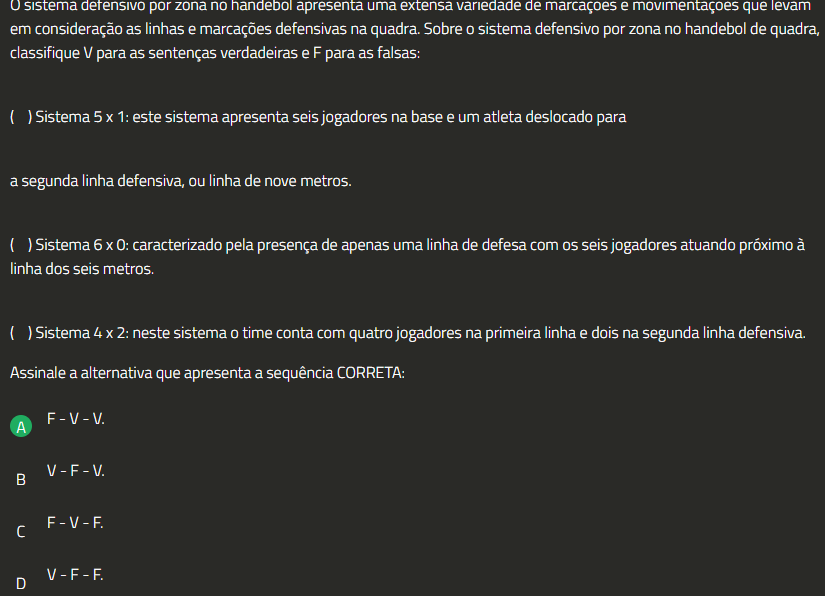 sistema defensivo por zona no handebol apresenta uma extensa variedade de e movimentações que levam em consideração as linhas e marcações defensivas na quadra. Sobre 0 sistema defensivo por zona no handebol de quadra, classifique V para as sentenças verdadeiras eF para as falsas: Sistema 5 X 1: este sistema apresenta seis jogadores na base e um atleta deslocado para a segunda linha defensiva, ou linha de nove metros. Sistema 6 X caracterizado pela presença de apenas uma linha de defesa com seis jogadores atuando próximo à linha dos seis metros. Sistema 4 X 2: neste sistema 0 time conta com quatro jogadores na primeira linha e dois na segunda linha defensiva. Assinale a alternativa que apresenta a sequência CORRETA: A B V-F-F. D