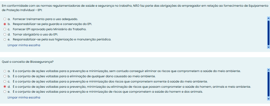 Em conformidade com as normas regulamentadoras de saúde e segurança no trabalho, NÃO faz parte das obrigações do empregador em relação fornecimento de Equipamento de Proteção Individual - EPI: Fornecer treinamento para uso adequado. b. Responsabilizar-se pela guarda e conservação do EPI. Fornecer EPI aprovado pelo Ministério do d. Tornar obrigatório uso do e. Responsabilizar-se pela sua higienização e manutenção periódica. Limpar minha escolha Qual conceito de Biossegurança? a. conjunto de ações voltadas para a prevenção e minimização, sem contudo conseguir eliminar os riscos que comprometem a saúde do meio ambiente. b. E conjunto de ações voltadas para a eliminação de qualquer dano causado ao meio ambiente. E conjunto de ações voltadas para a prevenção minimização dos riscos que comprometem somente à saúde do meio ambiente. d. E conjunto de ações voltadas para a prevenção, minimização ou eliminação de riscos que possam comprometer a saúde do homem, animais e meio ambiente. e. E conjunto de ações voltadas para a prevenção e minimização de riscos que comprometem a saúde do homem e dos animais. Limpar minha escolha