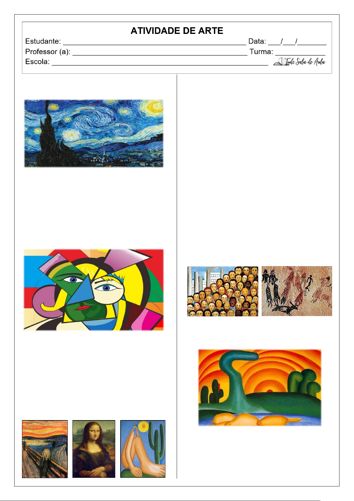 1. Observe a obra Noite Estrelada de Vincent van Gogh. O artista usou linhas curvas e cores vibrantes para representar o céu. O que essa forma de pintar transmite para você? ________________________________________________ ________________________________________________ 2. Pablo Picasso é um autor conhecido pelo Cubismo, onde as formas são montadas de jeitos diferentes. Ao olhar um retrato cubista, podemos ver o rosto de frente e de lado ao mesmo tempo. Isso exercita nossa a) visão perfeita da realidade. b) memória sobre cores primárias. c) capacidade de ver por vários ângulos. d) habilidade de desenhar linhas retas com régua. 3. Observe as imagens a seguir. (1) (2) (3) Associe as características abaixo às imagens apresentadas. ( ) Representa o movimento modernista brasileiro, valorizando elementos da nossa terra e figuras com formas exageradas. ( ) Expressa sentimentos intensos de angústia e desespero através de cores fortes e linhas onduladas. ( ) É um dos retratos mais famosos do Renascimento, conhecido pelo sorriso enigmático e pelo uso da técnica sfumato. 4. Leia o trecho abaixo. “As artes visuais tradicionais estão ligadas a técnicas mais antigas e materiais clássicos, desenvolvidos ao longo da história da arte. Já as artes visuais contemporâneas surgiram com mais força a partir do século XX e continuam em constante transformação.” Qual das imagens a seguir representa uma arte visual tradicional? ( ) ( ) 5. Observe uma obra de Tarsila do Amaral. Quais cores mais aparecem na pintura? a) Somente preto e branco. b) Cores vivas e variadas. c) Apenas tons escuros. d) Somente azul. https://www.tudosaladeaula.com/ https://www.tudosaladeaula.com/ https://www.tudosaladeaula.com/ https://www.tudosaladeaula.com/ https://www.tudosaladeaula.com/ https://www.tudosaladeaula.com/ https://www.tudosaladeaula.com/ https://www.tudosaladeaula.com/ https://www.tudosaladeaula.com/ 6. Leia o trecho abaixo. A arte indígena é produzida pelos povos originários e está ligada às tradições, rituais e à vida em comunidade. A arte popular é aquela feita pelo povo, geralmente por artistas autodidatas, refletindo costumes, festas, crenças e o cotidiano das regiões. A arte urbana surge nas cidades e utiliza espaços públicos como muros, ruas e praças. Identifique se as imagens apresentadas abaixo representam arte indígena, popular ou urbana. ________________________________________________ ________________________________________________ ________________________________________________ 7. Observe a imagem. A xilogravura, muito usada na literatura de cordel, é considerada um exemplo de a) arte digital. b) arte popular. c) arte futurista. d) arte fotográfica. 8. Observe as imagens a seguir. https://creacionhibrida.net/obras-importantes-del-arte-digital/ https://de.pinterest.com/pin/302444931224640052/ Escreva uma diferença entre elas. ________________________________________________ ________________________________________________ ________________________________________________ ________________________________________________ ________________________________________________ 9. Cite o nome de um artista brasileiro ou internacional que você estudou e descreva algo marcante em sua obra. ________________________________________________ ________________________________________________ ________________________________________________ ________________________________________________ 10. Escolha um dos artistas citados nesta atividade e crie uma releitura de uma cena da escola ou da cidade, usando o estilo desse artista. Tudo Sala de Aula https://www.tudosaladeaula.com/ https://www.tudosaladeaula.com/ https://www.tudosaladeaula.com/ https://www.tudosaladeaula.com/ https://www.tudosaladeaula.com/ https://www.tudosaladeaula.com/ https://www.tudosaladeaula.com/