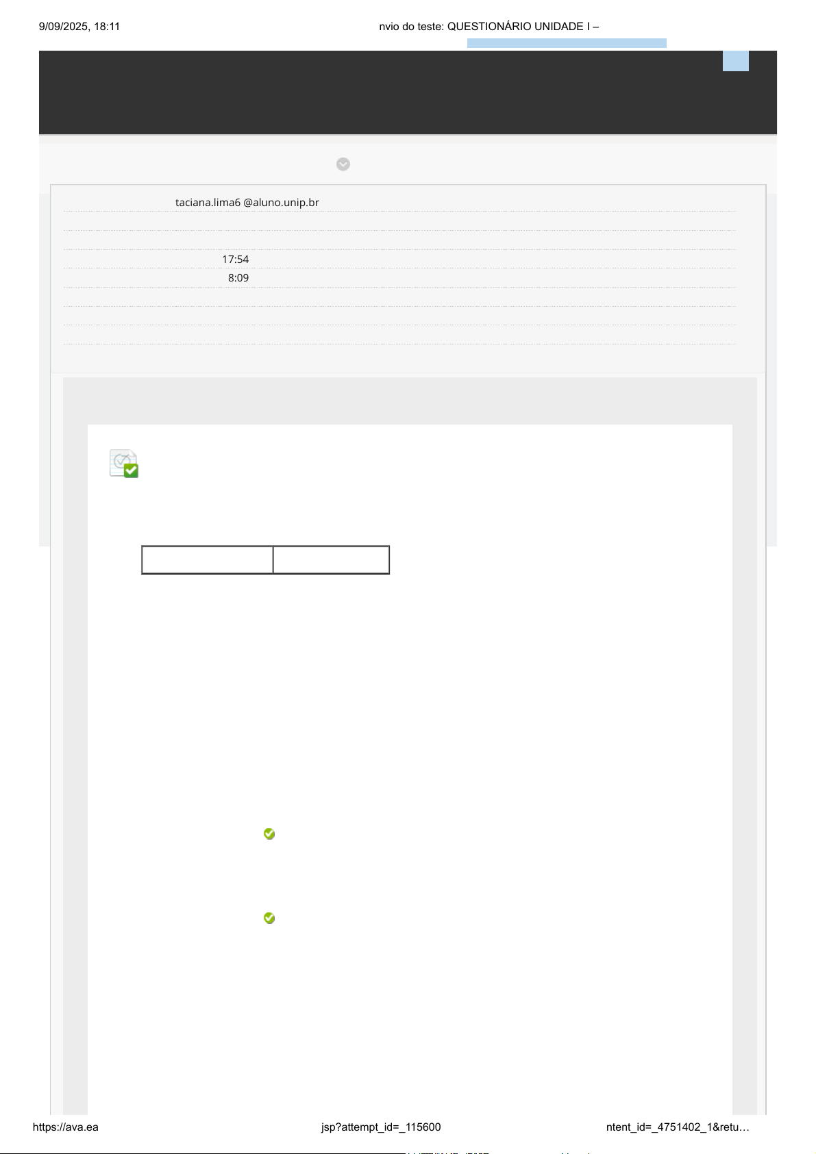 Revisar envio do teste: QUESTIONÁRIO UNIDADE IPEDAGOGIA INTEGRADA 5547-30_54202_R_E1_20252 CONTEÚDO Usuário taciana.lima6 @aluno.unip.br Curso PEDAGOGIA INTEGRADA Teste QUESTIONÁRIO UNIDADE I Iniciado 19/09/25 17:54 Enviado 19/09/25 18:09 Status Completada Resultado da tentativa 5 em 5 pontos Tempo decorrido 14 minutos Resultados exibidos Todas as respostas, Respostas enviadas, Respostas corretas, Comentários, Perguntas respondidas incorretamente Pergunta 1 Resposta Selecionada: c. Respostas: a. b. c. d. e. Comentário da resposta: Para analisar alguns dispositivos da LDB 9.394/ 96 que tratam da formação e da carreira dos profissionais na sociedade brasileira, Brzezinski (2001) esclarece-nos que as sociedades modernas pressupõem, no jogo das interações, que nelas se apresentam a existência de dois mundos: o oficial e o real. Relacione as asserções a seguir ao mundo oficial ou ao mundo real. A - Mundo oficial B - Mundo real I- Construído na luta dos educadores, travada desde 1980 para modificar as práticas autoritárias brasileiras de formar profissionais da educação e de determinar critérios para a definição da carreira do magistério. II- Na sociedade brasileira tem sido atrelado ao capital, ancorado nos princípios e políticas neoliberais do governo federal. III- Não dá legitimidade ao Estado Democrático, articulador dos interesses coletivos e provedor da justiça e da equidade sociais. IV- Reivindica a universalização e gratuidade da educação básica, ensino superior gratuito e valorização social e econômica do profissional da educação. Relacione os itens acima e assinale a alternativa correta. A- II e III; B- I e IV; A- I e II; B- III e IV; A- II e IV; B- I e III; A- II e III; B- I e IV; A- I e III; B- II e IV; A- III e IV; B- I e II. Resposta correta: c) A- II e III; B- I e IV. Comentário Leia excerto de Brzezinski (2001, p. 3 e 4) – ANPEd (Associação Nacional de Pós-Graduação e Pesquisa em Educação – Contribuições) na Audiência Pública Nacional sobre “Diretrizes para a Formação Inicial de Professores da Educação Básica em curso de Nível Superior”, realizada no CONTEÚDOS ACADÊMICOS BIBLIOTECAS MURAL DO ALUNO TUTORIAIS LABORATÓRIOSUNIP EAD 0,5 em 0,5 pontos 19/09/2025, 18:11 Revisar envio do teste: QUESTIONÁRIO UNIDADE I – ... https://ava.ead.unip.br/webapps/assessment/review/review.jsp?attempt_id=_115600591_1&course_id=_424432_1&content_id=_4751402_1&retu… 1/8 http://company.blackboard.com/ https://ava.ead.unip.br/webapps/blackboard/execute/courseMain?course_id=_424432_1 https://ava.ead.unip.br/webapps/blackboard/content/listContent.jsp?course_id=_424432_1&content_id=_4750814_1&mode=reset https://ava.ead.unip.br/webapps/portal/execute/tabs/tabAction?tab_tab_group_id=_25_1 https://ava.ead.unip.br/webapps/portal/execute/tabs/tabAction?tab_tab_group_id=_27_1 https://ava.ead.unip.br/webapps/portal/execute/tabs/tabAction?tab_tab_group_id=_47_1 https://ava.ead.unip.br/webapps/portal/execute/tabs/tabAction?tab_tab_group_id=_29_1 https://ava.ead.unip.br/webapps/portal/execute/tabs/tabAction?tab_tab_group_id=_64_1 https://ava.ead.unip.br/webapps/portal/execute/tabs/tabAction?tab_tab_group_id=_10_1 https://ava.ead.unip.br/webapps/login/?action=logout XXXXXXXXXXXXXXXXXXXXXXXXXXX Conselho Nacional de Educação – CNE, Brasília, 23/04/2001: “De um lado, o mundo do sistema (oficial) que, aportado nas políticas de princípios neoliberais, saúda a globalização excludente como sinal inquestionável de progresso e de pós-modernidade, reafirmando parcerias com organismos internacionais. De outro, o mundo vivido, construído na luta travada desde 1980 pelo Movimento Nacional de Educadores, que propõe a adoção de uma política global de formação e de profissionalização docente. (Nele), a identidade do professor como profissional do ensino, tal como foi definida, constrói-se como parte de um projeto de sociedade que se fundamenta na concepção histórico-social e tem como paradigma educacional as relações entre cultura, sociedade e educação. Esse paradigma leva em conta as transformações sociais, das forças produtivas e do mundo do trabalho, transformações que, dialeticamente, provocam mudanças no papel social do professor. Diante da adoção desse paradigma, com o qual se busca a superação das desigualdades educacionais, a formação do profissional da educação para atuar na educação básica é entendida como um processo marcado pela complexidade do conhecimento, pela crítica, pela reflexão-ação e pela criatividade. O mundo oficial, por sua vez, pela dependência para com os organismos estrangeiros, financiadores das políticas educacionais brasileiras, submete-se ao modelo de formação de profissionais da educação, implantado em outros países. Esse modelo institucionaliza preferencialmente a formação fora da Universidade e preocupa-se muito mais em conceder uma certificação do que conferir uma boa qualificação aos futuros professores do sistema educacional e aos leigos que nele atuam”. Pergunta 2 Resposta Selecionada: a. Respostas: a. b. c. d. e. Comentário da resposta: Alguns pesquisadores descrevem e discutem o que chamam de “crise” na Educação. As alternativas abaixo encontram-se de acordo com tal afirmação e discussão dos estudiosos, exceto a alternativa: É um tema novo nos debates da Academia, que busca trazer à luz propostas de melhores ações de enfrentamento de tais questões. É um tema novo nos debates da Academia, que busca trazer à luz propostas de melhores ações de enfrentamento de tais questões. Já se falava em crise desde o final do século XIX, quando a instituição escolar se consolidava na Europa, a despeito de ainda não se encontrar universalizada. Refere-se a questões que abrangem, entre outras, a desvalorização do campo de conhecimento da Pedagogia e o baixo nível de formação docente. Nos Estados Unidos, no momento em que se iniciava o proc