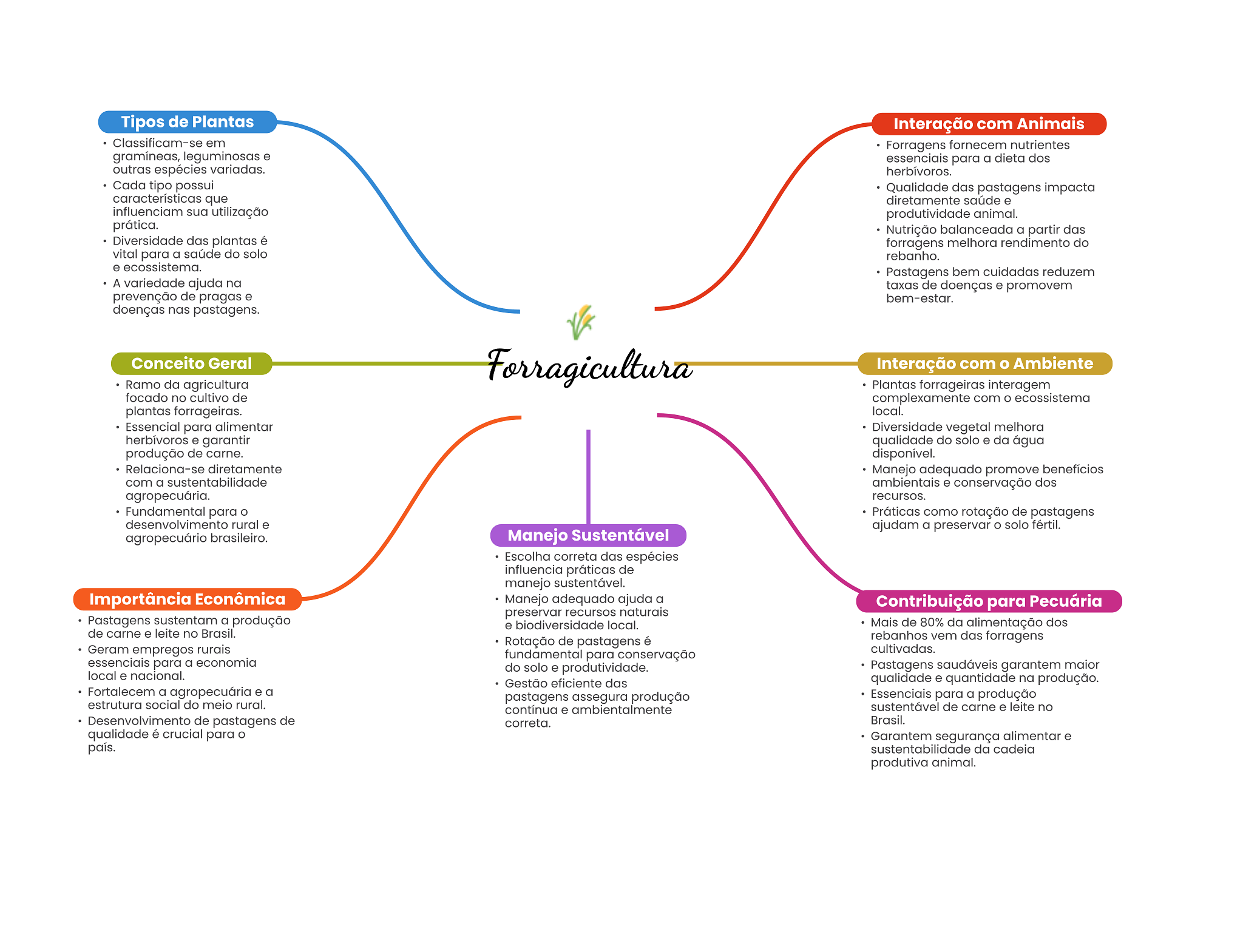 Tipos de Plantas Interação com Animais Classificam-se em Forragens fornecem nutrientes gramíneas, leguminosas e essenciais para a dieta dos outras espécies variadas. herbívoros. Cada tipo possui Qualidade das pastagens impacta características que diretamente saúde e influenciam sua utilização produtividade animal. prática. Nutrição balanceada a partir das Diversidade das plantas é forragens melhora rendimento do vital para a saúde do solo rebanho. e ecossistema. Pastagens bem cuidadas reduzem A variedade ajuda na taxas de doenças e promovem prevenção de pragas e bem-estar. doenças nas pastagens. Conceito Geral Forragicultura Interação com Ambiente Ramo da agricultura Plantas forrageiras interagem focado no cultivo de complexamente com ecossistema plantas forrageiras. local. Essencial para alimentar Diversidade vegetal melhora herbívoros e garantir qualidade do solo e da água produção de carne. disponível. Relaciona-se diretamente Manejo adequado promove benefícios com a sustentabilidade ambientais e conservação dos agropecuária. recursos. Fundamental para O Práticas como rotação de pastagens desenvolvimento rural e ajudam a preservar solo fértil. agropecuário brasileiro. Manejo Sustentável Escolha correta das espécies influencia práticas de manejo sustentável. Importância Econômica Manejo adequado ajuda a Contribuição para Pecuária preservar recursos naturais Pastagens sustentam a produção e biodiversidade local. Mais de 80% da alimentação dos de carne e leite no Brasil. Rotação de pastagens é rebanhos vem das forragens Geram empregos rurais cultivadas. fundamental para conservação essenciais para a economia do solo e produtividade. Pastagens saudáveis garantem maior local e nacional. Gestão eficiente das qualidade e quantidade na produção. Fortalecem a agropecuária e a pastagens assegura produção Essenciais para a produção estrutura social do meio rural. contínua e ambientalmente sustentável de carne e leite no Desenvolvimento de pastagens de correta. Brasil. qualidade é crucial para Garantem segurança alimentar e país. sustentabilidade da cadeia produtiva animal.